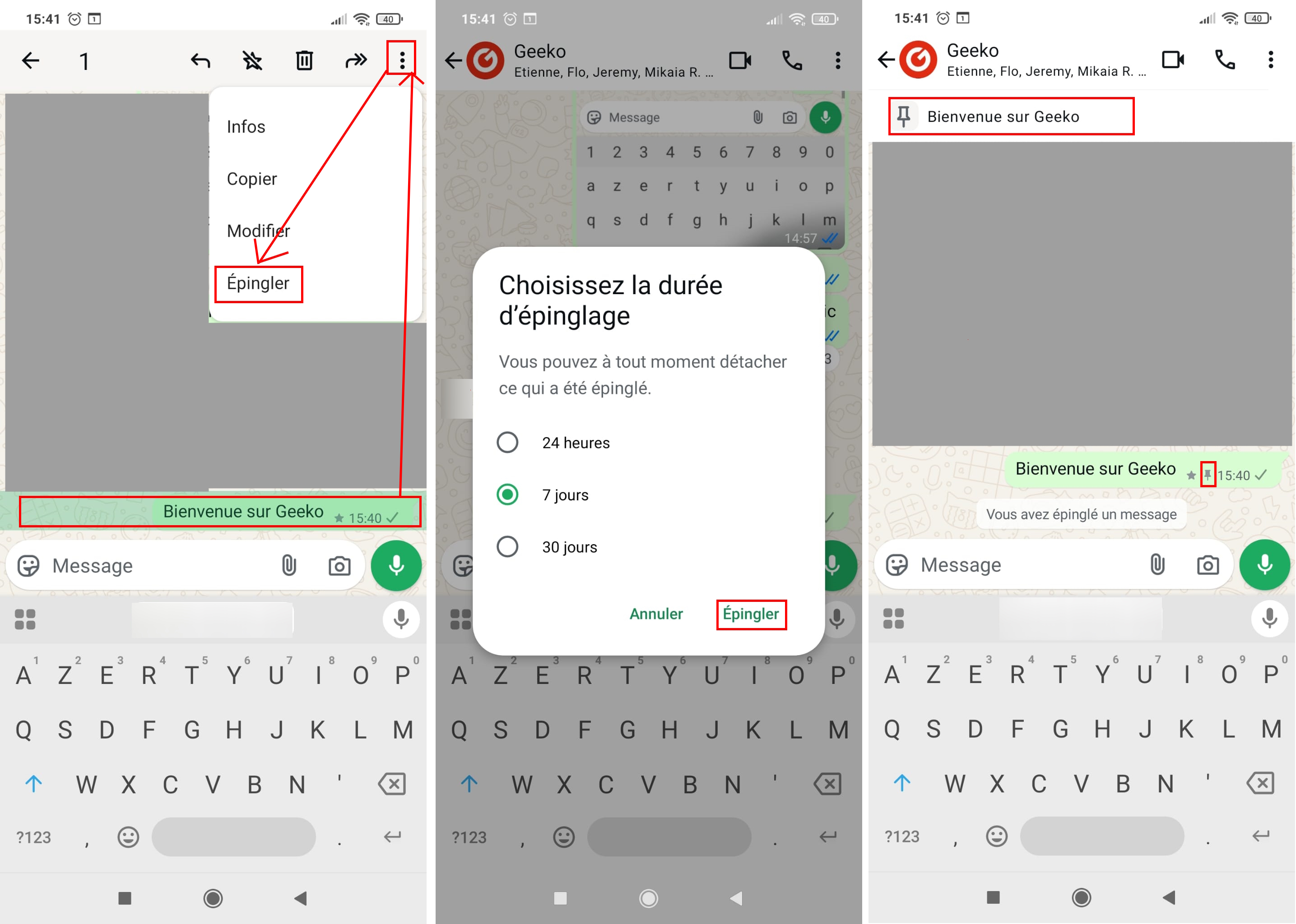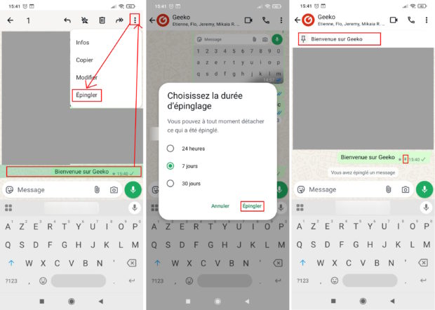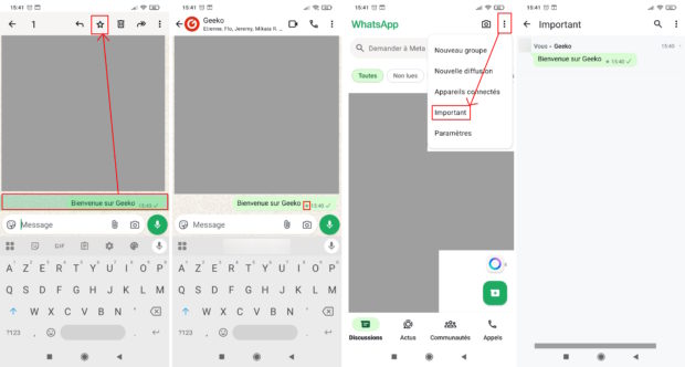 Même si WhatsApp est très populaire, l’application de messagerie instantanée de Meta regorge de fonctionnalités. À tel point que certaines passent inaperçues ou sont cachées. Voici 10 fonctionnalités secrètes que vous devez absolument connaître. Mettre en forme le texte de son message Lorsqu’on écrit un message sur WhatsApp, on ne pense pas forcément à mettre en forme ce dernier. Pourtant, il existe quelques raccourcis pour créer simplement une liste, mettre une partie du texte en gras, italique ou barré, etc. Ainsi, pour mettre en gras, vous devez entourer le texte d’astérisques. Par exemple, écrire *Geeko* transformera le texte en Geeko. Si vous souhaitez le mettre en italique, il faut remplacer les “*” par “_”. Pour un message barré, on utilise “~”. Si vous démarrez votre message par un “>”, celui-ci s’affichera comme une citation. Un tiret permet de démarrer une liste avec des puces rondes noires, tandis qu’un chiffre suivi d’un point (par exemple : “1.”) permet de démarrer une liste numérotée. La liste complète est accessible sur la page d’aide de WhatsApp. Raccourcis de mise en forme du texte sur WhatsApp // Crédits – WhatsApp Laisser un message vidéo Outre les messages écrits, WhatsApp permet de laisser très facilement un message vocal dans une discussion. Le bouton dédié étant facilement identifiable, la fonctionnalité est très accessible. Saviez-vous qu’il est également possible de laisser un message vidéo ? Pour le coup, la fonction est cachée puisqu’il faut appuyer quelques secondes sur le bouton de l’appareil photo. Une fois ceci fait, la caméra s’enclenche et vous pouvez enregistrer votre message vidéo à partager. Enregistrement d’un message vidéo (version Android) // Crédits : Geeko Verrouiller l’accès à l’application avec la biométrie Pour des raisons de confidentialité, vous avez peut-être envie de vous assurer que personne ne puisse accéder à vos conversations. Plutôt que de capitaliser sur le verrouillage de votre smartphone, vous pouvez également activer le verrouillage de l’application. Ainsi, sur iOS vous devrez utiliser Face ID ou Touch ID pour débloquer l’accès. Sur Android, ce sera en utilisant vos données biométriques, dont votre visage ou votre empreinte digitale. Dans tous les cas, il faut vous rendre dans les paramètres de l’application, avant de tapoter sur “Confidentialité”. Ensuite, vous devez scroller un peu pour accéder au paramètre “Verrouillage de l’application”. Il ne reste alors plus qu’à activer l’option. Petit plus, vous pouvez déterminer si le verrouillage se fait de manière instantanée ou après un certain délai, comme au bout d’1 minute ou de 30 minutes. Activer le verrouillage de l’application WhatsApp (version Android) // Crédits – Geeko Verrouiller l’accès à une conversation Sans aller jusqu’au verrouillage de l’application, vous pouvez opter pour un verrouillage plus ciblé en évitant de laisser quiconque accéder à une conversation spécifique. Pour cela, ouvrez la discussion concernée et cliquez sur son nom (ou le nom du contact si c’est une conversation individuelle). Ensuite, appuyez sur le curseur à côté de “Verrouiller la discussion” et cliquez sur “Continuer”. Votre conversation sera séparée des autres et sera inaccessible sans votre système d’authentification. Étapes pour verrouiller une conversation WhatsApp (version Android) // Crédits – Geeko Retrouver facilement un message important Entre les multiples conversations auxquelles on participe et les divers messages qui s’accumulent en leur sein, on peut rapidement perdre la trace d’un message important. Pour éviter cela, au-delà de l’outil de recherche qui peut demander du temps, surtout si le mot-clé utilisé est assez courant, il existe deux solutions. La première, c’est tout simplement la possibilité d’épingler le message. Pour cela, sur l’application mobile, il suffit de sélectionner le message en question, de cliquer sur le menu, puis sur “Épingler”. Via l’application PC, un clic droit sur le message en question donne accès à la fonction. Vous pouvez ensuite déterminer la durée pendant laquelle celui-ci sera épinglé (24 heures, 7 jours ou 30 jours). Une fois ceci fait, un bloc fixe sera ajouté sous le nom de la discussion à côté d’une icône en forme de punaise. L’icône se retrouve également au sein du message épinglé dans la discussion. Épingler un message dans une conversation WhatsApp (version Android) // Crédits – Geeko La deuxième, c’est la possibilité de définir le message comme “important”. Sur l’application PC, il faut faire clic droit sur ledit message puis cliquer sur “important”. Sur smartphone, il faut sélectionner le message et tapoter sur l’étoile en haut de l’écran. Ensuite, vous pouvez accéder à tout moment à vos messages classés importants via le menu sur l’accueil de l’application. Dans la discussion, les messages importants sont identifiables grâce à une petite étoile. Définir un message “Important” sur WhatsApp (version Android) // Crédits – Geeko Utiliser l’application comme un pense-bête Une idée vous traverse l’esprit, vous souhaitez faire une liste de course rapide, etc., WhatsApp peut être une bonne alternative. En effet, depuis 2022, il est possible de s’envoyer des messages à soi-même. Non seulement cela est très pratique pour utiliser l’application comme un pense-bête mais, en plus, le système permet de transférer facilement des photos et vidéos d’un appareil à un autre. Par exemple, vous pouvez vous connecter à WhatsApp sur votre smartphone et vous envoyer des médias à vous-même. Ensuite, vous lancez l’application sur votre PC et vous vous connectez à votre compte. Il ne vous reste plus qu’à cliquer sur la conversation et à télécharger les éléments. Crédits