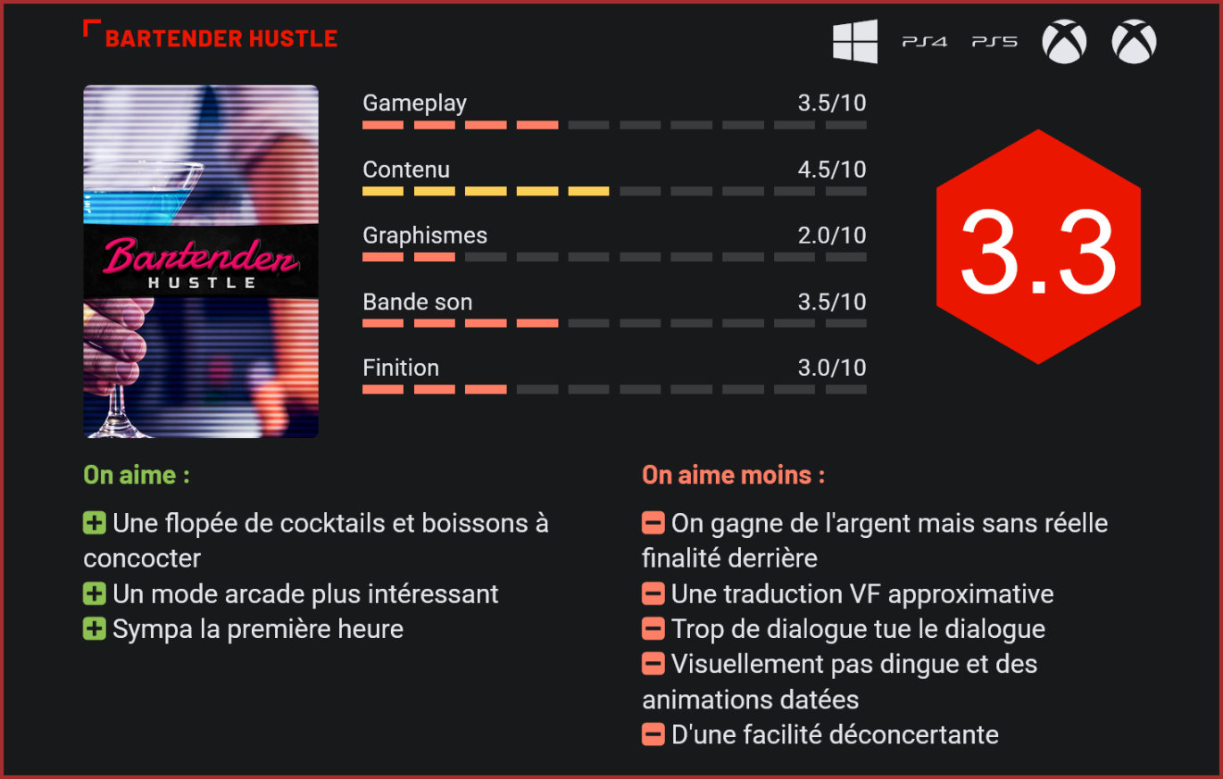 Bartender Hustle entend vous plonger dans l’univers des cocktails et des clients imbibés. Malheureusement, la gueule de bois arrive bien plus vite que prévu. Departure Interactive, c’est un petit studio canadien spécialisé dans les jeux Simulator. Après Metro Sim Hustle, Flight Attendant Simulator et Denizen, les développeurs nous plongent dans l’univers des Piña Colada et autres Mojito avec Bartender Hustle. Un jeu qui nous permet de vivre au rythme des verres qui trinquent et des rondelles de citron finement coupées, tout en servant des bières et verres de vin à des clients toujours plus insatisfaits. Le titre nous propose de nous essayer à plusieurs modes de jeu différents. On a ainsi accès à un mode histoire, un mode arcade, un mode bac à sable et un mode sans fin. Dans les quatre, vous l’aurez compris, l’objectif sera de servir tout un tas de cocktails. Le mode histoire, on se retrouve dans la peau d’une jeune femme qui se lance dans le métier de barmaid. Celle-ci fait d’abord une soirée d’essai dans un bar miteux, où elle fait la rencontre de premiers personnages hauts en couleur et des premiers accessoires à utiliser pour ses mixtures. Les débuts s’annoncent prometteurs. La quantité de cocktails et boissons à réaliser est faramineuse. Proche de la centaine, les recettes proposées vont du Daiquiri au Manhattan en passant par le Negroni. On retrouve aussi des cocktails originaux, créés pour l’occasion, comme le Rocket Fuel ou le Cranberry Cookie. Le mode histoire ne nous impose pas de limite de temps pour servir les cocktails. Les clients se présentent à nous, nous réclament un verre ou bien souvent deux que l’on doit leur servir. L’erreur est permise, il faut alors recommencer le verre, mais ces erreurs entraînent des pertes financières qui se répercutent sur votre paie. Et si vous ne servez pas un client, c’est kif-kif. Celui-ci attendra bêtement, assis au comptoir, sans jamais vous interpeller. Vous le servez ensuite, vous tournez la tête, il a disparu, vous vous retournez à nouveau et c’est un mec chelou qui vous dévisage. Tout au long que vous ferez vos cocktails, ils vous dévisageront comme ça … L’argent du mode histoire n’a pourtant pas très grand intérêt, si ce n’est pour décorer votre appartement, acheter de nouvelles pailles pour le bar ou vous habiller. Enfin, le paradoxe du jeu est le suivant : l’argent vous permet d’acheter des tenues, mais l’on vous incite à vous amener au travail la plus dévêtue possible pour amasser tous les pourboires qui se présenteront à vous. Ce n’est pas très finement amené et plutôt stéréotypé comme message, à savoir une femme peu vêtue qui sert des boissons à des hommes prêts à mettre un pourboire à condition de voir un bout de cuisse. D’autant que, vous le verrez plus tard, les stéréotypes ne s’arrêtent pas là. Les clients que vous rencontrerez, eux, sont d’un ennui abyssal. Dépourvus d’une parole qui aurait pu aider à l’immersion, ils vous racontent leur vie à partir de phrases maladroitement traduites en français, à rallonge et inintéressantes. Et les types de personnages ne sont guère inspirés : l’alcoolique, la fille de joie, le mec bizarre, les jumelles… Ajoutez à cela une durée de vie ultra courte (3 heures maximum) et un scénario fade à en mourir, et vous avez un mode histoire sans réel intérêt. Le second mode de jeu principal, l’arcade, est lui aussi un condensé des stéréotypes du monde des bars. Là où le mode histoire prône la serveuse peu vêtue, le mode arcade vous met dans la peau d’un propriétaire de bar, mais un homme cette fois. Le message n’est clairement pas adapté à l’époque, avec des stéréotypes en veux-tu en voilà. Ici, vous devez gérer les finances du bar, avec un temps imparti cette fois pour servir les clients et des pénalités en cas d’erreur, mais aurez également à gérer le bar en lui-même. Avec une déco à peine personnalisable, un billard et une piste de danse à installer, mais également un ATM et un juke-box qu’il convient d’entretenir et de réparer. Les clients n’ont d’ailleurs semble-t-il aucun savoir vivre, puisque dès le bar ouvert, les deux machines tombent vite en panne. Une centaine de boissons, dont des vins et bières, sont au programme. Les clients disposent désormais d’une jauge de patience, mais un client perdu est un client perdu. Vous ne disposez d’aucune réelle pénalité en cas de départ d’un client non-servi ou d’une erreur commise dans la création de la boisson. Enfin, les deux modes de jeu restants, à savoir le bac à sable et le mode sans fin, ne sont guère très passionnants non plus. Le mode bac à sable ne vous donne aucune pression, ni financière, ni temporelle, et vous permet d’expérimenter la totalité des cocktails présents dans le jeu. Le mode infini, pour sa part, relève d’un mix entre l’arcade et l’histoire, avec des pressions de temps et des verres à servir jusqu’à n’en plus pouvoir. Au final, on se rend compte que l’intérêt du jeu réside dans les deux premières heures qu’on le parcourt. On tourne très vite en rond, avec un contenu, certes, important au niveau des cocktails, mais fort maigre pour tous les à-côtés. Le passionné de cocktails y trouvera peut-être son compte, et encore. C’est répétitif à en mourir, le jeu n’a aucune vie et c’est d’une facilité déconcertante. Visuellement, aussi, c’est très léger. Il n’y a absolument aucune animation dans les clients et apparaissent et disparaissent quand vous leur tournez le dos. C’est bien simple, Bartender Hustle ressemble davantage à un jeu PlayStation 2, voire PSone, qu’à un titre PS5. C’est d’un vilain sans nom, tant d’un point de vue visuel que sonore… Conclusion Bartender Hustle se noie très vite dans ses propres faiblesses : gameplay répétitif, scénario creux, stéréotypes 