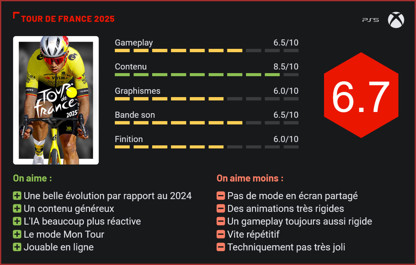 Chaque été, le Tour de France est l’événement incontournable pour tous les amateurs de cyclisme. Et si le Tour a déjà eu droit à de multiples adaptations en jeu vidéo, il faut bien avouer que la licence de Nacon a eu beaucoup de mal à séduire jusqu’à ce jour sur consoles. Tour de France 2025 entend changer la donne avec un nouveau moteur graphique et un tas de nouveautés. Mais ce passage à un moteur next-gen suffit-il à faire de Tour de France 2025 le champion incontesté des simulations sportives ? Cyanide Studio, basé à Paris, est un habitué des simulations sportives. Sur PC, le studio a depuis longtemps trouvé ses marques avec l’excellent Pro Cycling Manager. Mais sur consoles, le cyclisme a plus de mal à trouver sa place. Le jeu officiel du Tour de France est certes un jeu très décent, mais radicalement différent de son modèle sur PC, avec une approche beaucoup plus arcade. Fort de son expérience, le studio a décidé de frapper un grand coup en 2025 en adoptant l’Unreal Engine 5, une première pour la franchise. Le jeu recrée avec fidélité les 21 étapes de l’édition 2025 du Tour de France, du départ en Bretagne aux Champs-Élysées, en passant par des cols légendaires comme le Mont Ventoux et le Mur de Huy. Les joueurs incarnent un coureur au sein d’une équipe officielle, avec pour objectif ultime de décrocher le Maillot Jaune. Le mode solo propose une campagne immersive où l’on suit la progression d’un coureur fictif, mêlant rivalités sportives et moments narratifs légers, comme des échanges avec l’entraîneur ou des flashbacks sur l’entraînement. Bien que l’histoire reste secondaire, elle a le mérite d’être là. Le jeu tourne désormais sous l’UE 5, et il est beaucoup plus joli que son prédécesseur ! Pad en main, l’immersion est renforcée par des détails : les spectateurs qui s’écartent sur les routes étroites, les variations météorologiques (pluie, brouillard) et les paysages retravaillés. Par rapport à l’édition 2024, cette cuvée 2025 gagne un peu en réalisme. Le jeu se présente toujours comme un mix de jeu de course arcade et de simulation. On incarne un joueur et son occupe à travers des épreuves dans lesquelles il faudra gérer sa fatigue et faire preuve de tactique pour lancer ses attaques et contre-attaques. Tout est là : des sprints aux échappées et relais. La grande nouveauté de cet opus réside dans le système de ravitaillement repensé : les joueurs doivent choisir entre l’Energel pour une endurance prolongée ou le Turbogel pour des attaques explosives, mais au risque de s’épuiser rapidement. Il s’agit d’une nouveauté sympa mais pas non plus révolutionnaire. Cette cuvée 2025 intègre aussi plus d’options de customisation, pour plus ou moins de réalisme. Côté gameplay, il faut avouer que le jeu n’évolue pas énormément. Les bases étaient bonnes, mais légèrement nécrosées tout de même avec une conduite très rigide, des collisions pas réalistes pour deux sous et des résultats parfois très peu prévisibles. La grosse évolution vient de l’IA, qui a subi des améliorations notables. Elle réagit mieux aux tactiques (échappées, blocages dans le peloton), offrant ainsi une expérience plus réaliste. L’ennui, c’est que si le jeu a évolué dans sa plastique et dans son contenu, il reste très répétitif et ne donne pas un vrai sentiment de nouveauté en cours de partie. Oui les ennemis sont plus intelligents, mais il y a toujours un tas de choses qui ne vont pas, à commencer par les contrôles ultra-rigides et le manque général de sensations. Sur le plan technique, Tour de France 2025 marque un bond en avant grâce à l’Unreal Engine 5. Les paysages sont beaucoup plus travaillés que dans les précédents volets, avec des effets de lumière réalistes et des conditions météo dynamiques qui influencent la course (la pluie rend les pavés glissants, le vent de face ralentit le peloton). Cependant, les coureurs pâtissent d’animations rigides, et la physique des collisions reste perfectible, avec des chutes parfois absurdes. Ajoutez à cela des décors qui restent souvent assez vides, et vous comprendrez que si cette cuvée 2025 évolue dans la bonne direction, il reste beaucoup de travail pour se mettre à jour… Il en va de même pour les commentaires en course, qui apportent des infos sur la compétition en plus de quelques anecdotes. C’est plutôt pas mal même si ça devient vite répétitif, au même titre d’ailleurs que les bruitage. L’IA a beaucoup évolué : difficile de partir seul en échappée ! Côté contenu, on retrouve en dehors du mode carrière principal et de ses multiples compétitions (on ne se cantonne pas au Tour de France puisqu’on retrouve également des classiques comme la Flèche Wallonne et d’autres compétitions moins connues) un mode multijoueur en ligne qui permet de participer à des épreuves écourtées bien senties. Il faudra toutefois trouver des concurrents en passant sans doute par des forums… Un mode personnalisable baptisé Mon Tour permet de créer ses propres courses pour les partager ensuite avec d’autres joueurs. Niveau contenu, le jeu a largement de quoi vous tenir occupé pour les 100 prochaines heures si vous accrochez à la formule et ne vous lassez pas. Vous l’aurez compris, le Tour de France évolue dans la bonne direction. La formule reste toutefois radicalement différente de celle d’un Pro Cycling Manager qui ajoute un volet gestion d’équipe et prend une approche beaucoup plus simulation. Si vous n’aviez plus touché à un Tour de France depuis 3 ou 4 ans, cette cuvée 2025 mérite donc le détour. On espère toutefois voir débarquer plus d’évolutions avec le prochain opus ! Conclusion Cette cuvée 2025 du Tour de France est l’opportunité pour Nacon d’apporter une réelle évolution à sa série. Le jeu tourne désormais sous l’Unreal Engine 5. S’il 