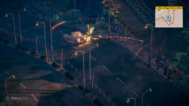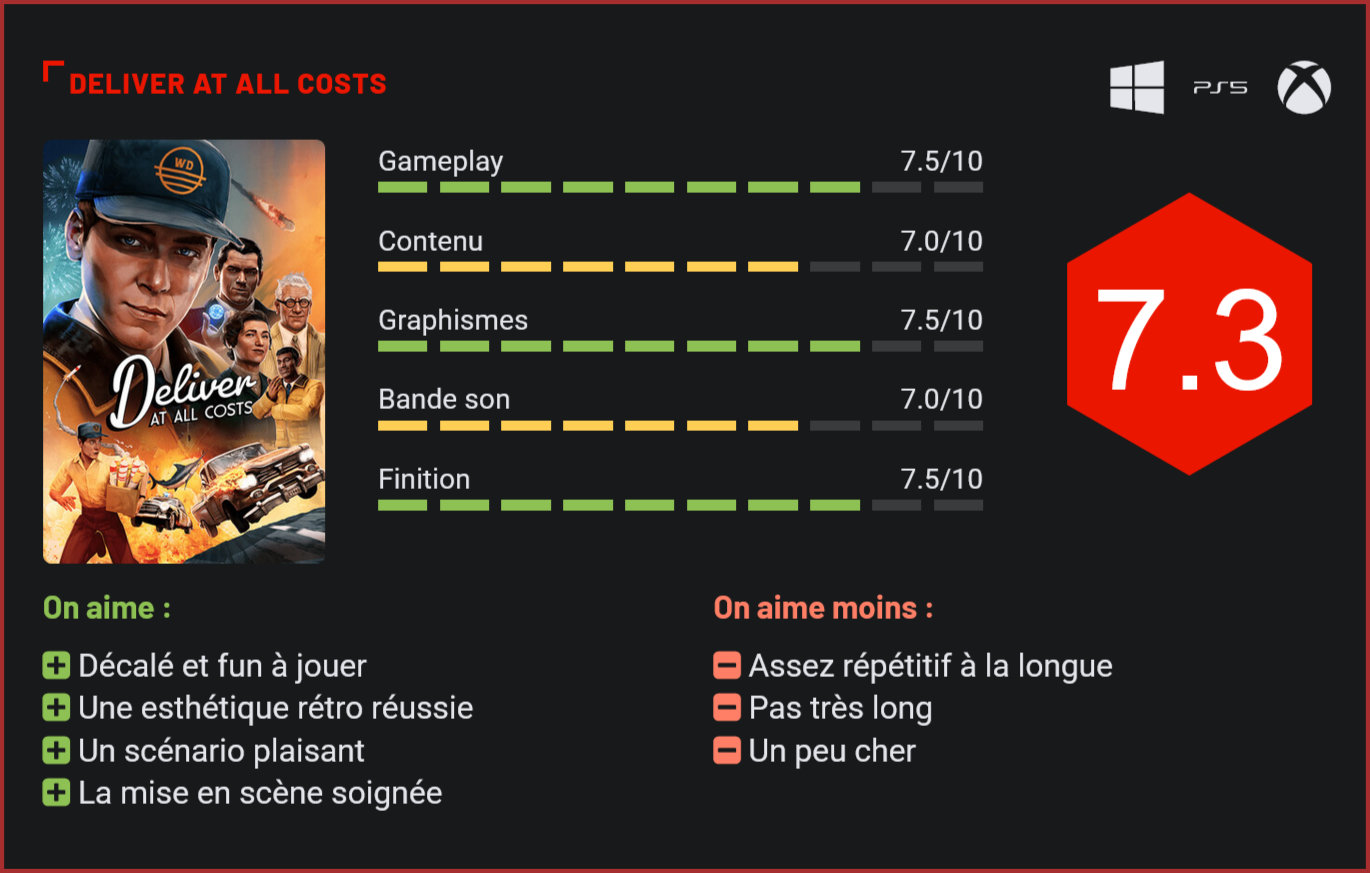 Passé relativement inaperçu lors de son annonce, Deliver At All Costs avait pourtant un concept assez décalé pour susciter l’engouement des gamers : incarner un livreur dans une Amérique rétro des années 50, où chaque mission est une excuse pour semer le chaos. Tirant assez ouvertement son inspiration des premiers épisodes de la saga GTA, le titre du studio suédois FarOut est une véritable bouffée d’air frais. Far Out Games, jeune studio basé à Stockholm, signe avec Deliver At All Costs sa première production. Fondé par une équipe de passionnés ayant travaillé sur divers projets indépendants, le studio s’est donné pour mission de créer un jeu à la fois nostalgique et innovant, puisant dans l’héritage des jeux d’action des années 2000 comme Crazy Taxi ou les premiers GTA. Les premières bandes-annonces de leur nouveau jeu laissaient entrevoir un monde semi-ouvert, une physique destructrice et des missions aussi absurdes qu’explosives. L’une des premières missions vous proposer de livrer des feux d’artifice… Deliver At All Costs nous transporte en 1959, dans la ville fictive de St. Monique, un décor de carte postale des années 50 américaines qui se veut un melting pot de décors tirant son inspiration à Hawaii, San Francisco et Miami, avec ses diners, ses voitures chromées et ses jupes à pois. Le joueur incarne Winston Green, un jeune ingénieur au passé trouble, forcé de prendre un job de livreur chez We Deliver pour payer son loyer. Ce qui commence comme une simple mission de livraison prend rapidement des proportions délirantes : Winston se retrouve mêlé à une intrigue mêlant conspirations gouvernementales, technologies extraterrestres et rivalités avec son patron, Donovan. Le scénario, divisé en trois actes et 13 chapitres, alterne entre humour absurde et moments de tension dramatique, dans une ambiance oscillant entre pulp et film noir. L’univers du jeu est un régal visuel, capturant l’esthétique des années 50 avec une touche de science-fiction. Les séquences à pied font plus du remplissage. Là où on a été franchement surpris, c’est dans l’ambition du studio. FarOut Games ne nous livre par un simple GTA-like, mais un vrai jeu narratif avec des doublages de qualité, de nombreux dialogues et des cinématiques bien construites, de quoi justifier le quasi prix-plein du jeu. Le scénario s’en sort d’ailleurs assez bien, à défaut d’être vraiment marquant. Toutefois, Deliver At All Costs nous convainc bien davantage au niveau de son gameplay, centré sur des livraisons aussi absurdes que périlleuses. Chaque mission impose un défi unique : transporter un merlin géant qui menace de renverser le camion, livrer un colis de feux d’artifice qui explosent en route, ou amener une machine de mesures sismiques alors qu’un volcan est sur le point d’exploser. La physique, au centre de l’expérience, est le vrai point fort du jeu. Tout ici est destructible : murs, clôtures, immeubles entiers s’effondrent sous les roues de votre camionnette. Mieux : la physique de votre véhicule est lourdement impactée par vos cargaisons : du merlin qui gigote aux pastèques qui glissent de gauche à droite. Et au final, c’est un véritable régal de conduire notre pick-up à travers la ville en remplissant des missions toutes plus déjantées les unes que les autres. Avec son ton décalé, sa vue isométrique qui rappelle celle des premiers GTA et son gameplay arcade, le jeu fait mouche. Il parvient également à renouveler son expérience avec des gadgets à installer sur son bolide : une grue pour charger plus facilement des colis, un treuil pour vous aider à hisser des colis plus lourds, un klaxon qui fait exploser des vitrines… C’est bien pensé, et on a surtout pas l’occasion de s’ennuyer ! On notera au passage qu’outre en véhicule, il est possible d’explorer aussi le monde à pied, même si ça a moins d’intérêt. Livrer un marlin pour décrocher l’amour : check. Sur la durée, le jeu se montre toutefois timide. On finit tout de même vite par tourner en rond après 5 heures de jeu. Selon votre engagement, il faudra compter entre 6 et 12h de jeu pour en venir à bout. Sur le plan visuel, Deliver At All Costs impressionne pour un jeu indé. Les environnements, riches en détails, capturent l’essence des années 50 avec des couleurs vives et un style rétro soigné. La destruction est un régal pour les yeux : voir un immeuble s’effondrer ou des débris voler dans tous les sens est jouissif. Les effets de lumière et les changements de météo dynamisent l’ambiance, bien que les transitions entre districts, marquées par des écrans de chargement, cassent le rythme. Conclusion Deliver At All Costs est une bouffée d’air frais, un jeu qui mise tout sur une physique extrême et l’absurde des situations pour vous divertir. Et ça fonctionne plutôt bien puisque ce jeu de livraisons est vraiment plaisant à parcourir. Joli hommage aux premiers GTA-like, le titre séduit outre par son ambiance rétro par son esthétique soignée, avec sa jolie vue isométrique. Seul bémol : on finit vite par tourner en rond dans Deliver At All Costs, les mécanismes du jeu restant répétitif avec un concept totalement basé sur des livraisons décalées. Pas de gunfights à l’horizon, et c’est dommage car le titre aurait pu aller beaucoup plus loin… Sympathique, mais pas forcément marquant, Deliver At All Costs a le mérite d’être assez rafraichissant pour vous occuper le temps de quelques soirées.