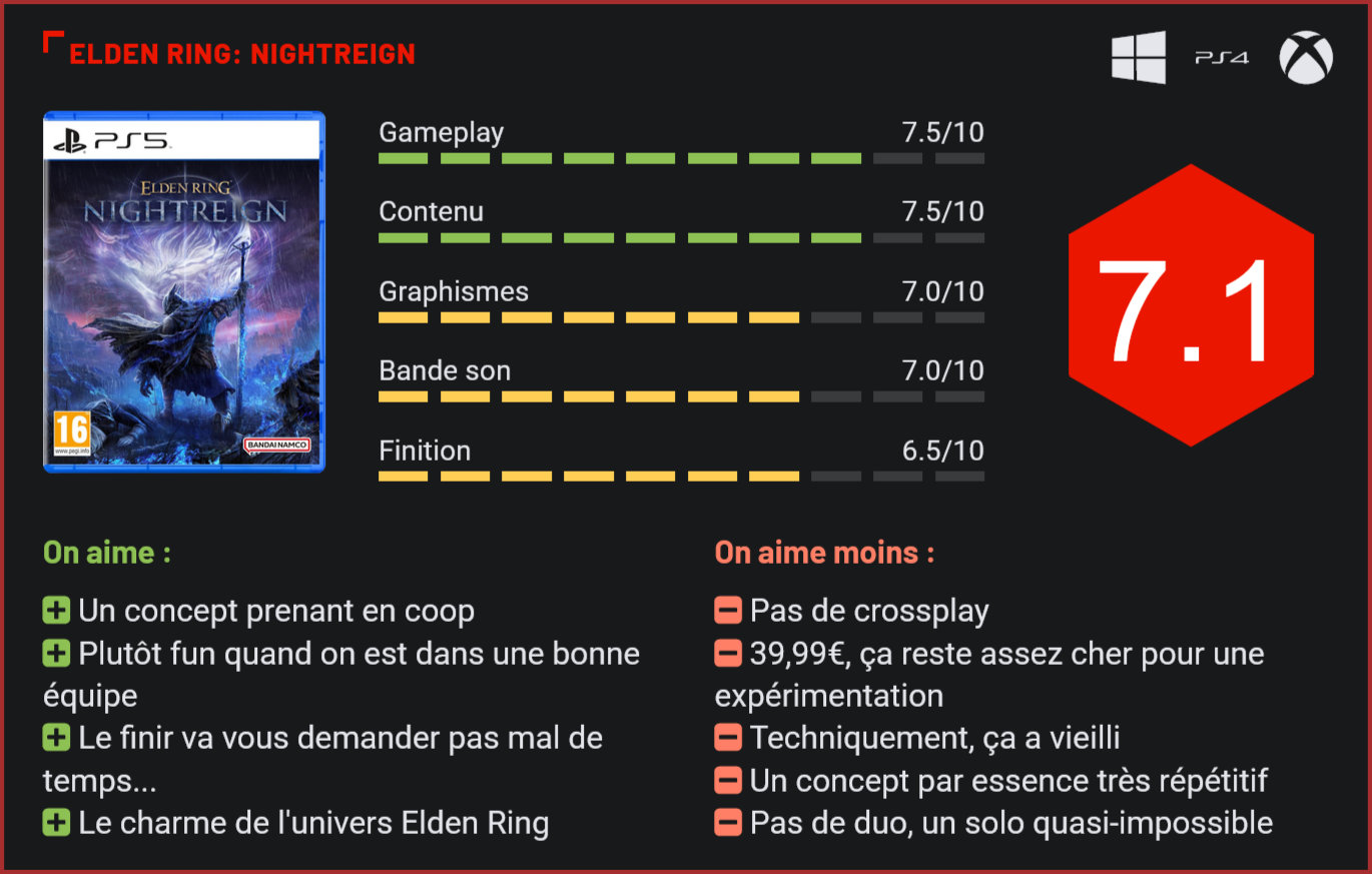 Enorme succès commercial, le premier Elden Ring s’est imposé comme un renouveau pour le genre du Souls-like. Trois ans plus tard, From Software nous livre un spin-off qui prend la forme d’un roguelite coopératif. Un changement de formule qui se veut avant tout une première tentative de percer sur le segment des jeux multijoueurs pour le studio… From Software, c’est le maître incontesté du genre Soulslike. On lui doit des séries aussi emblématiques que Sekiro, Armored Core, Dark Souls ou Bloodborne. Toutefois, c’est bien l’excellent Elden Ring qui a redéfini le genre. Elden Ring était en effet le premier souls-like à oser l’aventure open world. Après le succès de l’extension Shadow of the Erdtree en 2024, Nightreign marque une nouvelle expérimentation du studio. Ce spin-off délaisse l’approche solo pour un gameplay centré sur la coopération, une première pour la série. Même s’il est techniquement possible d’y jouer seul – nous y reviendrons. L’univers d’Elden Ring a toujours autant de charme. Avant d’aller plus loin dans ce test, il est indispensable de revenir sur ce terme expérimentation. Car de facto, il ne s’agit pas de la suite d’Elden Ring. Oui, le jeu prend place dans le même univers et reprend le gameplay caractéristique de son ancêtre, mais la comparaison s’arrête là. Nightreign est bien un jeu à part, qui s’imprègne totalement du style roguelite. Comprenez par là qu’il n’y a pas d’histoire ou d’aventure continue, mais des sessions de jeu courtes en équipe. C’est un roguelite, par essence, on refait donc toujours la même chose. Elden Ring: Nightreign se déroule dans Limveld, une version alternative de Limgrave, ravagée par une « Nightrain », cataclysme plongeant le monde dans une obscurité perpétuelle. Huit Nightlords, des entités monstrueuses, règnent sur ces terres en mutation, et les joueurs, incarnant des Nightfarers, doivent s’unir pour les vaincre. Il ne faudra pas en attendre trop de l’histoire, celle-ci reste cryptique et n’est en définitive qu’une excuse pour nous proposer cette formule unique. Et là c’est le drame, les 3 coéquipiers sont au sol… Nightreign recycle d’ailleurs habilement les assets d’Elden Ring, avec des environnements familiers – ruines, églises, marais – réarrangés de manière procédurale. Côté gameplay aussi, c’est pratiquement un copié collé de l’original, avec quelques légères modifications. Par exemple, votre personnage ne subira pas de blessure en cas de chute. La formule est elle entièrement axée roguelite : l’aventure est divisée en expéditions de 3 jours, chacune durant 15 à 20 minutes. En trio (ou en solo, bien que déconseillé au vu de la difficulté qui n’est pas ajustée et de l’impossibilité de se relever seul en cas de décès), les joueurs choisissent parmi huit Nightfarers, chacun avec une compétence unique, une capacité passive et un ultime. Ces classes, inspirées des archétypes d’Elden Ring et d’autres titres FromSoftware (Bloodborne, Sekiro), offrent une variété tactique, encourageant des synergies en équipe. Comme dans un battle royale, un cercle bleu rétrécit la carte, forçant les joueurs à explorer rapidement, collecter des runes, des armes et à grimper de niveau en tuant des ennemis, avant d’affronter un boss de nuit les deux premiers jours, puis un Nightlord au troisième. Un concept mal expliqué dès le début, qui mènera à beaucoup de frustration pour les joueurs débutants. Car de facto, il est inutile d’espérer vaincre votre premier boss si vous êtes au niveau 3. Il faudra à minima un niveau 6 pour vous faciliter la vie. Et en débutant, vous ne saurez absolument pas quel ennemi peut facilement être vaincu. Vous passerez donc vos 3 premières heures à “tester” en enchainant les morts. Les ennemis sont souvent recyclés d’Elden Ring (Bell Bearing Hunter, Ancient Hero of Zamor), même si on retrouve quelques ennemis inédits aussi. Les combats de boss ont par ailleurs tendance à s’éterniser. A notre plus grand regret. D’ailleurs, vous remarquerez vite que votre progression dépendra en grande partie de vos alliés. Si l’équipe est efficace, vous vaincrez facilement vos ennemis. Si un allié quitte la partie, ou si vous jouez avec deux noobs, ça tourne à la catastrophe… Le mode solo, mal équilibré, prive les joueurs de la mécanique de revive, rendant l’expérience extrêmement punitive. A vrai dire, ça ne vaut même pas la peine de s’y essayer, sauf si vous avez fini Elden Ring sans mourir une seule fois. Les patchs 1.01 et 1.01.1 ont amélioré la balance solo, mais l’absence de mode duo au lancement (promis pour un futur patch) reste un point noir. C’est là l’autre défaut du jeu, il faudra absolument y jouer à 3 et pas à 2. En attendant la mise à jour en tout cas. Les ennemis, environnements, sont abondamment recyclés. Nightreign est en soi un jeu coop très solide et plaisant à parcourir, une fois qu’on a compris le concept. Il n’est toutefois pas facile de s’y plonger avec le peu d’explications qui sont données en début de partie. Ce qui faisait le charme d’Elden Ring est également sacrifié : l’exploration, l’univers d’exception, ses magnifiques paysages… Le monde est généré de façon procédurale, la progression est “rushée” par le concept de nuit, et l’ensemble du jeu est mal équilibré. Plus surprenant encore, bien qu’il s’agisse d’un jeu multijoueur, Nightreign n’est pas crossplay, pour le moment. Sur le plan technique, rien n’a évolué depuis le premier Elden Ring. Le jeu a une patte graphique jolie, mais tient mal la comparaison avec les dernières productions. Il n’a également pas le charme de son ainé avec des paysages beaucoup moins travaillés. Il en va de même pour la bande sonore, qui a beaucoup moins de personnalité que celle de l’original. Conclusion Plus pro