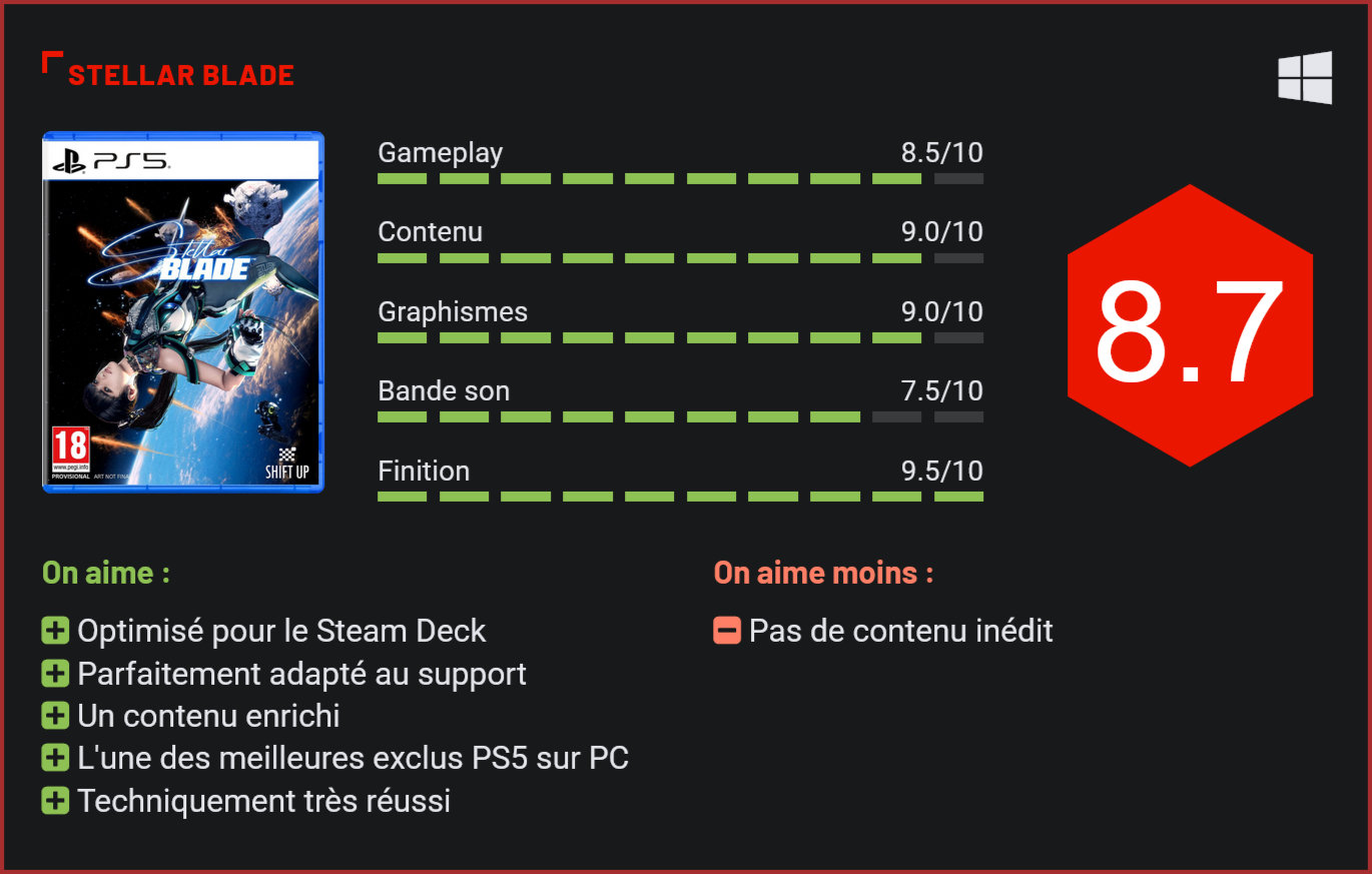 Sorti initialement en avril 2024 en exclusivité sur PS5, Stellar Blade a marqué les esprits avec son héroïne stylisée, ses combats nerveux et son lore soigné. Shift Up élargit aujourd’hui sa cible avec la sortie d’un portage sur PC. Et bonne surprise pour les joueurs, il s’agit d’une version enrichie, optimisée et bourrée de nouveautés. On ne présentera plus Stellar Blade, l’un des prétendants au titre de “jeu de l’année” en 2024. Le jeu a connu un tel succès qu’il est vite devenu l’une des exclus les plus jalousées sur les autres plates-formes. Et bonne nouvelle pour les joueurs PC, il est désormais possible d’y jouer sur Windows également ! Stellar Blade place le joueur dans la peau d’Eve, une soldat d’élite parachutée sur une Terre ravagée par les Naytiba, des créatures extraterrestres. Le scénario, bien que simpliste au premier abord, parvient à agréablement nous surprendre avec des rebondissements, une mise en scène soignée et un lore séduisant. Le gameplay de Stellar Blade était déjà un point fort sur PS5, avec des combats qui ressemblaient à de véritables ballets aériens, dans un style proche de Bayonetta. Le titre se révélait un peu plus technique que les autres jeux du genre, lorgnant sensiblement du côté des souls-likes. Une formule plaisante, d’autant plus qu’Eve était amenée dans son histoire à affronter des boss titanesques dans des combats particulièrement intenses. A côté de ces affrontements, le jeu proposait aussi une partie exploration bien rôdée, principalement pour améliorer l’équipement et débloquer de nouvelles tenues pour l’héroïne. Les combats sont de véritables chorégraphies. Et la bonne nouvelle, c’est que sur PC tout cela est sublimé grâce à la fluidité du framerate qui passe à 120 FPS et le support des écrans larges jusqu’à 32:9. Les ajouts ne s’arrêtent pas là puisque le jeu est aussi compatible NVIDIA DLSS 4, AMD FSR 3, DLAA, et NVIDIA Reflex. Mieux, il est compatible avec le Steam Deck et supporte les mods. Deux ajouts qui feront certainement des heureux. La grande nouveauté niveau contenu, c’est l’ajout d’un nouveau combat de boss contre Mann, le chef des Sentinelles. Ce duel se veut un défi corsé pour ceux qui ont fini l’aventure, même s’il est difficile dès le début de l’aventure. Vaincre Mann débloque une tenue exclusive des Gardes Royaux pour Eve. De plus, 25 nouveaux costumes ont été ajoutés à la garde-robe du personnage – des ajouts cosmétiques déjà déployés sur PS5 via diverses mises à jour. Si le scénario n’est pas très développé, il est joliment mis en scène. Le mode Boss Rush Challenge, introduit en tant que mise à jour gratuite sur PS5, est un autre ajout majeur. Ce mode permet d’enchaîner des combats contre des boss avec des conditions spécifiques, comme des restrictions de compétences ou des ennemis renforcés. Et malheureusement, il faudra s’arrêter là. Pas de contenu exclusif au PC, de nouveau chapitre de l’aventure ou d’extension à l’horizon, Stellar Blade est livré dans une version intégrale parfaitement adaptée au support sur le plan technique, mais qui n’apporte pour ainsi dire rien de neuf au jeu si vous y avez déjà joué sur PS5. Si vous étiez passé à côté, on vous invite à relire notre test de la version PS5, qui vous éclairera sans doute davantage sur les qualités du jeu. Conclusion Surprise de 2024, Stellar Blade était jusqu’ici l’une des exclus PS5 qui justifiaient le plus l’achat d’une console. Parfait mélange de jeu d’action et de souls-like, le titre est un véritable régal pour les yeux, un jeu franchement addictif dans son gameplay et extrêmement bien mis en scène. Sa sortie sur PC est une excellente nouvelle pour les gamers qui pourront être plus nombreux à découvrir l’univers fantastique du jeu. Ce portage est par ailleurs une jolie réussite sur le plan technique : le jeu gagne en fluidité, supporte les écrans larges, est optimisé pour le Steam Deck et intègre tous les ajouts des mises à jour PS5, en ce compris un mode Boss Rush, les nouvelles tenues de la garde robe et les mods. Un incontournable qui requière toutefois une solide configuration pour être joué dans un état optimal.