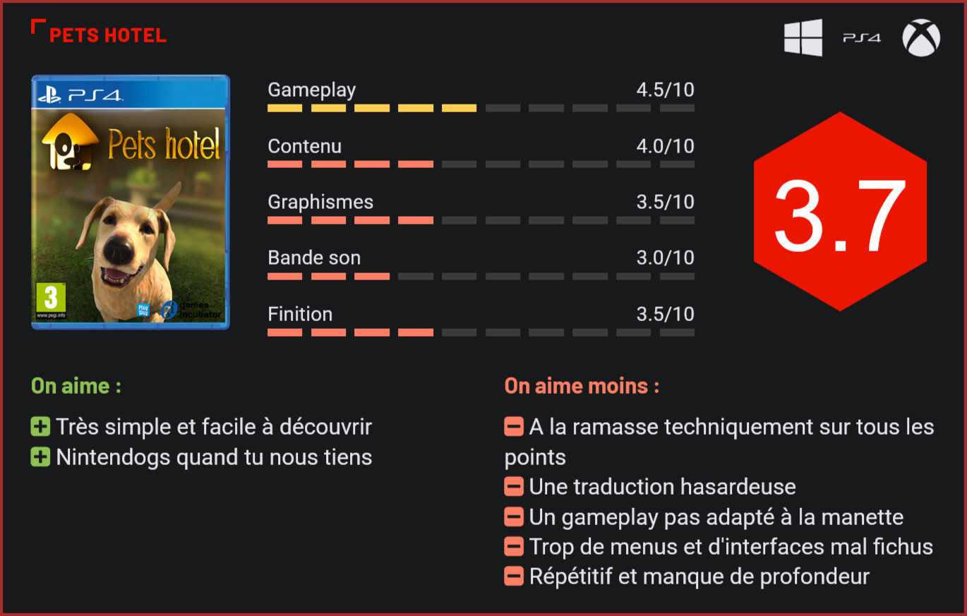Présenté comme un successeur potentiel de Nintendogs, Pets Hotel promet une simulation animalière accessible et attachante. Mal conçu sur consoles, mal traduit et rapidement répétitif, le jeu passe complètement à côté de son objectif. Au milieu des années 2000, à la sortie de la Nintendo DS, une franchise s’est rapidement installée comme pionnière dans la gestion d’un animal de compagnie. Devenu l’un des best-sellers de la console portable avec plusieurs millions de vente, le jeu est aujourd’hui une référence en la matière pour de nombreux studios, qui rêvent à leur tour de proposer la future référence en la matière. Pets Hotel s’y est d’ailleurs frotté, mais c’est catastrophique. Dans ce jeu, vous récupérez l’hôtel pour animaux de compagnie de votre oncle fraîchement retraité. Un hôtel laissé à l’abandon, que vous allez devoir retapé du sol au plafond grâce à tout un tas de pièces et d’accessoires destinés à améliorer le confort de vos pensionnaires à poils, à fourrure ou à carapace. Votre objectif sera clair : accueillir des chiens, des chats, des lapins, des poissons et des tortues pendant que leurs propriétaires sont partis en vacances et faire du mieux que vous le pouvez pour qu’ils soient heureux. Bienvenue dans l’hôtel des animaux, nous sommes en 2006 sur PS2. Pour débuter votre histoire, le jeu vous propose un petit tutoriel vous permettant de vous familiariser avec toutes les mécaniques du jeu. Cela va du système de réservation à l’aménagement des pièces de l’hôtel en passant par les soins prodigués aux animaux. Dès ces premières minutes, nous sommes confrontés aux limites du titre sur consoles. Principalement pensé pour une utilisation à la souris, Pets Hotel est extrêmement frustrant manette en mains. Et pour cause, la moindre de vos décisions devra se faire sur une sorte d’iPad version Wish. Même la construction de vos pièces ou la commande de croquettes passera par là. Le souci, c’est que l’on multiplie les allers et venues dans un menu très capricieux, qui réagit très mal aux déplacements du joystick. C’en devient frustrant, et ce n’est là que la première frustration qui ressort de cette expérience. Au-delà du tutoriel, deux autres modes de jeu nous sont proposés : le mode histoire et le mode libre. Dans ce premier, ce sont quatre scénarios qui se dressent devant nous lors desquels ils nous est demandé d’accomplir divers tâches plus ou moins variées. La finalité reste toutefois la même quelque soit le scénario débuté : avoir un hôtel qui prospère et qui fasse rentrer un maximum d’argent dans votre compte en banque. Quant au mode libre, c’est un mode histoire sans scénario ni objectif. Le but est simplement de prospérer. Honnêtement, qui accepterait que son chien dorme là-dedans ? Concrètement, le jeu n’est pas bien compliqué. Il nous est d’abord demandé d’aménager des pièces pour accueillir les petites bêtes. Il faut alors penser à tout, du bol de croquettes au panier pour les chiens et chats, à l’aquarium ou au vivarium pour les poissons et tortues… Les options de customisation et de personnalisation sont là, mais pas suffisamment nombreuses. On s’ennuie très vite dans le jeu. Après avoir fini la construction de l’abri et d’avoir recruté du personnel, nous n’avons plus grand chose à faire, si ce n’est recenser les inscriptions puis les arrivées. Seulement cinq espèces d’animaux nous sont proposées, ce qui est bien évidemment que trop peu, et on se retrouve alors avec des parties qui se ressemblent bien trop entre elles. Si seulement nous avions une technique de qualité, alors cela aurait pu faire la balance. Mais Pets Hotel est à la ramasse à presque tous les niveaux. Les graphismes semblent d’un autre temps, tout comme les animations bien trop rigides et impersonnelles. Une fois personnalisé, même si nous y avons mis tout notre coeur, l’hôtel continue de ne ressembler à rien et d’être austère à n’en plus finir. Et pour couronner le tout, les traductions francophones ne veulent absolument rien dire, comme si on n’avait abusé du Google Traduction de 2013 qui ne tient absolument pas compte des contextes pour traduire. Conclusion Pets Hotel passe complètement à côté de son ambition de devenir la nouvelle référence de la gestion d’animaux. Entre des contrôles inadaptés à la manette, un contenu famélique, des parties qui tournent vite en rond et une réalisation indigne de la génération actuelle, le jeu enchaîne les maladresses sans jamais convaincre. Même les fans du genre risquent de lâcher l’affaire face à cette expérience bancale, répétitive et bien trop limitée pour marquer les esprits.