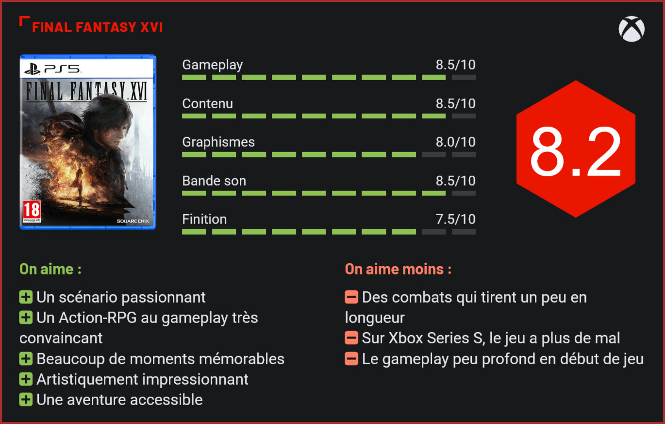 Sorti en exclusivité sur PlayStation 5 il y a tout juste un an, Final Fantasy XVI débarque enfin sur d’autres plateformes. Le seizième opus de la saga légendaire de Square Enix avait divisé par son virage vers l’action et son ton plus sombre, mais il s’était imposé comme une claque technique et narrative. Final Fantasy XVI nous plonge dans Valisthéa, un monde médiéval-fantastique où les nations s’affrontent pour le contrôle des Cristaux-mères, sources de magie et de pouvoir. Le joueur incarne Clive Rosfield, prince déchu de Rosaria, dont la vie bascule après une tragédie impliquant les Éikons, des invocations titanesques liées aux Primordiaux. Cette quête de vengeance et de rédemption, qui s’étend sur plusieurs décennies, explore des thèmes matures comme la guerre, l’esclavage et le sacrifice. L’écriture, signée Kazutoyo Maehiro, tisse une fresque complexe où intrigues politiques, trahisons et dilemmes moraux s’entrelacent avec une intensité rare. Les personnages, de l’idéaliste Joshua au cynique Cid, sont profonds et attachants, portés par des doublages impeccables (en anglais ou japonais, avec sous-titres français). Graphiquement, le jeu est une belle réussite. L’univers de Valisthéa est d’une richesse saisissante. Chaque région – des plaines verdoyantes de Rosaria aux déserts arides de Dhalmekia – déborde de détails visuels et narratifs, renforcés par des quêtes secondaires qui étoffent le lore. Les cinématiques, nombreuses et superbement mises en scène, capturent l’ampleur des affrontements entre Éikons, évoquant des combats dignes d’un Godzilla. Si l’histoire peut parfois souffrir d’un rythme inégal, avec quelques longueurs dans l’acte central, elle compense par des twists mémorables et une conclusion bouleversante. Même les joueurs réfractaires aux récits épiques y trouveront leur compte, tant la narration est immersive et universelle. C’est dans son gameplay que Final Fantasy XVI se distingue, abandonnant le tour par tour pour un système d’action en temps réel inspiré de Devil May Cry. Clive, armé de son épée et des pouvoirs des Éikons, enchaîne combos, esquives et attaques spéciales dans des combats d’une fluidité sidérante. Chaque Éikon, comme Ifrit, Phénix ou Titan, confère des compétences uniques – boules de feu, charges sismiques, parades énergétiques – que le joueur peut équiper et alterner à la volée. Ce système, accessible mais profond, permet de personnaliser son style de jeu : privilégier la puissance brute avec Titan, la mobilité avec Garuda, ou les attaques à distance avec Bahamut. Les combats, rythmés par une caméra dynamique et des effets visuels éblouissants, donnent une sensation de puissance rarement égalée. Les combats se jouent désormais au tour par tour. Les affrontements contre les boss, en particulier les Éikons, sont le clou du spectacle. Ces séquences, mêlant QTE bien intégrés et phases de combat spectaculaires, évoquent des blockbusters hollywoodiens. La progression est enrichie par un arbre de compétences où l’XP accumulée permet de débloquer de nouvelles capacités ou d’améliorer celles existantes. Les équipements, bien que moins complexes que dans un RPG classique, offrent des bonus variés (force, santé, recharge de magie), tandis que le craft permet de fabriquer des armes légendaires comme l’Épée de l’Ouragan. Les quêtes secondaires, souvent critiquées sur PS5 pour leur manque d’originalité, ont été légèrement remaniées dans cette version Xbox, avec des défis plus variés et des récompenses plus intéressantes. Le DLC The Rising Tide, inclus dans cette édition, ajoute une nouvelle région, Mysidia, et un Éikon inédit, Léviathan, dont les pouvoirs aquatiques renouvellent les combats. Cependant, le gameplay n’est pas exempt de défauts. La courbe de difficulté, bien que mieux équilibrée qu’à la sortie initiale grâce à des ajustements, peut sembler trop clémente pour les habitués des jeux d’action. De plus, la gestion de l’inventaire reste simpliste, et certains combos manquent de variété à long terme. Malgré ces bémols, le système de combat reste un modèle d’équilibre entre accessibilité et profondeur, rendant chaque affrontement exaltant. Côté exploration, le jeu souffre des mêmes limites que sur PS5 : les zones, bien que magnifiques, sont parfois trop linéaires, et l’absence d’un véritable open-world peut décevoir les fans de Final Fantasy XV. Les quêtes secondaires, malgré des améliorations, restent en deçà des standards modernes, certaines se limitant à des allers-retours sans grand intérêt. La durée de vie, en revanche, est généreuse : la quête principale se boucle en 35 à 40 heures, tandis que les quêtes annexes, le DLC et le mode New Game+ peuvent porter l’expérience à plus de 60 heures pour les complétionnistes. La mise en scène est très impressionnante. Sur Xbox Series X comme sur PS5, le jeu est d’une beauté étonnante. Sur Xbox Series X, il tire parti de la puissance de la console pour offrir des textures encore plus fines et des temps de chargement quasi inexistants. Les environnements, bien que semi-ouverts plutôt que véritablement open-world, regorgent de détails, des reflets sur les armures aux particules de magie. La version Series S souffre à l’inverse de quelques chargements plus lents, de soucis de chargement de textures et d’un affichage limité à du 1080p. Clairement, il y a un gap entre les deux machines, qui se ressent de plus en plus. Reste que par rapport à la version PS5, pas mal de bugs ont été corrigés. Le jeu est désormais beaucoup plus stable et n’est pas susceptible de causer le crash de la console. La bande-son, composée par Masayoshi Soken, est un chef-d’œuvre, mêlant chœurs épiques, thèmes mélancoliques et morceaux électrisants pour les combats. Les doublages, disponibles 