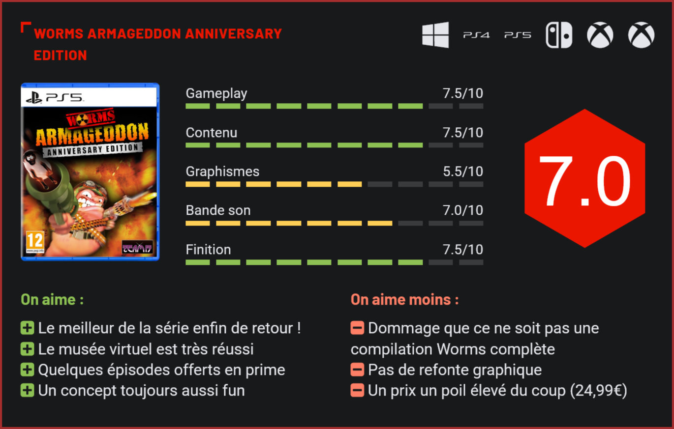 Considéré comme le meilleur épisode de la série par les fans, Worms Armageddon a récemment eu droit à un remaster récemment enrichi par l’ajout de plusieurs jeux additionnels dont l’excellent Worms: World Party. L’occasion de se repencher sur ce classique. La Team17 a bâti sa réputation sur la série Worms, un jeu en 2D mêlant stratégie, humour absurde et action. Et pour beaucoup de fans, c’est l’épisode Worms Armageddon qui reste le meilleur volet de la saga. L’Anniversary Edition n’est pas une simple réédition, mais une version enrichie de multiples bonus pour répondre aux attentes des joueurs d’aujourd’hui. Le jeu a par ailleurs récemment eu droit à une mise à jour majeure qui apporte un tas de nouveautés pour les fans parmi lesquelles des versions jouables de 3 jeux, Worms (Super NES), Worms (Genesis/Mega Drive), Worms World Party (Game Boy Advance). Graphiquement, ça a forcément vieilli. Ce qui a fait le concept de l’original, c’est bien sûr son concept génial : dans un environnement 2D entièrement destructible, deux équipes (ou plus) de vers s’affrontent au tour par tour. Chaque joueur contrôle un ver à la fois, avec un temps limité pour se déplacer et utiliser une arme ou un outil. L’objectif ? Éliminer l’équipe adverse. Pour remporter la partie, il faut miser sur une bonne stratégie mais aussi un peu de chance… Avec ses 55 armes totalement délirantes qui vont du bazooka au mouton explosif, le jeu ne fait pas dans la dentelle. Chaque arme a d’ailleurs ses particularités : certaines, comme le bazooka, demandent de prendre en compte le vent et la gravité, tandis que d’autres, comme la corde ninja, permettent des déplacements acrobatiques pour atteindre des positions stratégiques. La Anniversary Edition introduit des ajustements bienvenus, comme une interface modernisée pour sélectionner les armes et des commandes plus fluides, notamment sur consoles. Le jeu propose une campagne solide qui comprend plus de 40 missions. Et il faut bien l’avouer que la Team17 a bien fait les choses avec un véritable musée numérique pour explorer l’histoire de la franchise avec des documentaires de qualité. Une formule proche de celle de l’excellente compilation de l’histoire d’Atari – ce n’est d’ailleurs pas une surprise puisque c’est le même studio qui se cache derrière cette Anniversary Edition, Digital Eclipse. C’est toutefois bien à plusieurs qu’il prend tout son intérêt avec ses combats tactiques contre des amis en ligne ou en local. Les parties entre amis sont une source inépuisable de fous rires. Le musée est un vrai plus pour cette édition. Alors bien sûr, on pourra lui reprocher de ne pas apporter grand chose de neuf. Cette Anniversary Edition n’est en effet pas un remake mais une réédition du jeu avec un paquet de nouveautés certes, mais pas de refonte graphique. On a certes droit à un lifting en haute définition mais pas de nouveau moteur graphique. On regrette aussi quelques oublis comme la loupe qui aurait permis de zoomer sur l’action. Alors certes, on pourrait finalement reprocher à cette édition Anniversaire de se limiter à un épisode (et quelques extras) et il est vrai qu’on aurait pu attendre une collection intégrale regroupant tous les jeux de la série remasterisés. Certains opus comme le Worms 3D ou le Worms 4: Mayhem n’ont pas eu droit à des refontes sur les consoles de dernière génération et cela reste dommage. Et oui, à 24,99€, l’addition est un poil salée. Mais pour les fans, qui attendaient depuis longtemps de pouvoir rejouer à ce classique, c’est une véritable bénédiction. Conclusion C’était sans doute l’épisode favori des joueurs. Worms Armageddon reste un classique du jeu de stratégie. Pour les fans, cette réédition est donc un véritable bonheur, d’autant plus qu’elle intègre un musée virtuel, des documentaires et quelques jeux en bonus. A 24,99€, l’addition reste toutefois salée pour un jeu qui n’a pratiquement pas été modernisé et une compilation qui reste “limitée” au niveau du scope.