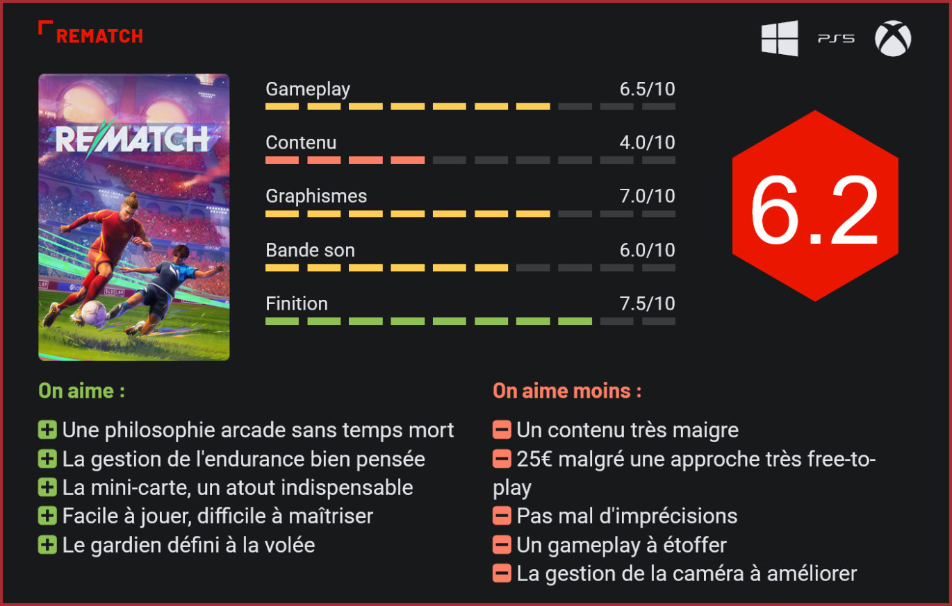 Fut une époque, les jeux de foot se multipliaient comme des petits pains. Désormais, seules deux licences continuent à coexister : EA Sports FC (anciennement FIFA) et eFootball (anciennement PES). Sloclap a tenu à proposer une alternative embrassant le côté arcade. Rematch demande d’adopter une autre philosophie empruntant beaucoup à Rocket League, et ce, pour le meilleur et le moins bon. Sloclap est un studio parisien indépendant qui célèbre cette année ses 10 ans d’existence. On lui doit Absolver mais aussi et surtout Sifu. Ce dernier est un jeu d’action atypique mêlant une esthétique léchée et un gameplay très exigeant. Pour son nouveau projet, le studio est parti dans une nouvelle direction. Avec Rematch, il ambitionne de proposer une nouvelle variante du jeu de foot, à la croisée entre le foot arcade et Rocket League. Contrairement à plusieurs jeux orientés multijoueurs qui prennent la voie du free-to-play, Rematch demande un investissement minimum de 25€, à moins que vous ne soyez abonné au Xbox Game Pass Ultimate pour en profiter sans frais supplémentaires. Si le tarif paraît plutôt honnête, force est de constater que c’est déjà trop cher pour ce qui est proposé. Il suffit de lancer le titre pour se rendre compte du contenu famélique intégré. Le mode entraînement est rapidement oubliable, une fois les quelques ateliers faits, et ce n’est pas le prologue qui va retenir les joueurs bien longtemps, celui-ci servant simplement à assimiler les commandes de base. Rematch adopte une esthétique visuelle proche de celle de Sifu Il ne reste alors que trois possibilités : le match rapide, le match classé et le match privé. Le match rapide est un passage obligatoire puisque, avant d’accéder aux classements, il faut se hisser jusqu’au niveau 5. Le bon côté, c’est qu’on peut opter pour trois configurations différentes, à savoir le 3 vs 3, le 4 vs 4 et le 5 vs 5. Sur le papier, cela peut sembler anecdotique. En jeu, la philosophie des parties change selon la configuration. En effet, le gardien étant volant, ce qui signifie que le rôle peut être attribué à la volée à un autre joueur qui se trouve dans la surface de réparation si le gardien sélectionné s’éloigne, les rencontres ont des dynamiques différentes. Les parties à 3 vs 3 sont rapides, ouvrent les espaces et demandent une bonne coordination pour monter en attaque quand il faut et soutenir le gardien en défense lors des contre-attaques. Au gardien également de jauger ses sorties. Les parties à 4 vs 4 sont plus équilibrées. Si le goal reste dans ses cages, cela laisse 3 joueurs de champs. Il est donc plus facile de faire du jeu en triangle pour progresser et de s’organiser pour maintenir au moins un joueur en position basse pour assurer la défense. Les parties à 5 vs 5 sont quant à elles plus posées et tactiques. Chacun trouvera la configuration qui lui sied le mieux. Lorsque les parties classées sont débloquées, vous n’avez pas le choix. Les rencontres opposent forcément 5 joueurs à 5 autres. Le but, c’est de gagner de la réputation en remportant des matchs pour monter dans les divisions. Bien entendu, les défaites sont signes de perte de réputation. Quelques parties sont au passage nécessaires pour obtenir son premier classement. Que ce soit en amical ou en privé, les rencontrent durent 6 minutes, des prolongations se déclenchent en cas d’égalité et une règle No Mercy a été mise en place pour arrêter un match dès qu’il y a 4 buts d’écart entre les deux équipes. De quoi éviter une humiliation plus franche. Enfin, le match privé permet, comme son nom le suggère, de créer une partie privée ou d’en rejoindre une via un système de code. L’avantage, c’est qu’il est possible de configurer les règles, dont le temps de jeu qui peut être diminué ou augmenté jusqu’à 20 minutes. On peut également ajuster le nombre de buts du No Mercy, la durée des prolongations, etc. Sympa pour jouer avec les amis, à défaut de pouvoir jouer en local. Et c’est à peu près tout. Pas de bots pour s’entraîner, pas de création de clubs, ni de tournois… Et, sans Internet, il n’y a pas grand-chose à faire, si ce n’est l’entraînement (et le prologue). Tout le reste est soumis à une connexion en ligne. Tous les joueurs peuvent être aussi bien en attaque qu’en défense, voire prendre le rôle du gardien Comme pour tous les jeux compétitifs multijoueurs, les développeurs ont mis en place un système de Saison (on débute avec la 0) qui permet de débloquer quelques éléments cosmétiques au fil de l’XP engrangée. Des éléments de personnalisation sont également de la partie pour personnaliser son avatar, sa tenue, sa pose, sa célébration, etc. Bien entendu, quelques éléments sont à acheter via des devises, qui s’échangent contre des euros via la boutique. Le système rappelle très clairement le principe de tous les free-to-play actuels… Sauf que le jeu est affiché à 25€ dans sa version standard. Malgré tout, Rematch ambitionne de proposer une véritable alternative footballistique, à une époque où FIFA Street ou des titres comme Virtua Striker, Red Card Soccer, etc. manquent cruellement. Seuls les Mario Strikers font office de réelle alternative arcade sur les consoles Nintendo. De fait, Sloclap a établi quelques règles simples : pas de sortie du ballon (donc ni touche, ni corner), pas de faute (donc pas de temps mort), pas de hors jeu. L’arbitre est aux abonnés absents, les seules interruptions de jeu surviennent lors d’un but. Très clairement, le titre mêle des idées de FIFA Street et de Rocket League. Conserver le ballon n’est pas forcément une bonne idée, les développeurs poussant à jouer collectif. Pour cela, chaque joueur a une barre d’endurance. Elle octroie de l’énergie pour courir, avec en prime une petite jauge indépendante pour une super accélération. En 