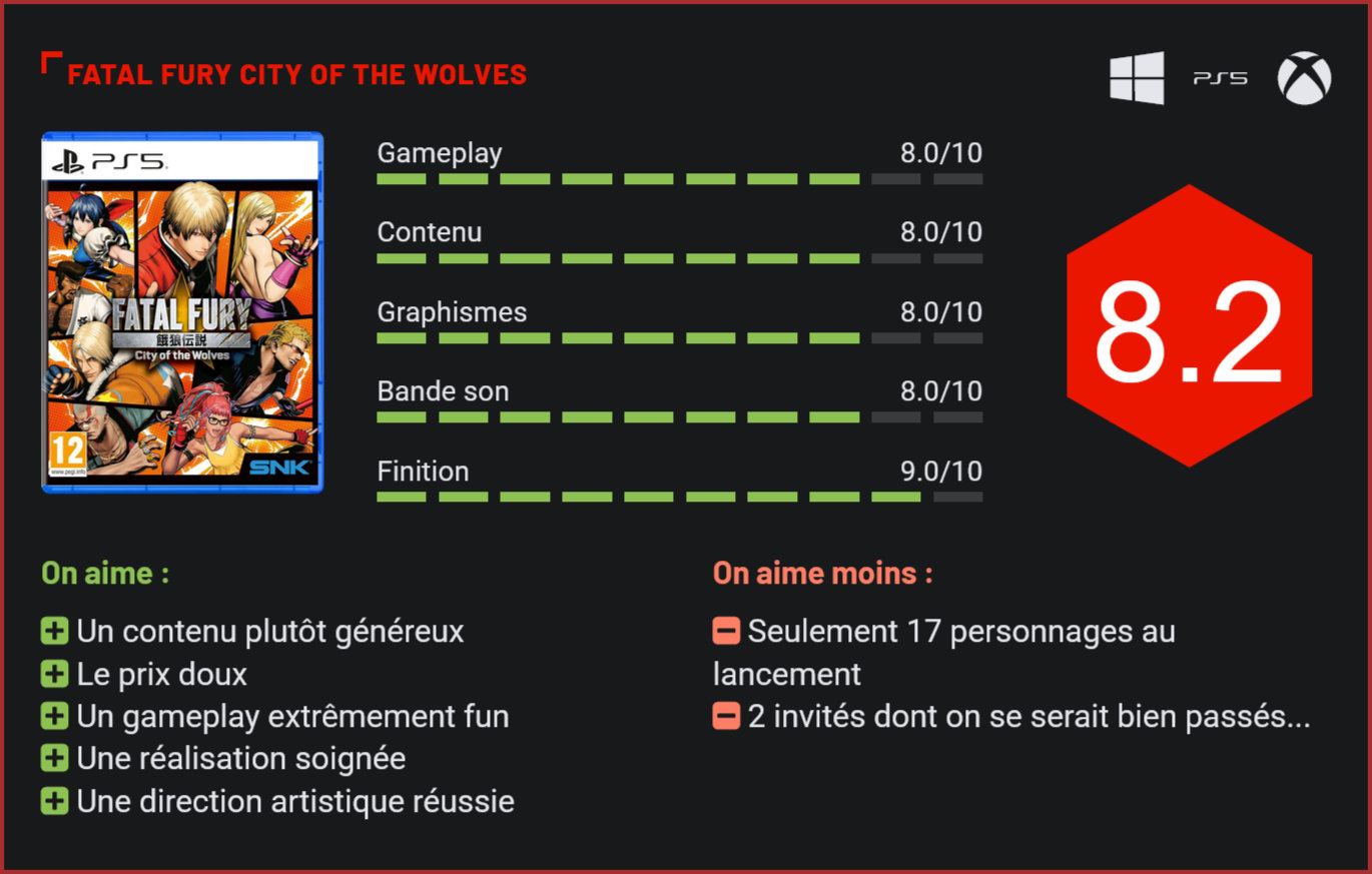 Après 26 ans d’absence, la légendaire saga des Fatal Fury de SNK renaît d’entre les morts. City of the Wolves succède ainsi à à Garou: Mark of the Wolves (1999). Comme The King of Fighters et Samurai Shodown avant elle, la licence a droit à une refonte complète avec un style visuel audacieux et un gameplay extrêmement nerveux. Après avoir ramené d’entre les morts ses licences The King of Fighters XV (2022) et Samurai Shodown (2019), SNK livre avec Fatal Fury: City of the Wolves un nouveau revival d’une licence oubliée. Développé sous Unreal Engine, le jeu bénéficie d’un budget conséquent, en partie grâce à l’acquisition de SNK par la Saudi Arabian Electronic Gaming Development Company en 2022. Vendu à environ 50 € dans son édition spéciale (incluant le Season Pass 1), City of the Wolves était un pari risqué pour l’éditeur, la licence n’étant plus aussi populaire que les autres IP du studio. Le jeu a un style graphique qui lui est propre. City of the Wolves se déroule dans la ville fictive de South Town, un décor inspiré des Art of Fighting, ancêtres des Fatal Fury. Ce nouvel opus est une suite directe de Garou: Mark of the Wolves, centrée sur Rock Howard, le protégé de Terry Bogard, qui explore son passé tout en affrontant de nouveaux défis. L’histoire, racontée via le mode Arcade et le mode Episodes of South Town, suit les luttes de pouvoir dans une ville gangrénée par la corruption, avec un total de 17 personnages jouables. City of the Wolves brille le plus à travers son système de combat. Comme on l’a dit plus haut c’est un jeu de baston en 2.5D qui reprend le style graphique des deux derniers reboots de SNK. Il modernise des anciens volets tout en conservant ce qui faisait la spécificité des Fatal Fury. Les mécaniques classiques, comme le Just Defense (un block précis) et le T.O.P., renommé Selective Potential Gear (S.P.G.), sont toujours là. La grande nouveauté est le système REV, une jauge de risque/récompense qui se remplit avec des mouvements comme les REV Arts (attaques spéciales boostées) ou REV Blows (coups défensifs). Une gestion imprudente mène à un “overheat”, bloquant temporairement ces options et exposant le joueur à des guard breaks. Un système qui ajoute une couche tactique. Globalement, le jeu se veut très accessible grâce à d’excellents tutoriels et des contrôles simplifiés. Les combats sont intenses, très rapides, et peuvent se montrer étonnamment techniques. Ne vous attendez pas à une claque dans la mise en scène… Alors bien sûr, certains critiqueront son roster “léger” – 17 personnages, incluant des icônes comme Terry Bogard, Mai Shiranui, et Billy Kane, ainsi que la nouvelle Preecha – et plus encore la présence de “guests” dont on se serait bien passés – Cristiano Ronaldo et le DJ Salvatore Ganacci, qui s’intègrent très mal dans l’univers du jeu et sont deux des personnages les moins réussis du casting. Mais rappelons-le, le jeu est vendu à un tarif très compétitif et il intègre le Season Pass 1 qui ajoutera plusieurs nouveaux personnages. Côté modes de jeu on retrouve un mode Arcade classique, un mode Versus, un mode Entraînement, et le mode Episodes of South Town, un mode solo narratif où l’on explore une carte 2D de South Town pour accomplir des quêtes et gagner des XP. Bien que divertissant, on a tendance à vite y tourner en rond. Les combats en ligne, avec rollback netcode et cross-play, sont fluides. Bref, le jeu remplit toutes les cases. Au casting, on retrouve quelques personnages iconiques, dont Mai Shiranui. Visuellement, City of the Wolves est une réussite. Le style comic-book 2.5D llui va très bien, la formule avait déjà été utilisée avec les deux précédents King of Fighters et Samurai Shodown, vous savez donc à quoi vous attendre. Les animations, fluides et détaillées, rendent chaque combattant expressif, bien que Ronaldo et Ganacci détonnent par leurs designs moins soignés. Niveau optimisation, rien à redire, le jeu tourne en 4K/60 FPS avec un framerate constant. Au final, difficile donc d’être déçu par ce revival inattendu. SNK maîtrise son sujet et livre un excellent jeu de combat pour les puristes comme les débutants. Une vraie bouffée d’air frais entre deux parties de Street Fighter ou de Tekken, et surtout une formidable opportunité de retoucher une série qu’on n’avait plus vu depuis longtemps… Conclusion Après The King of Fighters et Samurai Shodown, SNK ressuscite avec brio une autre série légendaire de son catalogue. Fatal Fury City of the Wolves n’a peut-être pas le sex-appeal d’un King of Fighters ou d’un Street Fighter, mais il est incontestablement un excellent jeu de baston. Le jeu flatte la rétine avec ses graphismes en 2.5D. Il est aussi assez généreux en contenu avec son mode solo scénarisé, son netcode et ses nombreux options de jeux en ligne. Certes, le roster est un peu léger avec 17 personnages jouables au lancement, mais il s’enrichira avec le premier season pass (offert) et rappelons-le, le titre est vendu à un prix assez compétitif. Seul réel défaut : la présence de deux invités qui n’avaient pas sa place dans ce casting, Cristiano Ronaldo et le DJ Salvatore Ganacci. On se demande bien ce qui a bien pu passer dans l’esprit des développeurs sur ce coup là… Pour le reste, que vous soyez un puriste ou un débutant, vous allez prendre un pied monumental sur cet excellent jeu de combat, aussi accessible que stratégique.