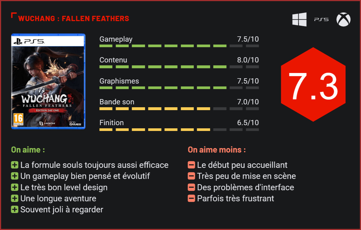 Après le succès de Black Myth : Wukong à l’international, les souls-like en provenance de Chine se font de plus en plus connaître dans nos contrées. S’il n’a rien de révolutionnaire, Wuchang : Fallen Feathers est un titre du genre qui se montre convaincant et qui pourrait plaire aux amateurs de difficulté relevée. Le studio chinois Leenzee propose depuis peu une nouvelle production nommée Wuchang : Fallen Feathers. Premier gros jeu de cette équipe n’ayant produit qu’un titre en réalité virtuelle avant cela, Wuchang a pourtant un peu fait parler de lui grâce à plusieurs présentations dans des événements majeurs comme le Summer Game Fest. Véritable Action-RPG inspiré des jeux “souls”, le premier gros jeu de Leenzee est très sympathique à parcourir, mais loin d’être parfait. Le titre se déroule en Chine, plus précisément dans le royaume de Shu durant le règne de la dynastie Ming. Le récit prend place dans un monde fidèle à l’histoire du pays, mais où le cours de l’histoire a basculé à cause de forces surnaturelles. Le monde est plongé dans le chaos, notamment à cause de l’épidémie d’Ornithropie, une maladie qui fait pousser des plumes sur le corps des infectés avant de les transformer en monstre. Nous incarnons une femme amnésique nommée Bai Wuchang, elle-même atteinte d’Ornithropie mais qui n’a mystérieusement pas encore succombé à la maladie. Cette dernière lui confère par ailleurs des pouvoirs magiques. L’héroïne va alors voyager dans le but de trouver un remède et de retrouver la mémoire. Les habitués du genre des souls-like seront en terrain connu tant la formule est respectée. Nous évoluons dans plusieurs grandes zones qui sont de vrais labyrinthes remplis d’ennemis à vaincre et d’objets à trouver, et dans lesquels se cachent aussi des sanctuaires qui font office de points de sauvegarde qui permettent de faire évoluer notre personnage, mais aussi de nous soigner tout en faisant réapparaître les ennemis vaincus. La mort arrive souvent et laisse derrière nous une certaine quantité d’expériences que nous pouvons aller rechercher. Le jeu propose de très jolis décors. Le titre nous propose des mécaniques de combat similaires aux autres souls-like aussi, mais possède tout de même ses quelques idées originales. Différents types d’armes sont proposés permettant d’utiliser des capacités distinctes, qui peuvent d’ailleurs être améliorés via un arbre de compétence qui remplace le système de répartition de statistiques traditionnel des souls. La grande originalité du titre se situe dans son système de magie. Nous possédons différents sorts qui peuvent être utilisés avec n’importe quel build, mais qui nécessitent des charges de “Puissance céleste”. Ces dernières s’obtiennent en réalisant certaines actions, dont les esquives parfaites qui prennent une véritable importance dans les combats. Même si l’action est assez lente, les sensations de jeu sont très agréables et les combats de boss sont véritablement palpitants. Le titre offre de nombreuses possibilités de builds pour notre personnage, et la capacité d’en changer sans trop d’efforts, ce qui peut vraiment faire la différence en combat. Les amateurs de challenge seront ravis puisque le titre réserve des passages et des boss très corsés, en plus d’une mécanique de “folie” qui augmente selon différents facteurs et qui fera parfois apparaître un fantôme coriace à l’endroit de notre dernière mort. Le jeu peut parfois être un peu injuste. La progression est également assez lente, mais tout un tas de nouvelles possibilités s’offrent à nous tout au long de cette aventure à la durée de vie conséquente (au moins 40h pour en voir le bout). Le titre impressionne aussi avec son level design bien pensé. Les zones sont grandes et proposent plusieurs chemins différents nous laissant un peu de liberté, sans pour autant être en monde ouvert non plus. Les différents sentiers se croisent et nous demandent de bien comprendre la zone dans laquelle nous évoluons pour trouver où est la suite de la quête principale. Ces zones mènent parfois à des endroits ou à des combats de boss entièrement optionnels, en plus de proposer plusieurs quêtes annexes. Son univers est aussi une force de Wuchang. Évidemment très inspiré de l’histoire de la Chine, mais en y ajoutant de la dark fantasy, les décors et inspirations sortent un peu du lot et donnent une belle identité à ce jeu. D’autant plus que le titre se révèle souvent assez joli, utilisant au mieux l’Unreal Engine 5 pour mettre en scène des environnements particulièrement bien éclairés et détaillés, en plus d’être techniquement convaincant aussi sur console. La bande-son reste souvent assez discrète, mais plutôt efficace quand on a besoin d’elle. Les combats de boss sont très réussis. Malgré tous ces bons points, l’expérience Wuchang : Fallen Feathers est pourtant loin d’être parfaite. Il est plutôt difficile de s’investir dans l’aventure quand les premières heures sont vraiment peu attrayantes. Dès le départ, le titre se montre complexe en multipliant les tutoriels et les termes spécifiques à cet univers qui sont difficiles à retenir. Le scénario n’aide pas non plus puisque la grosse majorité des dialogues sont portés par des conversations peu passionnantes et sans aucune mise en scène. La progression est lente, en plus de nous demander de nous acclimater à des interfaces très peu lisibles, et le titre se montre parfois impitoyable en multipliant les pièges injustes. Nul doute que les fans de souls-like apprécieront l’expérience, mais Wuchang : Fallen Feathers nous demande de souffrir avant de pouvoir apercevoir toutes ses qualités. Conclusion Après un premier jeu en réalité virtuelle, le studio chinois Leenzee propose un Action-RPG typé souls-like très inspiré des classique