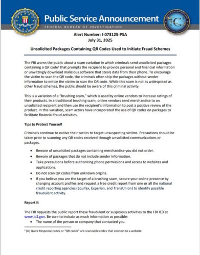 Fin d’année dernière, nous vous expliquions ce qu’est le brushing scam, une arnaque qui prenait de l’ampleur. Quelques mois plus tard, les autorités alertent sur le réseau social X. Elles préviennent qu’une variante piège de nombreuses victimes. Explications. L’an passé, durant les fêtes de fin d’année, plusieurs personnes ont reçu des colis inattendus. Ces derniers contenaient un objet, voire même un produit de consommation courante. Généralement, le contenu avait une faible valeur marchande. Néanmoins, il était accompagné d’un papier avec un code QR. Le but premier était d’obtenir des notations positives pour booster la moyenne de l’entreprise et donc fausser le jugement des personnes qui se renseignent à son sujet. D’autres fois, il visait à obtenir des informations sur les victimes. Crédits : FBI via X.com Dernièrement, le FBI a prévenu que cette dernière variante se développe. Celle-ci inclut un code QR malicieux. Le colis ne comportant pas d’informations sur l’expéditeur, avec le gain de popularité du code QR, la victime est tentée de scanner celui présent dans le paquet. Après tout, elle aimerait bien en apprendre plus sur l’origine du colis. C’est là que le piège se referme puisque le code QR en question va ouvrir un site visant à récupérer les informations personnelles du destinataire, autres que celles utilisées pour envoyer le paquet. Dans un autre cas, le code QR peut mener au téléchargement d’un programme malveillant. Dans les deux cas, le but est de recueillir des données sensibles, notamment bancaires, afin de faciliter des activités frauduleuses. Même si cette arnaque a été repérée aux États-Unis, la vigilance est également de mise en Europe. Pour vous protéger, le premier réflexe reste de ne surtout pas scanner un code QR provenant d’une origine inconnue. Si vous recevez un paquet avec une marchandise que vous n’avez pas commandée et avec un destinataire qui n’est pas identifiable, soyez prudent. Il y a de forts risques pour ce que soit une arnaque, même si ça n’en a pas l’air de prime abord.