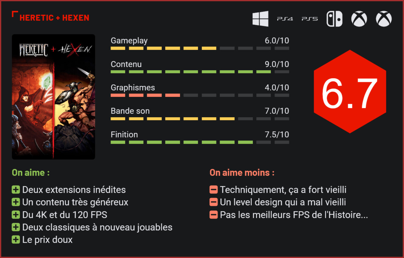 C’est la sortie surprise de cet été. Lors du QuakeCon, Nightdive Studios a annoncé la sortie immédiate d’une compilation rassemblant Heretic et Hexen ainsi que toutes leurs extensions. Ces titres, développés à l’origine par Raven Software sur une version modifiée du moteur de DOOM, avaient redéfini le genre en mêlant action frénétique et univers de dark fantasy. Nightdive Studios s’est forgé une réputation en or dans la remasterisation de classiques du FPS. On leur doit les remasters de DOOM I + II, Quake II ou encore System Shock 2. Avec Heretic + Hexen, le studio relève un défi de taille : ressusciter deux jeux cultes, sortis en 1994 et 1995, qui ont marqué l’Histoire par leurs innovations (système d’inventaire, visée verticale, classes de personnages). Et, surprise pour les fans, il y a du nouveau contenu au programme ! Incarner un mage, c’est fun ! Heretic + Hexen nous plonge dans des mondes médiévaux sombres, où la magie et l’horreur règnent en maître. Dans Heretic, vous incarnez Corvus, un sorcier luttant contre les forces démoniaques du dieu maléfique D’Sparil. L’histoire, fidèle à son époque, est minimaliste mais efficace : des introductions textuelles et des environnements oppressants plantent un décor de fantasy gothique, où chaque niveau semble hanté par une menace surnaturelle. Hexen, sa suite spirituelle, va plus loin en proposant trois classes jouables (guerrier, clerc, mage) et une narration plus complexe, centrée sur les Serpent Riders, des entités maléfiques semant le chaos dans le monde de Cronos. Les deux nouveaux épisodes, Heretic : Faith Renewed et Hexen : Vestiges of Grandeur, prolongent cette ambiance avec neuf niveaux inédits chacun, respectant l’esthétique et le ton des originaux sans chercher à réinventer la roue. L’univers est un savant mélange de Dungeons & Dragons et de folklore horrifique, avec des donjons labyrinthiques, des créatures grotesques et une atmosphère pesante. Le gameplay de Heretic + Hexen est un retour aux sources du FPS, avec une formule qui privilégie l’action brute et l’exploration. Heretic propose un run-and-gun dans la pure tradition de DOOM, où vous enchaînez les niveaux en éliminant des hordes d’ennemis à coups de bâtons enchantés, d’arbalètes magiques et de sorts dévastateurs.. Les mécaniques sont simples : pas de visée précise, pas de rechargement, juste un viseur et une gâchette. Hexen complexifie la donne avec ses hubs interconnectés, ses énigmes environnementales et son système de classes, où chaque personnage (guerrier, clerc, mage) dispose d’armes et de styles de jeu distincts. Le guerrier mise sur la force brute, le clerc sur un équilibre entre magie et combat, et le mage sur des sorts à distance, offrant une variété bienvenue pour l’époque. Nightdive Studios a peaufiné l’expérience sans trahir ses origines. Les améliorations incluent un carrousel d’armes pour un accès rapide, des hotkeys pour les objets (une révolution pour Hexen), et une option d’armes renforcées qui réduit la sensation d’ennemis trop “spongieux”. La visée verticale, révolutionnaire en 1995, est désormais fluide grâce à un support moderne des contrôleurs, et un système de marqueurs de quête sur la carte automatique corrige l’un des principaux défauts de Hexen : son exploration parfois frustrante. Ces ajouts rendent les jeux plus accessibles, mais les puristes peuvent désactiver ces options pour retrouver l’expérience originale. Le jeu tourne désormais en 4K et 120 FPS. Les combats restent exigeants, avec des ennemis nombreux et des ressources limitées. En particulier les boss. Les nouveaux épisodes conservent cette difficulté croissante. Comparé à des titres modernes comme DOOM Eternal, qui mise sur une mobilité frénétique, ou Shadow Warrior 3, qui intègre des éléments de parkour, Heretic + Hexen reste ancré dans une approche minimaliste : courir, tirer, explorer. Une simplicité qui plaira aux amateurs de jeux nostalgiques. Alors bien sûr, tout cela a furieusement vieilli. Les niveaux sont atrocement linéaires dans Heretic, plus labyrinthiques dans Hexen. Les mécanismes sont répétitifs aussi : activer un interrupteur, obtenir une clé pour avancer. Et techniquement, ça a salement vieilli, même si ça garde un certain charme. Contrairement à un Doom on ne recommanderait toutefois pas ce Heretic + Hexen à tout un chacun mais plutôt aux vrais passionnés de FPS rétro. Il faut l’avouer, Nightdive les a choyés avec deux campagnes inédites, l’ajout de l’extension d’Hexen, du multijoueur en ligne jusqu’à 16 joueurs, le support des mods, des améliorations de gameplay… Autant dire que pour 15€ environ, on en a largement pour son argent. On regrette toutefois que les développeurs n’aient pas davantage retravaillé l’esthétique du jeu, car de facto, les 2 titres ont vieilli. Certes, le pixel art a son charme et oui, le jeu a été optimisé avec un affichage 4K en 120 FPS. Mais côté graphismes à proprement parler, presque rien n’a changé. On aurait aimé un travail plus substantiel sur la technique. La bande-son, remaniée par Andrew Hulshult (DOOM Eternal), est à l’inverse un des points forts. Les pistes originales, déjà emblématiques, alternent avec des remixes modernes qui amplifient l’ambiance oppressante. Les bruitages, des cris des monstres aux éclairs magiques, sont percutants et nostalgiques. Les puristes peuvent basculer vers la bande-son d’origine via un menu dédié, une attention qui témoigne du soin apporté par Nightdive. Conclusion C’est la sortie surprise de cet été. Xbox a confié à Nightdive Studios les remasters de Heretic et Hexen, deux FPS légendaires de l’ère des 16/32 bits qui s’étaient distingués par leur gameplay mêlant magie et combats au corps à corps dans un univers dark fantasy. Et pour les fans, il s’agit d’une formidable su