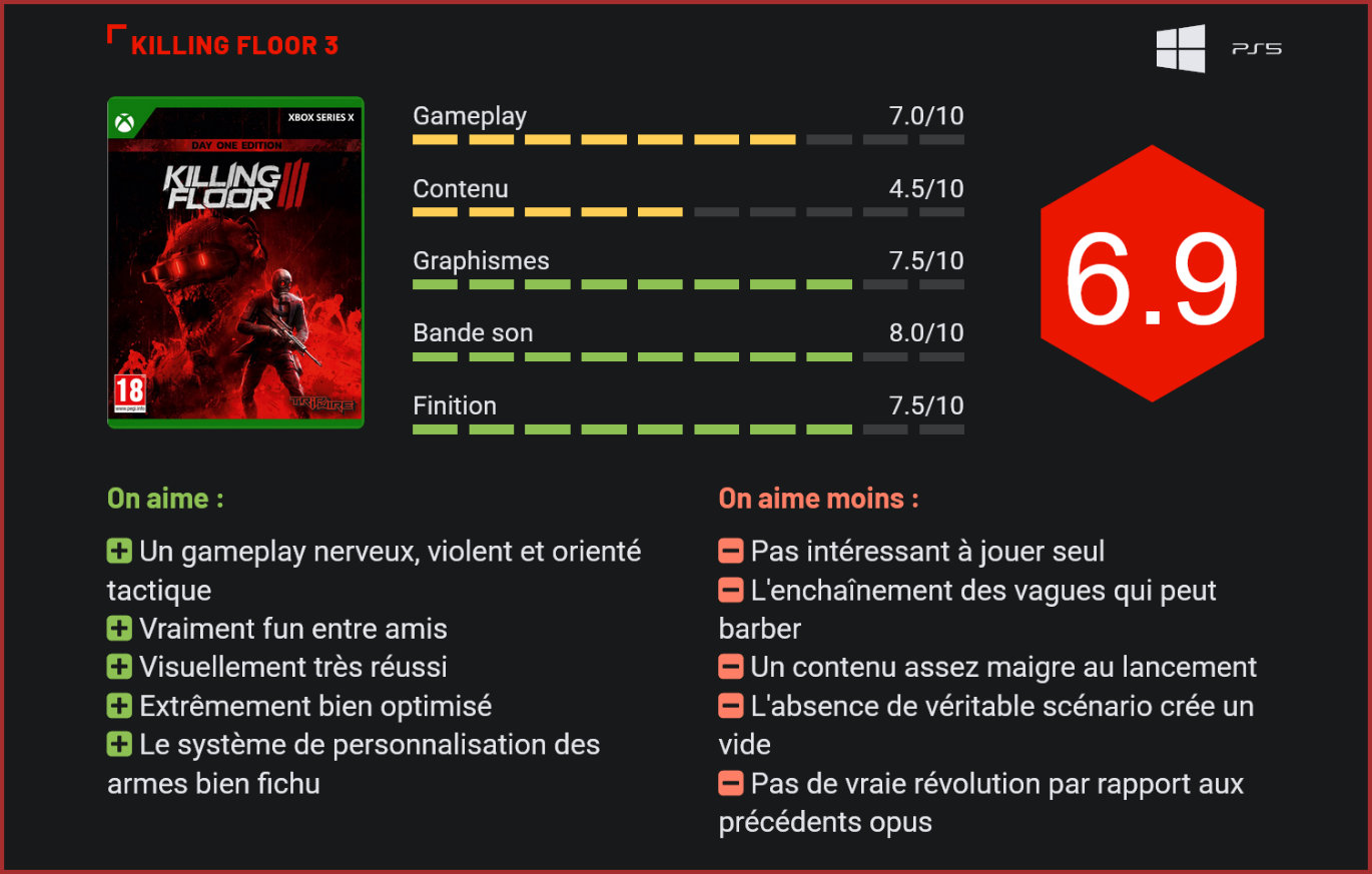Killing Floor 3 est-il la boucherie jouissive attendue ou un simple recyclage de son prédécesseur ? Entre gore assumé, coop survitaminée et contenu au lancement trop maigre, voici notre verdict. Drôle de parcours que celui de la saga Killing Floor. A l’origine, il s’agissait d’un mod sorti en 2005 pour le jeu Unreal Tournament 2004 dans lequel, comme dans la saga actuelle, il s’agit d’affronter des vagues successives de zombies sur diverses cartes, le tout en multijoueur. Face au succès croissant du mod, le studio Tripwire Interactive décide d’en racheter les droits, d’embaucher les quatre moddeurs et de partir sur la création d’un titre à part entière. Un premier jeu sortira en mai 2009, suivi d’une suite sept ans plus tard, puis d’un troisième épisode cette année. Le problème, c’est qu’en dépit d’une évolution flagrante des graphismes au fil des années et, notamment, le passage à Unreal Engine 5 cette année (et ça se voit, nous y reviendrons), la saga s’est également distingué pour son manque d’innovation. Depuis le mod, le concept est resté le même : un super défouloir gore entre amis, mais une vraie plaie à parcourir en solo. En effet, l’expérience Killing Floor (1, 2 ou 3) ne se parcourt réellement bien qu’à plusieurs. Et pour cause, le mode solo n’est qu’une succession de vagues d’ennemis, avec des objectifs très sommaires sur des cartes plutôt vides. On s’ennuie très vite, et le titre perd alors très vite en intérêt puisque sans campagne et sans réels objectifs. Il est plutôt conseillé, une fois le tutoriel achevé, d’éviter de poursuivre seul et de se trouver des amis avec qui y jouer en ligne. En réalité, le jeu s’apparente à un Left 4 Dead mais sans le scénario, ce qui pourrait en rebuter certains. Bien que génial en multi, le jeu est barbant en solo et lasse extrêmement vite. Par équipes allant jusqu’à six joueurs, l’on se retrouve dans des cartes fermées qui s’apparentent, au final, à des arènes, référence à Unreal Tournament. Cinq vagues d’ennemis s’abattent sur l’équipe, auxquelles il faut bien sûr survivre, tout en accomplissant quelques “tâches” ici-et-là : parcourir X mètres, effectuer X headshots… Le but de ces défis est de vous permettre de remporter des récompenses, comme de l’EXP. A la fin de ces cinq vagues, un boss se présente à l’équipe, qui doit l’éliminer pour terminer la partie. Après chaque vague, vous aurez affaire à un trader, qui vous permet d’acheter du nouvel équipement, des munitions, des armes, mais également de personnaliser celles-ci. Pour le coup, les développeurs ont tout fait pour offrir au joueur une expérience de customisation la plus complète possible. Tout cela se passe à l’Armory, un atelier personnel complet où chaque mod ajouté à l’arme a un effet et n’est pas purement cosmétique. Avec ces mods, vous pouvez logiquement modifier les performances de l’arme (puissance, cadence de tir, vitesse de rechargement…), mais également lui ajouter des effets puissants comme unn jet d’acide ou un lance-flamme et enfin ajouter des optiques et autres accessoires.. Pour pouvoir le faire, vous allez devoir dépenser des matériaux péniblement récupérés durant les missions sur des ennemis ou grâce à l’accomplissement d’objectifs. Bien sûr, il existe un nombre d’emplacements de mods limités pour éviter de se retrouver avec tout et n’importe quoi. Et il est également possible de sauvegarder quelques configurations pour les racheter à chaque partie et ne pas devoir tout reconfigurer. Visuellement, KF 3 est une vraie pépite, grâce, notamment, aux merveilles de l’Unreal Engine 5. Pour parcourir les niveaux, le jeu vous propose d’incarner l’un des six spécialistes, qui sont Commando, Pyromane, Ingénieur, Tireuse d’élite, Ninja et Médecin. Chaque spécialiste possède ses propres équipements et armes, bien qu’il existe un lot commun d’armes à toutes les classes, permettant de dézinguer les créatures. Ces créatures, ce sont des Zeds. Des sortes de créatures anthropomorphes tantôt difformes, tantôt zombifiées, tantôt clonées, qui veulent faire de vous leur prochain repas. Ils sont l’œuvre d’une expérience scientifique ayant mal tourné, et votre objectif est de les réduire en charpie. Ce n’est pas une façon de parler, puisque le titre joue très clairement la carte de la violence décomplexée et de l’effusion de sang à tout-va. Ce n’est d’ailleurs pas pour rien que le jeu est certifié PEGI-18. Les os éclatent, les crânes explosent et le sang gicle partout au moindre membre arraché. Le titre n’est donc pas à mettre entre toutes les mains, et ce choix du gore à gogo peut ne pas plaire à tout le monde. Ici, c’est dans l’ADN de la franchise, ça s’accorde bien avec les environnements… Parce qu’au final, si le jeu est barbant quand on y joue tout seul, il se transforme totalement une fois les parties multi lancées. Ces véritables boucheries sont d’une jouissance sans nom et c’en devient presque stratégique de jouer entre amis. D’autant qu’ils existent des modes de difficulté pêchus qui apportent un réel challenge, avec ce mode “Hell on Earth” qui ne nous donne plus aucune seconde de répit. D’autres très bonnes idées nous sont également proposées, comme le Zed Time, une sorte de jauge à remplir avec des headshots et permettant, une fois remplie, de déclencher un slow-motion bien gore. Entre les vagues, l’on peut également activer des outils qui facilitent notre partie, comme une tyrolienne ou des tourelles. Bien que très nombreux, les Zeds sont largement inspirés de ceux de Killing Floor 2, preuve s’il en est du manque d’inspiration des développeurs. Visuellement, le titre fait un très grand bond en avant par rapport avec ses prédécesseurs grâce, en grande partie, à l’introduction de l’Un