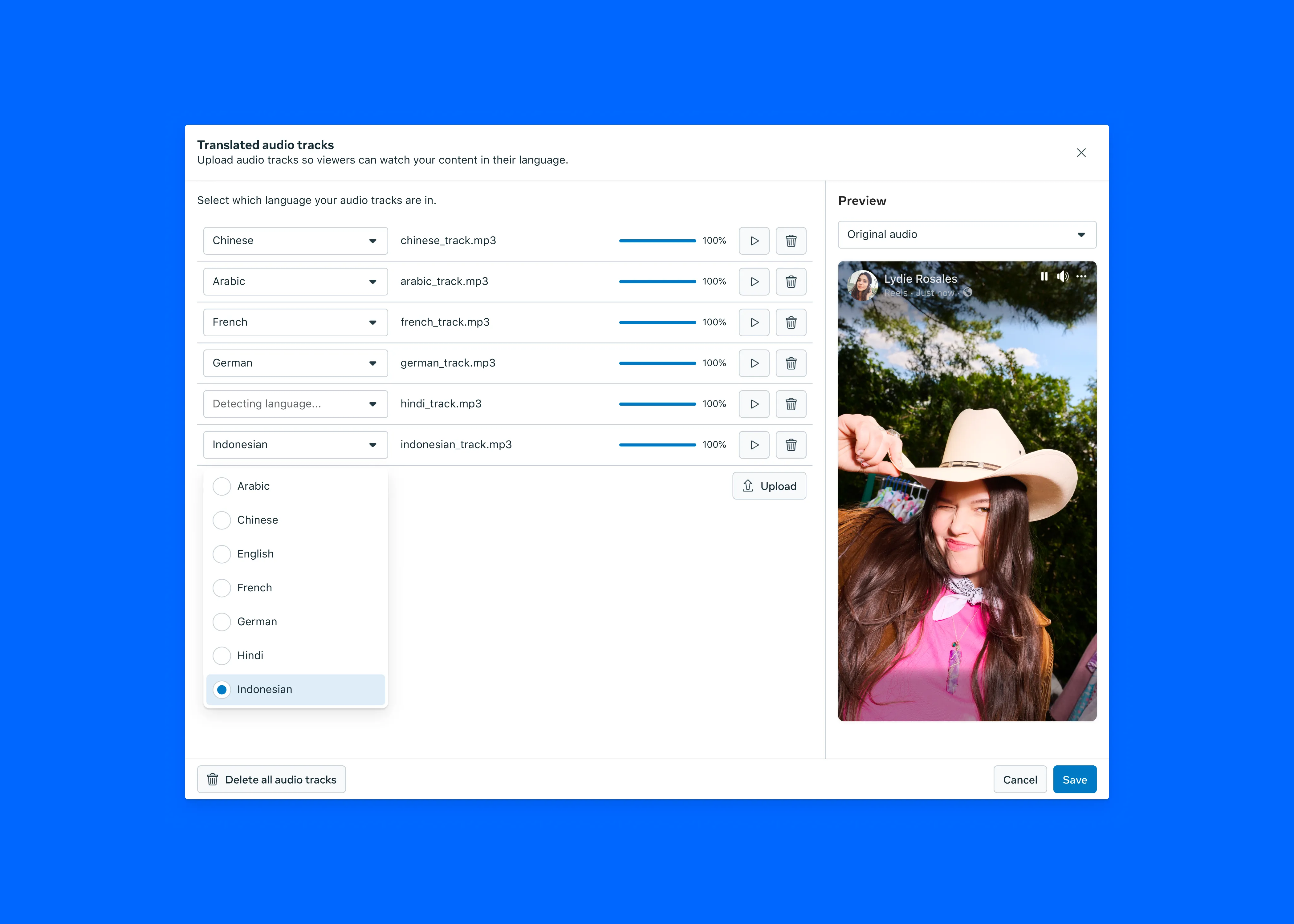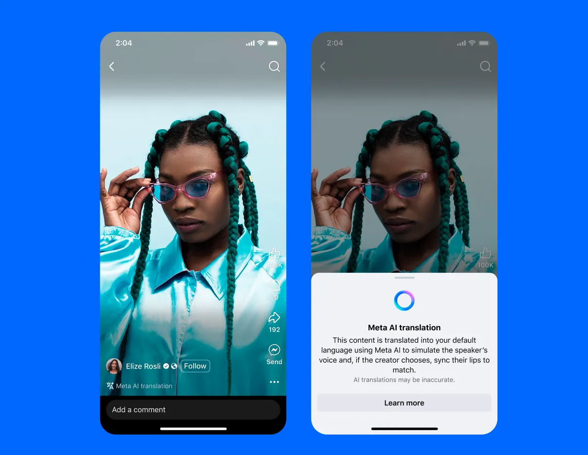 Meta, la maison mère de Facebook et Instagram, continue à élargir le champ d’application de Meta AI. Cette fois, elle met à profit son outil pour permettre aux créateurs des réseaux sociaux mentionnés de doubler automatiquement leurs contenus, et ce, avec leur propre voix. Que ce soit sur Facebook ou Instagram, il est possible de créer des reels pour partager du contenu avec d’autres utilisateurs. Comme toujours avec les contenus vidéo, la seule véritable barrière pour toucher un public toujours plus large, c’est celle de la langue. Meta compte bien remédier à ce problème en lançant dès à présent les traductions Meta AI. Crédits : Meta Concrètement, grâce à son outil basé sur l’intelligence artificielle, la société américaine offre la possibilité aux créateurs de créer automatiquement un doublage dans une autre langue. Meta AI se charge de la synchronisation labiale et reprend votre voix pour le doublage. En d’autres mots, c’est comme si vous parliez naturellement une autre langue. Quelques restrictions sont toutefois de la partie. Pour utiliser la fonctionnalité, il faut avoir au moins 1 000 followers sur Facebook ou disposer d’un compte public sur Instagram. À l’heure actuelle, la traduction ne se fait que de l’anglais vers l’espagnol ou inversement. Néanmoins, Meta promet d’intégrer d’autres langues à l’avenir, dont le chinois, l’allemand et le français si on en croit la capture ci-dessous partagée par l’entreprise. Précisons que la fonction est limitée à deux intervenants et demande de limiter au maximum les fonds sonores. Crédits : Meta Le fonctionnement de l’outil est pour sa part assez simple. Une fois que vous avez fini votre reel, vous avez une option “traduire votre voix avec Meta AI”. Quelques options permettent de valider la synchronisation labiale (il faut veiller à être bien face à la caméra et à ne pas couvrir sa bouche) et à opter pour un aperçu du rendu avant la publication. Dans ce dernier cas, vous pouvez ainsi valider la traduction ou simplement l’annuler pour partager le reel uniquement dans sa version originale. Au total, vous pouvez associer 20 pistes audio à une vidéo, ce qui est l’assurance de toucher un public toujours plus large.