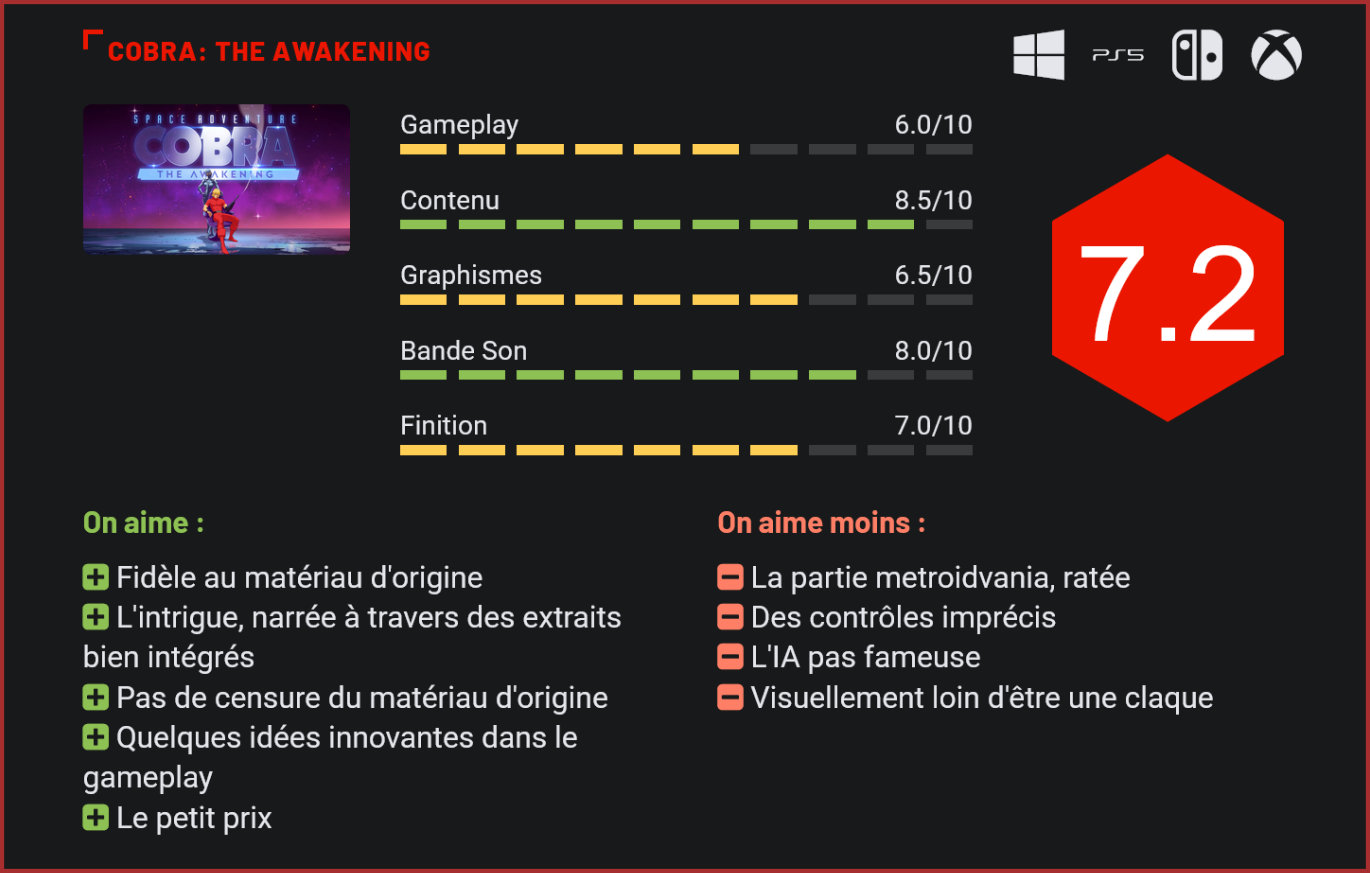 Si, comme nous, vous vous remémorez l’excellence de l’animé Space Cobra, vous étiez sans doute curieux de voir ce que le studio Magic Pockets était capable de faire avec cette licence culte. S’il n’est pas parfait, le jeu séduit par son charme nostalgique et ses mécaniques originales. Ce n’est pas le studio de Microids le plus talentueux. Mais Magic Pockets s’en était pas trop mal sorti avec ses adaptations des Schtroumpfs. De là à confier un studio une licence aussi culte que Space Cobra, il y avait toutefois un pas que tout le monde n’aurait pas franchi. Microids est toutefois un éditeur qui est connu pour ses prises de risques. Les résultats sont parfois très décevants, parfois de vraies bonnes surprises, à l’image de l’excellente adaptation du Marsupilami en jeu ou des Fourmis. L’objectif était ambitieux pour le studio : retranscrire l’esprit pulp de l’anime, mêlant action et humour, dans un jeu d’action-plateforme moderne avec des touches de Metroidvania. Et si le résultat se veut fidèle à l’esprit de la série, l’exécution et le level design trahissent un manque de temps et de moyens. Certains panoramas sont très réussis. On ne va pas vous refaire une petite leçon d’Histoire. Si vous aviez toutefois raté cette pépite de l’animation, il convient de faire une petite séance de rattrapage. Perle de la science-fiction, Cobra était parvenu en son temps à imposer son univers unique. Après avoir effacé sa mémoire et modifié son apparence pour échapper à la Guilde des Pirates, Cobra, un pirate de l’espace, se lance dans une quête de revanche avec sa partenaire cybernétique Lady Armaroid. Il va devoir sauver trois sœurs mystérieuses. Le jeu adapte fidèlement les 12 premiers épisodes de l’anime (Resurrection! The Psychogun! à The Dreadful Ultimate Weapon), avec des cinématiques tirées directement de la série et un doublage “modernisé”. Et il faut bien l’admettre, l’utilisation d’extraits de la série en cours de jeu est une excellente idée, le découpage ayant été réalisé avec talent. Certes, il ne faut pas s’attendre à des surprises sur le plan narratif puisque le jeu suit religieusement l’intrigue de la série. Mais le résultat n’en reste pas moins très convaincant. Alors forcément, cette approche semble destiner le jeu avant tout à ceux qui n’ont jamais regardé la série mais en réalité, les fans y retourneront avec plaisir tant l’histoire de Cobra reste intemporelle. Avec son ton léger, son style rétro et son scénario qui part dans tous les sens, Cobra est une œuvre pulp culte, qui méritait une adaptation en jeu brillante. Les commandes manquent cruellement de précision. Pad en main, Space Adventure Cobra: The Awakening est un mélange d’action-plateforme et de run’n’gun, avec des éléments de Metroidvania. Ca se joue bien entendu sur un plan en 2D, à l’ancienne. Et il faut bien admettre que la formule fonctionne plutôt bien, même si le jeu a de nombreux petits défauts. On retrouve ainsi des pics de difficulté assez surprenants parfois. Le level-design a aussi tendance à être mal maitrisé – il ne sera pas exemple pas rare de mourir en sautant car la caméra ne montre pas ce qu’il y a plus bas. Du coup, impossible de réussir un niveau du premier coup… Les ennemis suivent aussi des patterns bien spécifiques et ne vous surprendront jamais. Cobra: The Awakening est un piètre metroidvania. On sent un réel manque d’inspiration dans la création des niveaux, malgré quelques bonnes idées comme les upgrades à récupérer en réalisant des défis secondaires. Les niveaux encouragent aussi une rejouabilité, car certaines zones nécessitent des upgrades comme les bottes magnétiques pour être accessibles. Bottes que vous ne débloquerez que plus loin dans l’aventure… Pourquoi pas ! Des extraits de la série sont intégrés au récit. Si Cobra est un piètre metroidvania, il est plutôt un run’n’gun réussi. Les niveaux impressionnent par leur rythme et surtout la diversité des séquences de jeu, qui enchainent affrontements, puzzles et séquences de plate-forme. L’arsenal du personnage fait aussi la différence. Outre son arme de base, notre héros peut utiliser son Psychogun, qui permet de guider les tirs pour toucher plusieurs ennemis ou activer des interrupteurs. Il devra également briser les boucliers avec son Colt Python 77. Cobra est également capable de sauter, réaliser des dashs, s’agripper avec son grappin, glisser au sol… Et le résultat, c’est un jeu d’action très nerveux, qui a toutefois un gros défaut : un certain manque de précision dans ses commandes. On regrette notamment que Magic Pockets utilise un seul stick à la fois pour tirer dans la direction de son choix et diriger son personnage. Ce n’est pas très pratique. Rassurez-vous, le jeu reste fun. Les combats de boss font également partie des moments forts avec des enchainements originaux. Il faudra souvent utiliser le psychogun pour parvenir à les éliminer. La campagne, découpée en épisodes, se boucle en à peu près 10 heures mais le jeu offre une bonne rejouabilité avec un mode coop en local et les nombreux collectibles à récupérer. Le résultat est donc plutôt convaincant, surtout au prix auquel le jeu est proposé : 29,99€. Un tarif très décent qui nous fera facilement oublier les petits défauts du jeu et son esthétique assez banale. Le jeu parvient à tirer son épingle du jeu grâce à quelques fonctionnalités uniques. Car il faut bien l’avouer, si le jeu est fidèle à l’anime dans son esthétique, il est loin d’être une claque graphique. Les textures restent souvent floues, les arrière-plan manquent souvent de détails et on sent que le titre est livré dans un seul format sur tous les supports – autrement dit, il a été conçu pour une console comme la Switch et les autres versions du titre ne permettent pas de pr