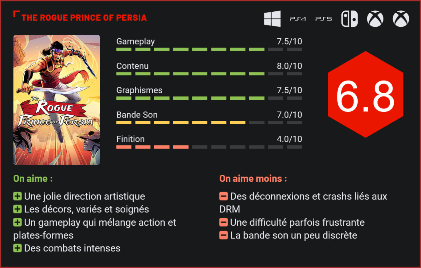 Disponible en accès anticipé depuis un moment sur PC, The Rogue Prince of Persia est enfin disponible dans sa version intégrale. Ce spin-off de la franchise, développé par le studio Evil Empire, les auteurs de Dead Cells, décline la série à la sauce roguelite. Explications. Pour ce spin-off inattendu, Ubisoft s’est associé à Evil Empire, en leur confiant l’une de ses licences les plus convoitées. Les auteurs de Dead Cells ont ainsi choisi de développer roguelite basé sur l’univers de la franchise iconique. Après un an d’accès anticipé, marqué par des mises à jour régulières (nouveaux biomes, armes, équilibrages), le studio livre une version 1.0 peaufinée, intégrant des retours de la communauté pour corriger des défauts dont la direction artistique, qui a fait l’objet d’une refonte complète. Exit la formule aventure classique des Prince of Persia avec ce Rogue Prince of Persia, qui change radicalement les règles du jeu puisqu’il s’agit d’un roguelite s’appuyant sur des mécanismes de die & retry. Concrètement, votre personnage évoluera au fil des parties en gagnant des améliorations, mais il faudra recommencer une série de niveaux plusieurs fois jusqu’à avoir atteint un certain cap. Ce qui pourra frustrer pas mal de joueurs… Le jeu retranscrit plutôt bien l’univers de Prince of Persia. Comme dans les Prince of Persia classique, vous incarnez le Prince, qui est cette fois confronté à l’invasion de sa ville natale par les Huns, menés par le chaman Nogai. Désormais immortel, il pourra se relancer à la poursuite de ses assaillants autant de fois que nécessaire. L’histoire est divisée en trois actes et repose sur des dialogues avec des PNJ, plutôt bien fichue il faut l’avouer. La plupart des jeux du genre ne prennent pas la peine de contextualiser l’action et celui-ci le fait brillamment. Il ne faudra toutefois pas s’attendre à une mise en scène extrêmement travaillée, l’accent est mis ici sur l’action et les biomes – plutôt variés. Divers upgrades permettent d’obtenir des avantages passifs. Alors bien sûr, c’est un roguelite assez particulier, puisqu’il combine plateformes et combats. Le Prince dispose d’un arsenal de mouvements – course murale, double saut, dash, plongeon – qui rendent la navigation intuitive et grisante. Les contrôles, d’une précision chirurgicale, permettent de surmonter des pièges (pointes, lames). Les combats, inspirés de Dead Cells, reposent sur des armes principales (épées, dagues, gantelets) et secondaires (arcs, grappins), combinées à des médaillons offrant des bonus passifs (feu, poison, ralentissement). C’est plutôt bien fichu et il y a finalement pas mal de diversité. Comme dans chaque roguelite, chaque partie sera différente avec des niveaux générés aléatoirement ce qui conserve toujours quelques surprises… Préparez-vous à devoir recommencer plusieurs dizaines de fois chaque section… Reste que si le roguelite est toujours en grande forme, une certaine fatigue s’installe tout de même chez les gamers. Le raz de marée de ce genre ne s’arrête pas et le temps nécessaire à investir dans ce type de jeu fait que beaucoup choisissent d’éviter volontairement ce style de jeu… La progression reste de facto assez frustrante, avec des cendres qui disparaissent presqu’intégralement à chaque mort, des boss coriaces qui nécessitent une maîtrise parfaite du parkour, et un certain manque de diversité dans les ennemis rencontrés. Selon votre niveau, finir l’aventure vous prendra entre 10 et 30 heures. Ce qui est très correct au vu du prix auquel le jeu est vendu : 29,99€. Le jeu souffre de gros soucis de connexion avec ses DRM… D’autant plus que niveau technique, The Rogue Prince of Persia se défend plutôt bien avec son style en cel-shading. Les développeurs ont écouté les retours de la communauté et retravaillé le style graphique du jeu, ce qui est une vraie bonne surprise car lors de sa présentation originale, le titre n’avait pas totalement convaincu. Les décors sont plus détaillés qu’à la sortie, la palette de couleurs est séduisante et les décors traversés sont plein de charme avec leurs jardins suspendus et aqueducs. Côté technique, on n’a pas rencontré de bugs, mais quelques légères saccades. Le plus gros défaut du jeu, c’est ses DRM, qui peuvent causer des déconnexions ou crashs en cours de partie. Le jeu nécessite une connexion permanente à Internet pour fonctionner – ce qui n’a pas de sens pour un jeu solo – et le système d’Ubisoft ne reconnait pas toujours cette connexion. Résultat, ça peut causer des déconnexions intempestives. Ce n’est pas la première fois qu’on rencontre ce problème sur une production Ubisoft, à titre d’exemple nous n’avions pas pu rendre un test d’Oddballs sur Xbox à l’époque car le jeu ne s’était jamais lancé… Et à en juger par les commentaires sur les pages PS5 et Xbox du jeu, les problèmes sont légion. On vous recommande donc d’attendre quelques temps qu’Ubisoft règle le souci, ce qui n’est pas garanti puisqu’à ce jour, Oddballs connait toujours les mêmes soucis… La meilleure façon de jouer au jeu est donc pour le moment de le tester via le Gamepass, sans prendre de risque avec un achat… Conclusion Après un an d’accès anticipé, The Rogue Prince of Persia sort enfin dans sa version définitive. Evil Empire a visiblement écouté les avis des joueurs et entièrement retravaillé l’esthétique et la direction artistique de son jeu. Le résultat est un roguelite très prenant et qui mélange brillamment combats et plates-formes. Le studio maitrise ce style de jeu et ça se sent. Reste que certains joueurs seront probablement laissés sur le carreau à cause de cette approche, qui nécessite un gros investissement en temps avec les essais à répétition, avec une difficulté parfois très frustrante. The 