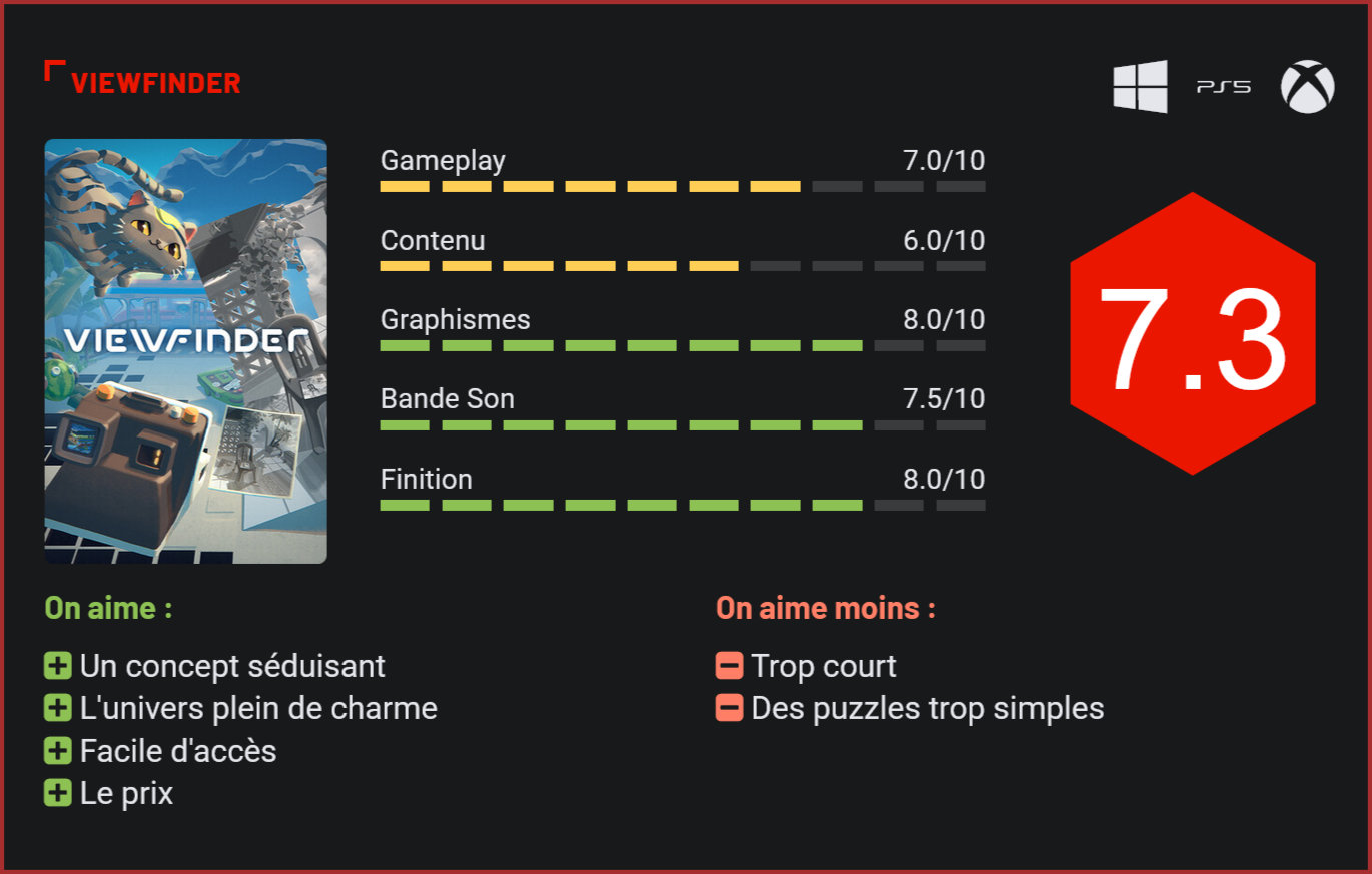 Sorti en 2023 sur PS4 et PC, la pépité indépendante Viewfinder débarque enfin sur Xbox Series, l’occasion de revenir sur cet excellent jeu de Sad Owl Studios. Sad Owl Studios, un petit studio écossais, a fait sensation avec Viewfinder, son premier jeu, qui a raflé plusieurs prix majeurs l’année de sa sortie. De façon assez surprenante, le titre était toutefois uniquement disponible sur deux plates-formes. Son arrivée sur Xbox reste une excellente nouvelle, ne serait-ce que pour lui redonner l’attention qu’il mérite… Visuellement, le jeu est une réussite. Viewfinder vous place dans la peau d’un protagoniste anonyme explorant une simulation virtuelle pour trouver une solution à l’extinction de la flore terrestre, dans un monde ravagé par une crise climatique. Guidé par Cait, un chat IA à l’accent écossais, vous découvrez les travaux de quatre chercheurs à travers des enregistrements audio et des notes disséminées. Le récit est ici secondaire, ce qui compte c’est avant tout l’expérience. Le jeu se joue entièrement à la première personne et ose une approche originale du puzzle game. Vous utilisez des photographies, peintures ou dessins pour transformer l’environnement 3D. En plaçant une image 2D dans le décor, celle-ci devient une réalité tangible, permettant de créer des ponts, des objets ou des passages. Superliminal proposait une expérience de jeu assez similaire, avec un twist différent sur la perspective. C’est facile d’accès, rafraichissant et incroyablement créatif. Le jeu est vendu 24,99€, un prix attractif. Mais il ne faudra pas en attendre trop de lui… L’aventure se boucle en moins de 6 heures en ligne droite et les challenges ne sont pas très compliqués. La rejouabilité est donc assez faible. S’il parvient à agréablement nous séduire, Viewfinder n’est pas un titre qui marquera l’Histoire du jeu vidéo, et c’est bien dommage tant il avait du potentiel avec son concept unique. Les développeurs n’ont pas été jusqu’au bout de leurs idées et ont préféré livrer un jeu accessible plutôt que de proposer des puzzles plus compliqués. Pad en main, l’expérience est plaisante, mais c’est typiquement le genre de jeu qu’on aurait loué dans les années 90, ou auquel on jouerait volontiers sur le Gamepass. Les puzzles restent faciles à résoudre. Viewfinder parvient également à séduire par sa réalisation solide avec des environnements pastel et des effets de lumière soignés. Le style HD-2D, mêlant sprites et décors 3D, crée une atmosphère onirique, bien que certaines textures font grise mine. L’optimisation est irréprochable, sans bugs majeurs, et la compatibilité Xbox Play Anywhere permet de passer du PC à la console sans accroc. La bande-son, composée de mélodies ambiantes subtiles, soutient l’ambiance contemplative sans voler la vedette. Le doublage de Cait, avec son accent écossais, est charmant, mais les dialogues rares limitent son impact. Les bruitages, des clics de l’appareil photo aux sons des téléporteurs, sont précis et immersifs. Conclusion Sorti il y a 2 ans sur PS4 et PC, Viewfinder refait parler de lui pour sa sortie sur Xbox. Cette petite pépite indé se rappelle à nous avec un portage solide. Si vous étiez passé à côté de cette expérience chill & créative, n’attendez plus ! Il fait partie des titres indés qui méritent le détour, ne serait ce que pour la créativité de son gameplay qui repose sur l’utilisation d’un appareil photo qui vous permet de transformer votre environnement en réalisant des clichés et en les apposant sur l’univers qui vous entoure. C’est gentiment psychédélique, très accessible et délicieusement rafraichissant, même si l’expérience est courte et un peu trop facile à notre goût.