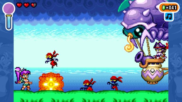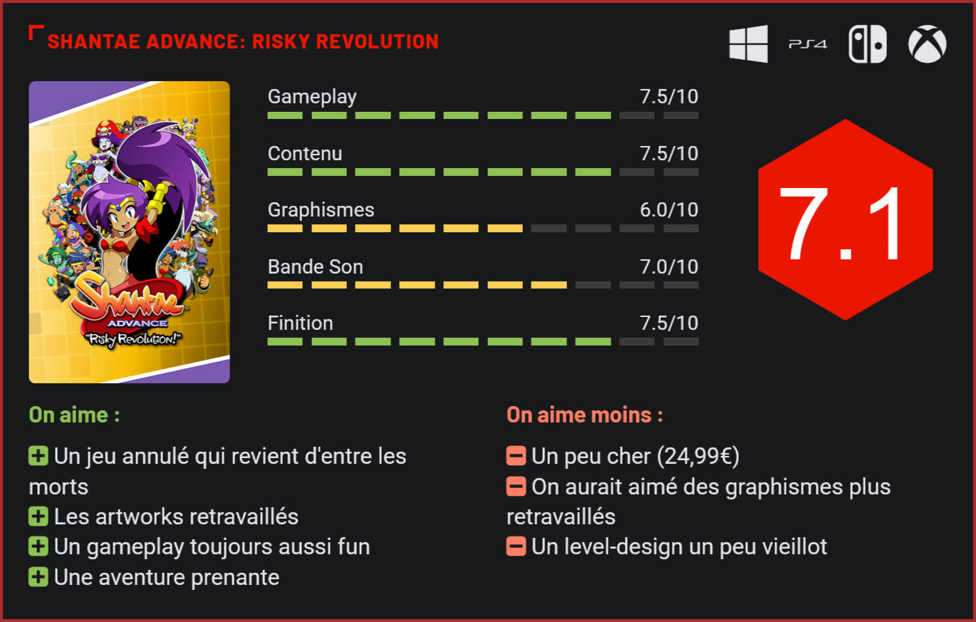 La licence Shantae n’en finit plus de revenir sous le feu des projecteurs. En attendant le prochain volet, ses créateurs nous livrent un portage – inattendu, on l’avoue – d’un épisode annulé, censé sortir initialement sur GameBoy Advance ! Relativement méconnue du grand public, la série des Shantae est toutefois une petite pépite pour les amateurs de jeux de plates-formes et d’aventure en 2D. On ne peut que trop vous conseiller de tenter par vous même l’aventure sur les épisodes Shantae and the Seven Sirens (2020) ou Half-Genie Hero (2016). Avec son humour décalé, son charme rétro, ses personnages pétillants, ses mécanismes de jeu originaux et ses séquences de jeu parfois délirantes, Shantae est une véritable bouffée d’air frais pour le genre. Malheureusement trop peu connue. La sortie de cet épisode est d’ailleurs en soi un petit miracle. Les mécanismes de jeu sont uniques. Initialement conçu pour la Game Boy Advance, Risky Revolution a été annulé en 2004 car le studio n’avait pas trouvé d’éditeur pour son jeu. Il revient d’entre les morts aujourd’hui grâce au support de LimitedRunGames. Alors certes, son prix de 24,99€ vous fera sans doute tiquer – car le jeu a l’esthétique d’un jeu GameBoy Advance, mais pour les fans de la série et les amateurs de jeux rétro, cet épisode n’en reste pas moins un miraculé. Rassurez-vous aussi : WayForward ne s’est pas contenté de porter sur les dernières consoles un jeu qui aurait du sortir sur GBA. Le titre propose un mode “Classique” fidèle au pixel art GBA et un mode “Moderne” avec des portraits HD et une interface affinée. Comme dans les précédents épisodes de la saga, on y incarne Shantae, la demi-génie, qui va devoir combattre la redoutable pirate Risky Boots qui va utiliser une machine pour déplacer les villes vers la côte afin de les piller. Le scénario n’est pas franchement mémorable mais il a le mérite d’amener des situations cocasses et des combats débridés. Et c’est tout ce qu’on lui demandait. Certains combats de boss sont mémorables. S’il est souvent décrit comme un metroidvania en 2D, Shantae Advance: Risky Revolution est en réalité plus proche d’un jeu d’aventure en 2D old-school. On se déplace dans des décors assez linéaires, on enchaine des combats, combats de boss, on explore l’environnement, on se transforme en différentes créatures pour résoudre des énigmes… et ça fonctionne plutôt bien. Car c’est là la principale caractéristique du jeu, il faut user de transformations pour progresser, en singe, éléphant, harpie, sirène, araignée… Le jeu développe aussi un gameplay qui lui est propre : pour combattre, notre personnage utilise sou fouet capillaire, des sorts comme des boules de feu, sa danse du ventre qui lui permet d’attirer tous les objets alentours. Les puzzles exploitent eux brillamment les transformations du personnage mais aussi les manipulations du terrain. Shantae peut basculer entre l’avant-plan et l’arrière-plan ou faire pivoter le terrain, créant de nouveaux chemins et résolvant des puzzles. Attention toutefois, le travail du jouer n’est pas simplifié par l’usage d’une carte ni d’indicateurs. C’est un jeu à l’ancienne. Le vrai plus ? Des affrontements de boss originaux qui rappellent parfois ceux de Sonic par leur intensité. Le design un peu vieillot typique des prods GBA est en revanche son défaut majeur, avec son esthétique datée. Certes, les sprites 2D ont du charme, mais on aurait aimé avoir le choix entre la version originale et une version entièrement actualisée, sans pixel art. Les artworks ont subi un lifting complet. Ne vous attendez pas non plus à un jeu excessivement long, il faudra compter environ 10h pour le boucler. Un mode multijoueur amusant le temps de quelques parties est aussi proposé, mais rien de révolutionnaire. Conclusion Revenu d’entre les morts après son annulation sur GameBoy Advance il y a 20 ans, Shantae Advance: Risky Revolution est une excellente entrée dans la série des Shantae. Le jeu conserve le charme de l’époque avec ses graphismes pixélisés. Très fun à parcourir, décomplexé et rafraichissant, le titre de WayForward est une petite pépite pour les amateurs de rétrogaming. La touche Shantae est toujours là avec des transformations en pagaille, un gameplay inventif, des décors colorés. A 24,99€, c’est peut-être un peu cher pour un jeu GameBoy Advance, mais croyez-nous, pad en main, vous allez prendre votre pied sur cet excellent jeu d’aventure, rescapé d’un autre temps.