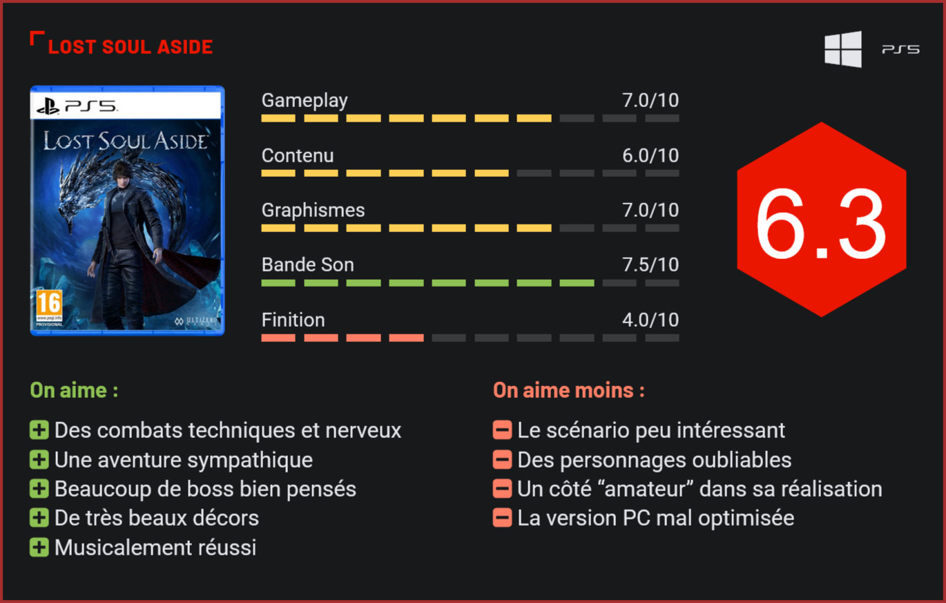 Plus de dix années après s’être montré sur internet, cette production chinoise signée par le petit studio “Ultizero Games” débarque enfin. Lost Soul Aside s’est fait attendre mais risque de ne pas tant marquer les esprits à cause de ses nombreux soucis, malgré quelques qualités indéniables. Montré pour la première fois en 2014 par son créateur, Yang Bing, Lost Soul Aside a commencé comme étant un projet développé en solo. Grâce à un petit engouement sur internet auprès des fans de jeux d’action, le jeu a pris de l’ampleur suite à l’intervention de Playstation et de leur “China Hero Project”, une initiative pensée pour aider les développeurs chinois à développer des jeux sur les machines du constructeur. S’est alors formé le studio Ultizero Games dans le but de mener à bien ce Lost Soul Aside, un jeu d’action typé “Beat them all” inspiré de titres comme Devil May Cry pour son gameplay, mais aussi de Final Fantasy pour son univers. Un titre qui avait la grande ambition de ressembler à une production AAA, mais tout de même développé par une modeste équipe d’une quarantaine de personnes. Le bilan était prévisible, Lost Soul Aside n’a pas les moyens de ses ambitions, mais ne s’en sort pourtant pas trop mal sur certains points. Lost Soul Aside raconte l’histoire de Kaser, un jeune homme qui lutte au sein d’un groupe résistant à l’oppression de l’empire. Alors en pleine mission, des créatures monstrueuses appelées “Kenostrix” débarquent en nombre et aspirent les âmes des humains. Le protagoniste fait très vite la rencontre de Arena, l’esprit d’un dragon avec qui il réalise une alliance, lui donnant de nombreux pouvoirs. Kaser part alors dans une quête où il devra à la fois retrouver l’âme de sa petite sœur Louisa, mais aussi affronter les forces de l’empire. L’inspiration Final Fantasy se ressent très vite dans l’apparence des personnages. Le premier jeu de Ultizero Games est un jeu d’action reprenant une formule classique et strictement linéaire. Étalé sur un scénario durant une quinzaine d’heures, l’aventure va nous emmener dans tout un tas d’environnements de ce monde à travers plusieurs chapitres. Il faut reconnaître de nombreuses qualités esthétiques et techniques à ce projet, à commencer par ses décors inspirés, mélangeant souvent des paysages naturels avec des ruines ou des structures mystérieuses, mais il arrive parfois que le titre bascule dans des environnements bien plus inspirés de science-fiction. Il en va de même pour la musique du titre, souvent très réussie, alternant entre des mélodies apaisantes dans certaines zones et des morceaux épiques pour les combats de boss. À noter que la version PC du titre semble rencontrer de nombreux soucis depuis son lancement, là où la version PS5 s’en sort bien mieux. Malgré un univers assez développé grâce à sa direction artistique et aux nombreuses conversations entre les personnages, le scénario peine tout de même à nous passionner tant il est classique et un peu prévisible. Il faut dire que les personnages n’aident pas tant ils sont peu intéressants, et souvent sans vie à cause d’animations rigides. Ce n’est pas du côté de son écriture que se trouvent les qualités du jeu, même si l’aventure reste très sympathique à suivre grâce à de nombreuses séquences spectaculaires glissées ici et là. La mise en scène oscille malheureusement entre des cinématiques au rendu très amateur, et d’autres bien plus réussies. Les combats de boss sont de très bons moments. Le projet montre un peu plus de qualité là où tout le monde l’attendait. Lost Soul Aside est un jeu d’action très compétent, ses niveaux en couloir réservent de très nombreux combats contre différents types d’ennemis ainsi que des boss souvent réussis. Sans pour autant être aussi brillant qu’un Devil May Cry V ou qu’un Final Fantasy XVI dans ses sensations de combat, le titre se montre très solide en proposant de plus en plus de profondeur au fil du jeu. Kaser débloque plusieurs armes changeant complètement le gameplay mais il faut surtout investir dans différents arbres de compétences afin d’obtenir de plus en plus de techniques pour augmenter nos possibilités de combos. Lost Soul Aside suit quelques tendances encore d’actualité puisqu’une certaine importance est mise sur l’action de briser la garde des ennemis, et le titre y ajoute quelques éléments de RPG comme de l’équipement et des affinités élémentaires. Le jeu reprend d’autres mécaniques habituelles du genre, comme les esquives et gardes parfaites qui nous demandent de prendre des risques tout en sachant nous récompenser gracieusement en cas de réussite. Lost Soul Aside apporte aussi quelques idées peu communes comme sa jauge d’endurance qui limite notre capacité à esquiver, nous forçant ainsi à réfléchir au lieu de marteler la touche, mais cette ressource peut aussi être dépensé dans des prolongements de nos attaques en appuyant sur un bouton au bon moment. Les différentes armes changent complètement le gameplay. Son gameplay est véritablement sa grande force, proposant de la profondeur, beaucoup de nervosité, des idées intéressantes et de bonnes sensations. Le titre opte aussi pour une formule classique qui a fait ses preuves. Les environnements sont linéaires, mais proposent quelques ressources et défis bonus cachés ici et là, une approche qui se veut très simple, mais aussi très efficace. Pas de fioritures, Lost Soul Aside va droit au but en nous proposant ce qu’il fait de mieux, à savoir une aventure pleine d’action et de combats. Le titre se montre parfois plutôt exigeant, en particulier lors de ses combats de boss, mais plusieurs outils permettent de se faciliter la vie (le jeu ne possède pas de modes de difficulté pour notre première partie, mais nous donne très vite des acces