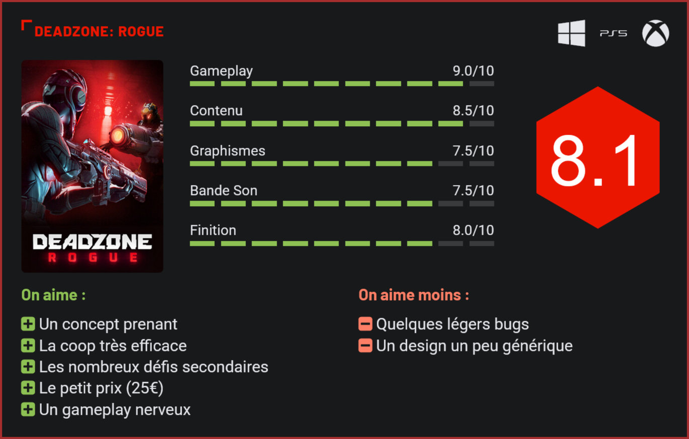 Dernier-né du studio Prophecy Games, auteur du très controversé Tribes 3: Rivals, Deadzone: Rogue est un FPS roguelite se déroulant dans l’espace qui nous rappelle Dead Space avec son atmosphère oppressante. On aurait pu penser que Prophecy Games finirait par disparaitre après le lancement chaotique de Tribes 3: Rivals, abandonné peu après sa sortie en accès anticipé. Le petit studio de développement a toutefois avancé sur un autre projet, baptisé Deadzone: Rogue. Avec ce titre, il est venu avec une proposition originale : un petit FPS sans ambition narrative qui se présente comme un roguelite. Pas de grosse campagne solo à renfort de cinématiques ni de F2P donc, mais un FPS à l’ancienne qui exploite brillamment la formule roguelite. Et il faut bien l’avouer, le résultat est une excellente surprise. Vous pourrez améliorer vos compétences au fil des parties. Vendu 25€ sur les boutiques digitales (PC, PS5, Xbox Series), le jeu vous place dans la peau d’un survivant sur une station spatiale laissée à l’abandon. Celui-ci découvre vite des cadavres en uniforme et des machines hostiles. Après une première tentative, le joueur décède. Il se rend alors compte qu’il est pris dans une sorte de boucle temporelle, qui le ramène à chaque fois au point de départ en cas de décès… Votre objectif sera clair : progresser un peu plus dans chaque run pour boucler la mission principale ou l’une des missions secondaires. A l’issue de chaque mission remplie, le joueur pourra upgrader les capacités de son personnage, pour se simplifier toujours plus la vie lors des runs suivants… Il pourra ainsi choisir d’améliorer sa santé, l’expérience acquise, les dégâts de son arme principale ou secondaire, etc. etc. Ces petits robots sont vos alliés. Chaque run vous propulse dans une série de salles générées procéduralement à bord de l’ISS-X, dans lesquelles vous affrontez des vagues d’ennemis en accumulant armes, augmentations et ressources. Et il faut l’avouer, les mécanismes de jeu sont sacrément bien pensés. Tout d’abord, parce qu’on démarre systématiquement dans chaque salle avec une phase de furtivité, le joueur étant invisible jusqu’à son premier tir. Ca permet de se positionner comme on le veut selon les challenges et d’aborder différemment le combat. Ensuite, parce qu’au fil des salles le loot fera évoluer votre façon de jouer. On démarre avec un pistolet. Dès la salle 1, on récupère une mitrailleuse ou un shotgun de niveau 1, puis des équipements de protection, une grenade, puis des armes de niveau supérieur ou de qualité supérieure. Tous les 5 niveaux environ, on est aussi invité à améliorer son équipement dans une salle dédiée. Ces améliorations ne sont bien sûr valables que pour le run en cours. Le choix de vos armes définira votre façon de jouer. Et ça a un importance toute particulière puisque les parties sont régulées par les défis sélectionnés, avec une présence ennemie qui varie – d’adversaires redoutables au corps à corps à des fins tireurs. A cela viennent s’ajouter les perks, entre chaque salle également. Certaines transforment radicalement votre style de jeu. Vous aurez le choix entre 3 perks à chaque salle : augmenter vos dégâts de 20% par exemple, avoir droit à une seconde grenade ou ajouter 30% de bouclier additionnel. Certaines compétences apportent un vrai plus comme la possibilité d’ajouter par exemple un petit robot qui viendra vous épauler dans les combats. Ou plusieurs, si vous décidez d’opter pour cette stratégie… Et c’est là que le jeu devient franchement excellent, avec la mise en place de synergies et de combos. Il est possible de créer des builds dévastateurs, qui fonctionneront encore mieux en coopération jusqu’à 3 joueurs. Les combats sont rapides, nerveux, et exigent une maîtrise du déplacement – dash, double saut léger – pour esquiver les tirs ennemis. D’autant plus que face à vous, on retrouve une armée de machines aux compétences variées et des boss bien costauds qui n’hésiteront pas à appeler des renforts. Les salles restent petites et il faudra être capable de se faufiler pour survivre. Avec son ambiance à la Dead Space, le titre fait mouche. Les boss sont costauds et exigent la mise en place d’une stratégie. Alors bien sûr, il ne faut pas s’attendre à y passer des centaines d’heures. Comptez une dizaine d’heures environ pour finir les quelques missions principales et défis secondaires. Bien plus si vous y jouez en difficile en coop. Le fun sera de la partie à coup sûr et l’ennui ne pointera jamais le bout de son nez. Le vrai plus de Deadzone, c’est de proposer à la fois un solo plaisant et un mode coop très agréable. Dans les défis, on retrouve également des modes endless pour chaque zone du jeu. Bref, pour un jeu à 25€, c’est une sacrément bonne surprise. D’autant plus que sur le plan technique, le jeu frôle la perfection. Certes, il a un côté un poil générique avec ses couloirs sans personnalité, mais certaines zones sont plus réussies et globalement, le moteur graphique lui fait plutôt honneur avec une très belle gestion de la lumière et de jolis environnements. Le jeu tourne de surcroit en 90 à 120 FPS, sans ralentissements. On a toutefois noté quelques bugs mineurs comme des ennemis ou robots alliés qui tirent sur des murs. Rien de très grave toutefois. Conclusion On n’en attendait rien, Deadzone: Rogue est toutefois l’une des excellentes surprises de la rentrée. Mêlant FPS, coop et roguelite, ce jeu à part se joue à travers des runs de 20 à 40 minutes. L’objectif : traverser de 10 à 30 zones en massacrant toutes les machines que vous rencontrez, le tout en faisant les bons choix pour améliorer votre équipement tout au cours de la partie. Avec ses mécanismes bien huilés, son côté roguelite brillant, ses gunfights intenses et son ambiance D