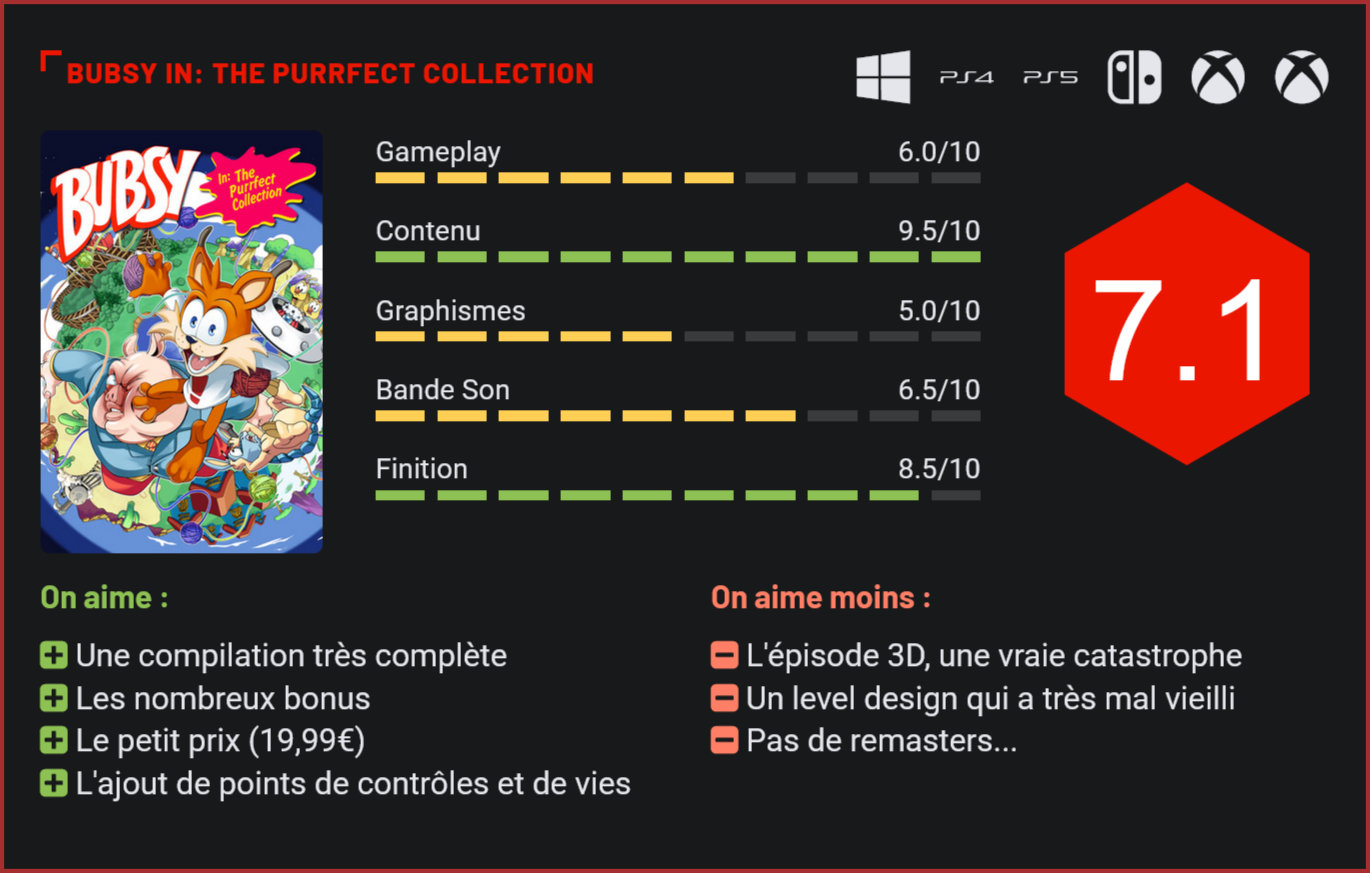Bubsy in: The Purrfect Collection marque le retour relativement inattendu d’un rival de Sonic. Limited Run Games et Atari se sont associés pour lui redonner vie. Malgré ses défauts, Bubsy a marqué une génération de joueurs. Cette compilation est aussi l’occasion rêvée pour jouer aux séances de rattrapage en attendant le nouvel épisode… Comme Gex, Chameleon Twist ou Clover, Bubsy fait partie des “platformers” qui n’ont pas connu le succès monstrueux d’un Mario ou d’un Sonic. Par chance, les platformers rétro ont toutefois à nouveau la cote. Après Gex et Clover, c’est donc au tour de ce classique d’Atari d’avoir droit à une réédition. Le premier Bubsy reste un jeu de plate-forme fun dans la droite lignée de Sonic. Bubsy in: The Purrfect Collection est une compilation qui inclut la totalité des épisodes de la série ainsi que leurs différentes variantes, à savoir donc Bubsy (1993), Bubsy II (1994), Bubsy in: Fractured Furry Tales (Atari Jaguar, 1994), et Bubsy 3D (PlayStation, 1996), ainsi qu’une version « Refurbished » de ce dernier. Si vous ne connaissez rien à la série, Bubsy se positionne comme un clone décalé de Sonic. A la différence de Sonic, on incarne toutefois ici un chat à l’humour décalé, qui doit collecter des pelotes de laine. Alors bien sûr, Bubsy n’a jamais atteint le niveau d’excellence d’un Sonic, le level-design du jeu est très labyrinthique et il est souvent difficile de savoir où il faut se diriger. On y meurt souvent en raison d’une mauvaise visibilité et certains mécanismes de jeu sont maladroits. La hitbox de Bubsy, sensible au moindre contact, rend les morts fréquentes. Heureusement, Limited Run Games a ajouté des vies infinies et des points de contrôle supplémentaires pour rendre l’expérience plus supportable. Le second épisode souffre d’un design mal pensé. Ce sont bien entendu les 2 premiers épisodes, en 2D, qui volent la vedette. Bubsy in: Fractured Furry Tales sur Jaguar est une curiosité, avec des niveaux inspirés de contes classiques. Quant à Bubsy 3D, c’est un très mauvais jeu de plate-forme, le titre qui a signé à l’époque la mort de la franchise. Alors bien sûr c’était l’un des premiers platformers 3D, mais tout de même. Laid à souhait, sans personnalité, vide, avec une caméra qui a du mal à suivre l’action et un level design confus, Bubsy 3D est potentiellement le pire jeu de plate-forme jamais créé. La version « Refurbished » améliore un peu la fluidité, ajuste les angles de caméra et ajoute un support 16:9, mais il faut bien avouer que le titre n’en est pas forcément plus intéressant. Amusant 2 minutes pour le ridicule tout au plus. Bubsy 3D est l’un des plus mauvais jeux de plate-forme jamais pensé. Ceci étant dit, Limited Run a tout de même accordé beaucoup de soin à cette compilation, très complète niveau jeux et versions et qui intègre un tas d’extras très sympathique, des interviews des développeurs, concept arts, illustrations, manuels, publicités d’époque, tout y est pour les fans. A 19,99€, c’est une compilation très généreuse à laquelle on a droit ! La compilation intègre de nombreux bonus. Les versions SNES et Mega Drive conservent par ailleurs leurs graphismes pixelisés, mais bénéficient de filtres optionnels (CRT, lissage) et d’un support 16:9. Bubsy in: Fractured Furry Tales impressionne par ses sprites détaillés, tandis que Bubsy 3D Refurbished tente de polir ses polygones grossiers avec des textures légèrement améliorées. Il ne faudra pas s’attendre à un gros travail niveau esthétique, Limited Run a tenu à rester le plus fidèle possible aux jeux d’origine, et c’est tant mieux. Ceci étant dit, il faut l’avouer, même le tout premier opus a très mal vieilli. Clairement, cette compilation s’adresse donc avant tout aux joueurs nostalgiques qui avaient joué à ces titres à l’époque… Conclusion S’il n’est pas aussi connu que Sonic, Bubsy reste un héros de jeux vidéo qui a marqué son époque. Avec cette compilation, Limited Run et Atari nous livrent un joli hommage à la série. Seuls les deux premiers volets (datant de 1993 et 1994) méritent réellement le détour avec leur gameplay calqué sur Sonic. L’épisode 3D est une catastrophe et n’a que peu d’intérêt. Les différentes variantes aussi. Ceci étant dit, le titre est vendu à 19,99€ et intègre de nombreux bonus dont des interviews des développeurs. Les jeux ont aussi été simplifiés avec l’ajout de vies et de points de sauvegarde, pour notre plus grand plaisir. Avis donc aux fans, qui retrouveront leur héros préféré avec plaisir.