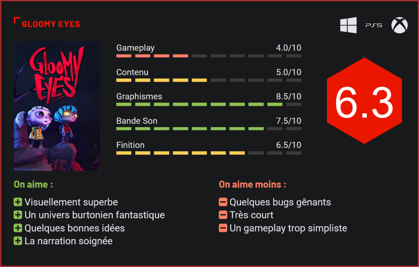 Gloomy Eyes, ce nom vous dit peut-être quelque chose et pas sans raison puisqu’il s’agit de l’adaptation en jeu classique d’une trilogie VR animée qui a fait son petit buzz à l’époque. Développé par le studio belge Fishing Cactus en collaboration avec ARTE France, ce puzzle-game s’inspire assez ouvertement de l’oeuvre de Tim Burton, en nous plongeant dans un monde où un zombie et une humaine défient les interdits pour ramener la lumière. Avec Gloomy Eyes, le petit studio belge Fishing Cactus livre l’un de ses projets les plus ambitieux, et l’un de ses rares jeux consoles. Ils ont choisi d’adapter une oeuvre en réalité virtuelle sortie en 2019, en un jeu type puzzle-game classique. Pourquoi cette oeuvre en particulier ? Tout d’abord, parce qu’elle avait reçu un accueil critique très chaleureux, en étant notamment primée au festival de Sundance. Ensuite, parce qu’avec son esthétique burtonienne et son univers atypique, Gloomy Eyes avait un énorme potentiel. Visuellement, le jeu est superbe. Le jeu nous plonge dans un monde dans lequel le soleil, las de l’humanité, s’est caché, plongeant le monde dans une nuit perpétuelle. Les morts se relèvent en zombies, chassés par les vivants dans un conflit sans fin. Au cœur de cette obscurité, Gloomy, un jeune zombie, et Nena, une fille humaine, nouent une amitié interdite. Une histoire qui aurait très bien pu être écrite par Tim Burton himself, auteur duquel les créateurs de Gloomy Eyes se sont d’ailleurs inspirés pour character design et l’univers graphique. Mélangeant macabre, horreur et amitié, le titre se veut une petite prod’ indé qui sort des sentiers battus. Attention toutefois à ne pas vous méprendre, vous n’êtes pas ici face à un jeu d’aventure mais un puzzle game qui vous plonge dans des dioramas rotatifs. Tout repose sur ce seul et unique concept. On dirige zoomy du bout du stick dans des niveaux artistiquement superbes, qui font office de puzzles. Il faudra y activer des interrupteurs, récupérer des objets, en lancer pour désactiver par exemple une lampe… Des interactions basiques qui donnent l’impression de jouer à une oeuvre qui est avant tout visuelle. Car si l’univers du jeu, son esthétique, sa bande son, nous ont séduit dès la première minute de jeu, il faut le savoir, le gameplay est son plus gros défaut. Certes, l’idée de contrôler deux personnages, Gloomy et Nena est séduisante. On doit passer de l’un à l’autre pour résoudre des puzzles environnementaux. Gloomy, sensible à la lumière, peut lancer des os pour éteindre des lampes ou distraire les zombies, tandis que Nena, agile dans l’ombre, manipule des objets ou affronte les cultistes humains. Les deux idées se complètent à merveille – le jeu aurait d’ailleurs pu être plus agréable à jouer en coop mais les développeurs ont, tout comme dans un Brothers, choisi la voie du jeu solo. L’ennui, c’est qu’en dépit de très bonnes idées, on tourne vite en rond et la formule se veut avant tout contemplative. Les énigmes sont relativement faciles à résoudre, quelques rares séquences d’action viennent heureusement ponctuer l’aventure. La gestion de la caméra est toutefois chaotique puisqu’il n’est pas possible de la contrôler soi même et que celle-ci a tendance à ne pas toujours offrir le meilleur angle. Dans notre aventure, on a aussi rencontré quelques bugs. Les niveaux sont également très courts et ont un level-design assez torturé… Bref, vous l’aurez compris, l’expérience est mitigée – et de surcroit assez courte. C’est sans doute ce qui explique son tarif de 20€. Les quelques énigmes sont globalement trop faciles à résoudre. Ceci étant dit, si le gameplay du jeu est très moyen, il n’en mérite pas moins le détour pour son univers sombre, son scénario plaisant et ses superbes dioramas. Son, esthétique est clairement son plus bel atout. Gloomy Eyes est une merveille. Les décors sont chargés de détails, réalisés en claymotion, comme dans le film The Nightmare Before Christmas, et regorgent de détails macabres – squelettes dansants, lucioles éthérées. C’est l’un des plus beaux jeux indés réalisés avec l’Unreal Engine. Et juste pour ça, il mérite le coup d’oeil. Conclusion Développé par un petit studio belge, Gloomy Eyes est une expérience avant tout narrative qui nous plonge dans un univers Burtonien plein de charme. Visuellement à couper le souffle, le jeu exploite parfaitement le potentiel de l’Unreal Engine. On se croirait tout droit plongé dans le film The Nightmare Before Christmas. Son character design et ses superbes dioramas, chargés de détails valent le détour à eux seuls. L’ennui, c’est que le gameplay ne suit pas. Le concept de puzzle-game est très basique et malgré quelques bonnes idées, on s’ennuie vite devant ce divertissement finalement très contemplatif. Dommage.