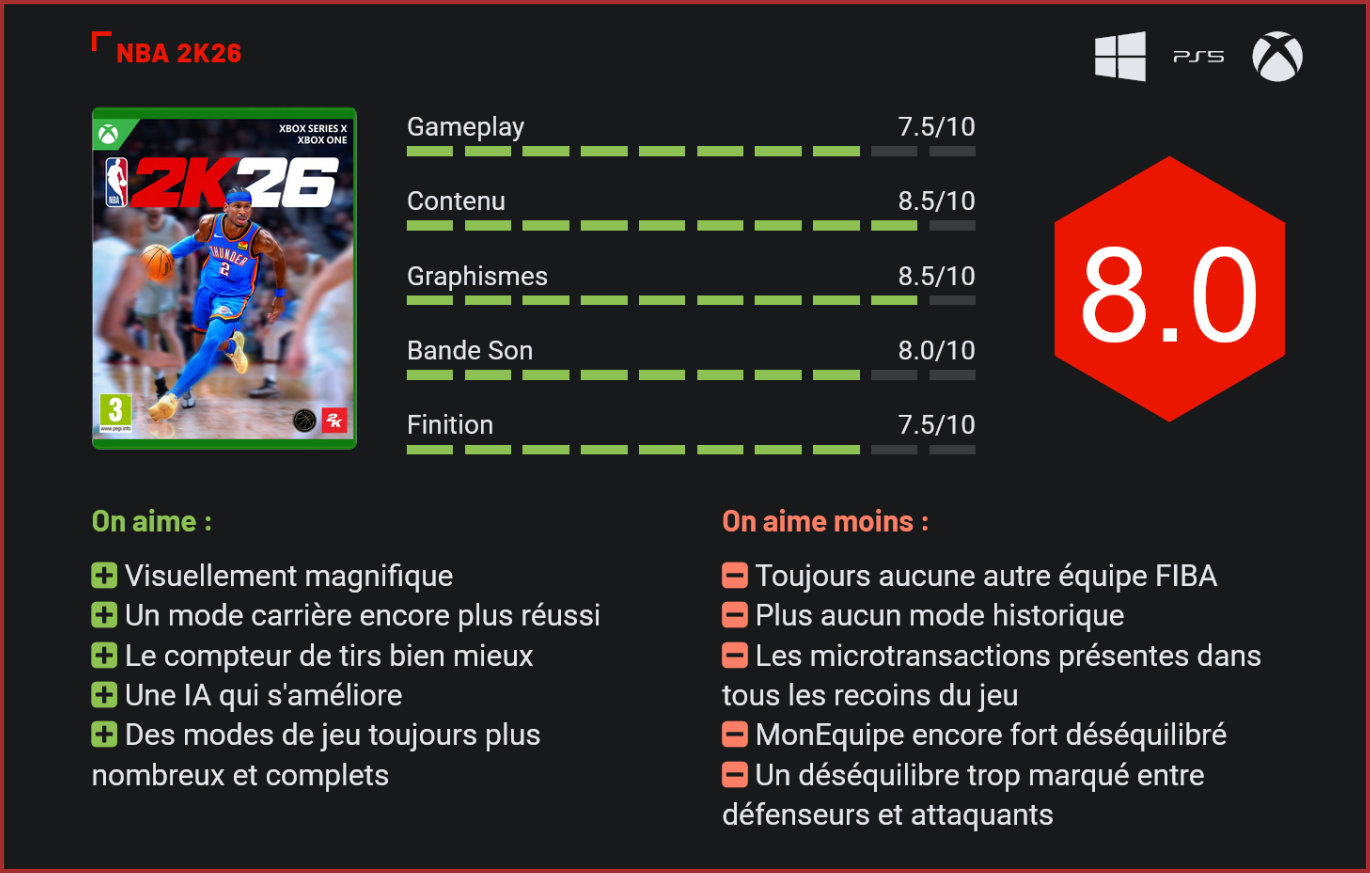 Dunks faciles, trois points à répétition et un Shai Gilgeous-Alexander en couverture : NBA 2K26 a choisi son camp, celui du spectacle offensif. Reste à savoir si le plaisir de marquer compense vraiment une défense trop souvent inexistante. Nouveau tour de chauffe sur le parquet avant le début officiel de la saison. Comme chaque année à la même époque, Visual Concepts et 2K remettent le couvert quelques semaines avant la reprise de la NBA. L’année passée, NBA 2K25 s’était démarqué pour le réalisme de ses matchs et l’ambiance presque copié collée de ce que l’on peut voir à la télévision. Un an plus tard, la recette fonctionne-t-elle toujours ou avions-nous atteint la perfection l’an passé, difficile à dépasser ? Cette année, c’est Shai Gilgeous-Alexander qui est la tête d’affiche de l’épisode. Ce meneur/arrière de 27 ans des Thunder d’Oklahoma City est champion en titre avec son équipe et a éclaboussé la saison de NBA de son talent. Un joueur canadien, qui se démarque grâce à son jeu extrêmement offensif, ayant marqué 32,7 points en moyenne la saison passée. Fruit du hasard (ou pas), ce NBA 2K millésime 2026 accorde une très (trop) grande place à l’attaque. Offensivement, c’est un vrai régal. Défensivement, c’est une vraie galère. Dès nos premières parties, cela se ressent immédiatement. Le réflexe est le même pour tout le monde : lorsque l’on lance un NBA 2K pour la première fois, on se plait à sélectionner notre équipe favorite, son rival et à lancer un premier match pour voir de quel bois se chauffe cette version. Et il faut bien admettre que ce fameux bois semble dopé aux dunks et autres 3 points. Cette année, Visual Concepts introduit une nouvelle jauge de tir, bien plus facile à prendre en mains que celle de l’année passée, malheureusement décriée. Ici, le gameplay favorise clairement un jeu plus offensif, et dès que l’on a le champ libre pour tirer, il semble bien compliqué de rater le panier. Même lorsque la jauge n’est pas dans le vert et n’affiche pas un “Excellent”, les chances de réussir un tir sont grandes. Cela représente une très grande différence par rapport à l’opus de l’année passée, où les défenseurs avaient la mainmise sur le ballon et pouvaient intercepter beaucoup de tirs. Ici, il va falloir s’armer de courage pour contrer les attaques ennemies. Les défenseurs semblent clairement mis à mal dans cet opus, à tel point que même l’IA galère à intercepter les tirs ennemis ou les dunks. Cela devient dès lors beaucoup plus difficile d’accomplir certaines quêtes du mode Carrière par exemple, où il faut parfois marquer X points de plus que l’adversaire. Compliqué lorsque celui-ci ne rencontre qu’une très légère résistance dans la raquette. En revanche, on notera une très importante refonte de l’IA, bien plus intelligente sur les phases d’attaque (encore elles…). Les coéquipiers bougent beaucoup plus et sont même bien plus enclins à vous faire la passe d’eux-mêmes lorsque vous pénétrez dans la raquette. Cette année, le mode Carrière fait la part belle … à l’EuroLeague ! Enfin, en version alternative… Abordons justement le sujet de la Carrière. Notre cher MP est de retour dans une nouvelle itération du mode histoire, avec cette fois-ci une particularité bien sympathique : l’EuroLeague. Enfin, il s’agit d’une version qui n’est pas sous licence, mais elle fait beaucoup de plaisir à voir. En réalité, MP ne va pas suivre la trajectoire habituelle des stars de NBA qui leur demande d’aller à l’université avec une bourse. A la manière d’un Wembanyama ou d’un Doncic, MP va passer par le championnat européen pour se faire un nom et espérer attirer la convoitise des recruteurs de NBA, son rêve absolu. Ainsi, le rookie va devoir choisir entre le Basquet Madrid ou le Paris FC Basket et enchaîner une poignée de matchs, équivalent à trois heures de jeu, pour arriver jusqu’à la Draft NBA et se voir courtisé par un club. Mais la particularité de cet épisode est que, pour une fois, le choix ne vous appartient pas. Vous serez ainsi envoyé dans une première équipe que vous appréciez ou non, et il ne tient qu’à vous de réaliser de grands matchs pour vous faire repérer par d’autres grandes équipes, vous laissant ensuite le choix de la franchise à rejoindre. Jouer ces matchs est très important, puisqu’ils rapportent des VC, la traditionnelle monnaie du jeu permettant d’acheter de l’équipement. Les VC serviront aussi à améliorer votre sportif. Entre deux matchs, Visual Concepts a ajouté la possibilité de changer rapidement d’archétype, et ce, afin de modifier le style de votre personnage. L’intérêt d’une telle fonction est important, bien qu’il mette en lumière un problème persistant de cet épisode : le pay2win. La monnaie virtuelle du jeu est omniprésente dans le titre, et pousse quasi systématiquement à passer à la caisse pour améliorer son personnage, lui acheter de l’équipement ou, surtout, avoir la meilleure équipe dans MonEquipe. Le mode MonGM vous emmène toujours dans ce style de RPG scénarisé. Cette alternative version NBA de l’Ultimate Team d’EA Sports en reprend, comme chaque année, tous les codes. Le sentiment qu’on n’aura une très bonne équipe qu’en achetant des VC supplémentaire, et donc en dépenser des deniers en plus commence à devenir pesant. Pourtant, MonEquipe se dote d’une nouveauté grandement attendue et réclamée par les fans : l’intégration des joueuses de WNBA. Désormais, hommes et femmes pourront se faire des passes dans ce mode, avec pour objectif de constituer la meilleure équipe possible. On regrettera toutefois un manque d’équilibrage entre les hommes et les femmes qui, bien qu’elles sont plus agiles et rapides que nombre d’hommes, restent trop facilement contrées par leurs homologues masculins