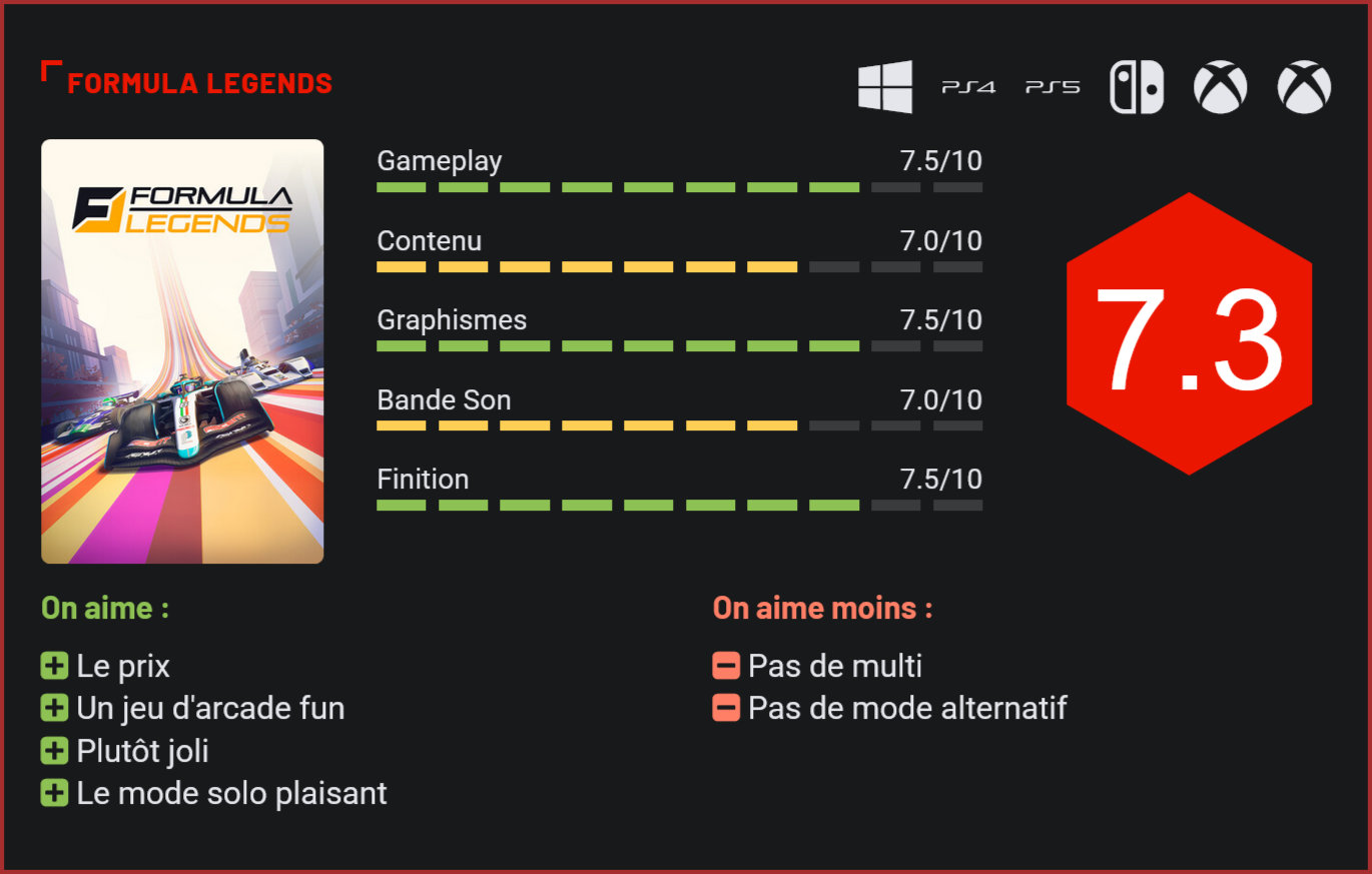 C’est le petit jeu indé qui pourrait bien surprendre les amateurs de Formule 1 en cette période pourtant chargée en sorties. Formula Legends est l’œuvre passionnée d’un studio italien qui nous propose de revivre l’histoire de cette discipline à travers un jeu d’arcade très fun. Il faut bien l’avouer, pour les amateurs de F1, il n’y a pas grand chose à se mettre sous la dent en dehors de l’incontournable simulation annuelle. Il y a certes eux quelques jeux indés ces dernières années, mais ceux-ci souffraient d’un budget assez restreint et les résultats n’étaient guère convaincants. Avec Formula Legends, le petit studio milanais 3DClouds tente à son tour sa chance, avec une formule plus arcade que jamais. Visuellement, le jeu est plutôt réussi. Budget serré oblige, le titre fait l’impasse sur les licences officielles. Un élément qui bloquera sans doute pas mal de passionnés de course automobile. Mais qu’ils se rassurent, le studio a fait son possible pour limiter la casse en renommant les grand prix, écuries et pilotes le plus fidèlement possible. Le circuit de Spa Francorchamps est ainsi renommé le Grand Prix d’Ardennes, McLaren devient McLauden et Hamilton se transforme en Hammerston. La grande originalité du jeu, c’est de proposer un mode Histoire qui retrace l’aventure automobile, des années 60 avec des véhicules primitifs aux années 2020. Le tout, à travers un scénario prenant, qui vous fait revivre les moments phares. Alors bien sûr, c’est un jeu arcade. Il ne faut pas s’attendre à un niveau de réalisme à la F1 2025 et l’univers graphique chibi est là pour nous le rappeler. Mais le titre n’en fait pas moins des tas pour nous prouver qu’un jeu arcade peut aussi avoir une vraie profondeur. On retrouve ainsi par exemple une météo dynamique, une usure des pneus, une physique qui récompense une conduite technique, gestion du carburant, dommages sur le véhicule, pit-stops… Tout est là. On retrouve au total 16 pilotes et 14 circuits iconiques. Le vrai plus ? Le jeu se veut personnalisable avec des perks qui créent des synergies entre pilotes – un « whisperer » de pneus excelle sur circuits abrasifs par exemple. De très bonnes idées qui viennent ajouter une touche de stratégie au jeu, pourtant très arcade dans son style de conduite et dans son style de vue. Les développeurs ont de facto opté pour une vision top-down, typique des jeux d’arcade de la grande époque, comme MicroMachines. Le style chibi trahit le style arcade du jeu. Pour finir le jeu, il faudra environ 15h, beaucoup plus si vous visez le 100% en difficile. Plutôt pas mal pour un jeu vendu 20€ environ. Le contenu annexe est modeste : pas de quêtes secondaires, un championnat personnalisable comme seule alternative et surtout pas de multijoueur en ligne. Ce qui est franchement dommage vu combien le jeu se prêtait bien au compétitif. Visuellement, Formula Legends s’en sort aussi très bien, il tourne sous l’Unreal Engine 5 et adopte un style chibi qui lui convient étrangement bien. Le studio n’a pas hésité à mettre le paquet côté effets visuels avec des reflets pluvieux éblouissants sur asphalte mouillé et des filtres ère-spécifiques (sépia 60s, CRT 90s). Les voitures, détaillées (ailes flexibles, pneus qui s’usent visuellement), contrastent avec des environnements vivants. Conclusion Sorti de nulle part, Formula Legends est une vraie bonne surprise et un très bon jeu de course arcade qui vous fera (re)découvrir les grandes évolutions technologiques du secteur et son histoire. Il faudra en revanche composer avec l’absence de licences officielles pour les fans et surtout l’absence de mode multijoueur. A 20€, la proposition reste très correcte, surtout que le jeu est fun et plutôt joli, mais on aurait tout de même espéré une proposition plus riche, quitte à débourser quelques euros de plus…