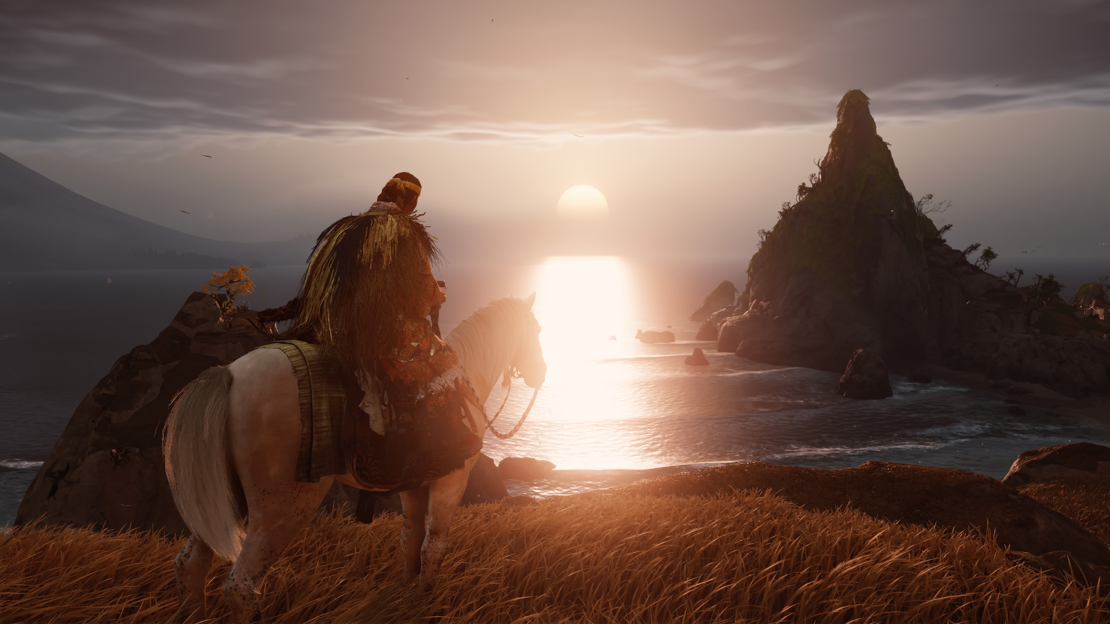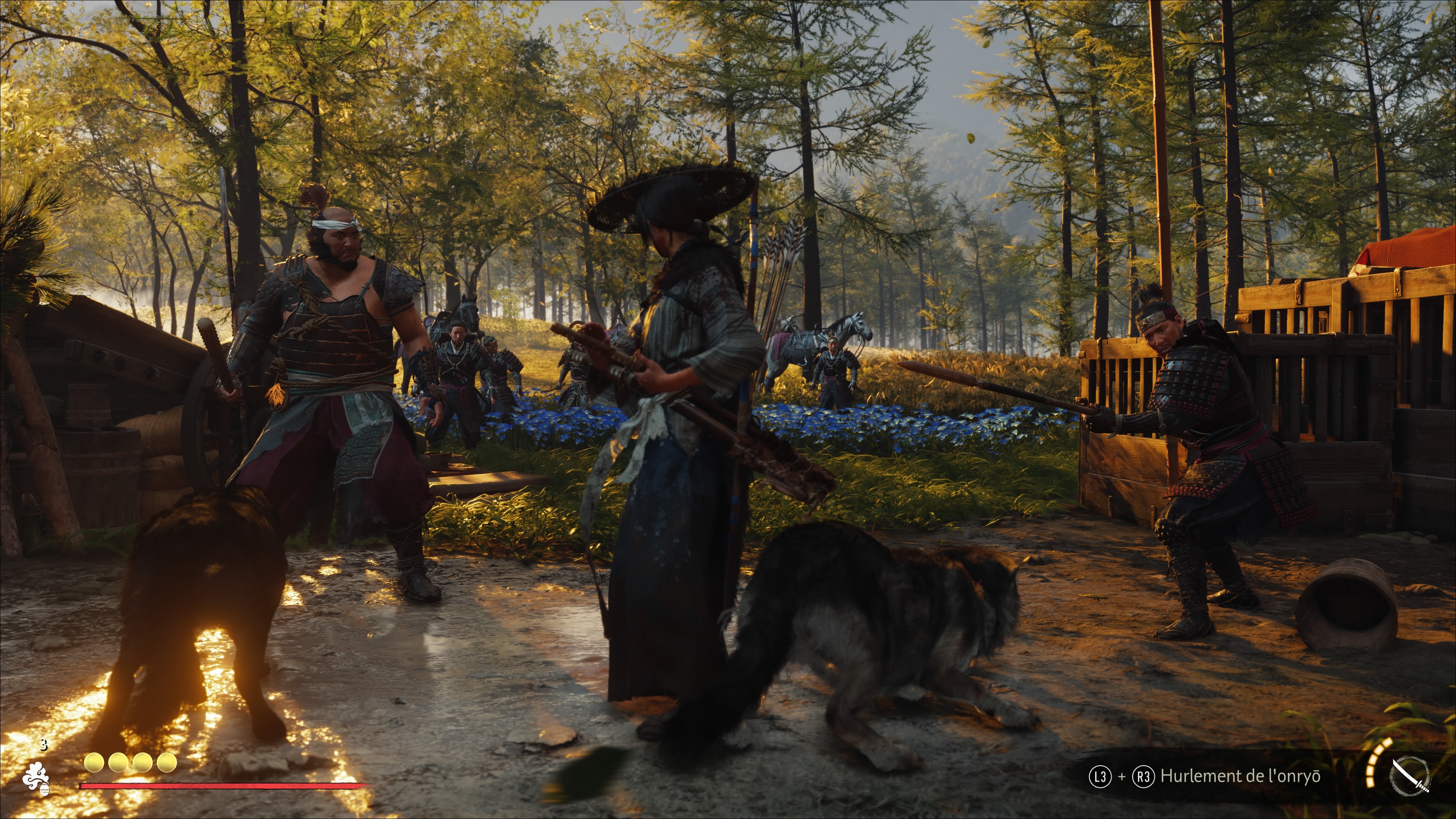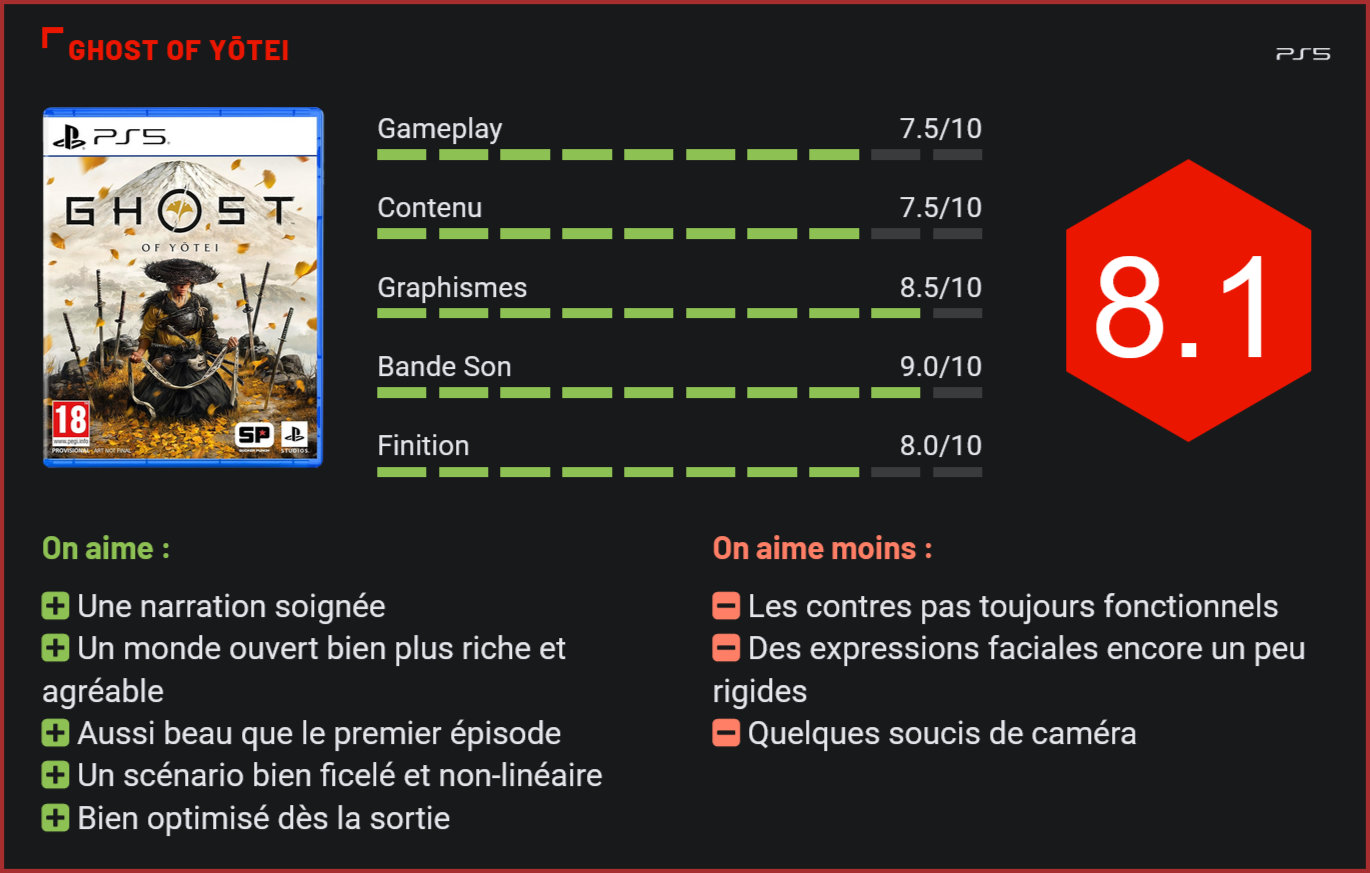 Après l’épopée de Jin Sakai, Sucker Punch revient avec Ghost of Yōtei et une nouvelle héroïne glaciale, Atsu, dans une quête de vengeance aussi sanglante qu’envoûtante. Il y a déjà cinq ans, Sucker Punch signait un retour (presque) triomphal après six ans d’absence avec le très remarqué Ghost of Tsushima. Cette licence inédite nous plongeait dans le Japon féodal du XIIIe siècle alors assiégé par les envahisseurs mongols menés par Kotun Khan. Jin Sakai s’imposait alors comme le protecteur de l’île de Tsushima, revêtant le titre de “Fantôme” tant redouté par les Mongols. Avec Ghost of Yōtei, les développeurs américains nous proposent un brusque voyage dans le temps, 300 ans plus tard. 1603. Le titre suit l’histoire d’Atsu, une jeune femme en quête de vengeance depuis l’assassinat lâche et brutal de ses parents et de son frère. Laissée pour mort par le Seigneur Saito, Atsu se met en quête de retrouver Saito et les Six de Yōtei afin de leur faire payer le massacre de sa famille et d’innombrables innocents. Exit donc la défense de l’île face aux envahisseurs, c’est une quête de vengeance qui guide Atsu dans cet épisode. Elle portera d’ailleurs le nom d’onryō, ce qui signifie “esprit vengeur” en japonais. Pour venger sa famille, Atsu part donc à la poursuite des Six de Yōtei. Elle acquiert la réputation d’un personnage froid, difficile à cerner et surtout prête à tout pour accomplir sa quête. Au début de l’aventure, Atsu se présentera comme un personnage froid, auquel on s’attache bien plus difficilement qu’on avait pu le faire par le passé avec Jin. Mais c’est au fil des heures de jeu que l’on apprend à connaître la jeune fille d’une vingtaine d’années. Ses démons font ressortir sa part la plus dangereuse en combat, mais les différentes rencontres qu’elle fera au fil de l’aventure, son amitié forte avec une louve et son amour pour sa terre natale d’Ezo qu’elle veut sauver des griffes du Seigneur Saito en font un personnage que l’on veut apprendre à connaître davantage. Et ses quelques petites plaisanteries dans les lignes de dialogue ne font qu’accentuer notre envie de la connaître davantage encore. Voici Atsu, le personnage principal de cet épisode. Impassible et froide, elle se montre en réalité de plus en plus attachante au fil de l’aventure. Mais via cette quête de vengeance et cette traversée de l’île d’Ezo autour du magnifique mont Yōtei, les équipes de Sucker Punch nous transmettent leur amour indéfectible pour le Japon, sa culture et ses 1001 richesses. Déjà dans le premier épisode, l’on ressentait un monde ouvert attachant, fourmillant de références au Japon féodal et à sa poésie. Cette suite ne fait que confirmer tout le bien que l’on pensait d’une narration déjà magistrale et envoûtante, ne nous donnant qu’une envie : continuer à explorer pour découvrir toutes les richesses de ce monde ouvert et ses beautés. Jin Sakai jouait de la flute, aussi connue sous le nom de shakuhachi, tandis qu’Atsu nous envoûte de son shamisen, une guitare japonaise dont toutes les subtilités lui ont été transmises par sa mère. Et cet amour pour le Japon va bien plus loin que quelques notes jouées sur une guitare. Les musiques sont tout simplement magnifiques et, lors de longs passages à dos de cheval, leurs paroles apparaissent à l’écran en français, apportant énormément de poésie à la narration. Les simples bruitages de la nature, enregistrés en direct depuis un parc national japonais, apportent beaucoup à cet équilibre poétique. La narration gagne enfin énormément grâce au parallèle créé entre le présent d’Atsu et son passé. À certains endroits marquants de l’histoire d’Atsu, comme sa maison familiale, l’on peut revenir selon nos envies dans le passé et interagir avec sa famille disparue ou ses proches. Cela apporte beaucoup à la profondeur du personnage, nous permettant notamment de mieux comprendre ses nombreuses blessures encore ouvertes. Enfin, le titre propose comme son prédécesseur une ambiance purement japonaise, avec le mode Kurosawa en noir et blanc et un doublage entièrement japonais. Petit bonus : la synchronisation labiale japonaise est enfin disponible dès la sortie du jeu, et deux autres modes visuels sont proposés, à savoir Watanabe et Miike. Du côté du scénario, Ghost of Yōtei démarre avec un pitch plutôt ordinaire, celui d’une quête de vengeance qui ne sera assouvie qu’une fois tous les assassins hors d’état de nuire. Rien de bien exceptionnel en soi, mais les scénaristes de cet épisode parviennent très rapidement à apporter beaucoup de consistance au scénario, notamment grâce à d’importants plot-twists, mais également à des personnages très attachants qui revêtent une importance toute particulière dans l’aventure d’Atsu. Ceux-ci apparaissent régulièrement aux endroits-clé où on les rencontre initialement, mais également de manière aléatoire lorsque nous établissons un feu de camp ici-et-là, pour nous donner des indices, nous offrir des cadeaux ou nous proposer des améliorations. Ces feux de camp apportent quant à eux une légère notion RPG, puisque l’on doit nous-même allumer le feu, et cuire notre nourriture, nous prodiguant esprit supplémentaire ou bonus aléatoire. Si vous ne mangez pas, ce n’est pas grave, mais c’est un petit bonus qu’il convient de souligner. Faire une sieste restaure pour sa part la totalité des slots d’esprit. Pour rappel, comme dans le premier titre, l’esprit sert à regagner en vie, mais également à éviter la mort en en dépensant une salve de trois. La mise en place d’un feu de camp se révèle très vite riche en surprises. Une des principales nouveautés de cet épisode est notamment l’introduction d’un scénario non-linéaire. Contrairement à GoT où l’on devait suivre le scénario trac