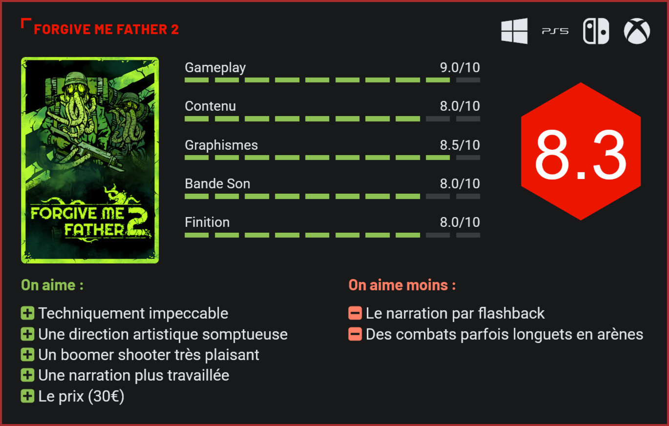 Après un premier volet très réussi, Forgive me father nous revient déjà à travers un second opus qui s’annonçait encore plus énorme. Vous vous souvenez peut-être de l’excellent Forgive me father, un FPS rétro qui brillait par son univers lovecraftien et sa direction artistique. En early access depuis janvier 2024, sa suite est désormais disponible en version finale, et sur consoles également. On doit ce jeu au studio polonais Byte Barrel. Pour cette suite, les développeurs ont promis d’aller plus loin : une narration plus profonde, des niveaux plus variés et un gameplay affiné. Artistiquement, le jeu est superbe. Première bonne surprise, Forgive me father 2 va beaucoup plus loin dans la narration que le premier volet. Dans la peau d’un prêtre, on se réveille dans un asile de fous où la frontière entre réalité et hallucination s’effrite à chaque instant. Après une première mission, le tempo est donné : le jeu va jouer la carte de la santé mentale avec comme fil rouge la déshumanisation. Comme le premier volet, le titre prendre place dans un univers inspiré par le très grand auteur Lovecraft. On retrouve des cultistes dérangés, des créatures difformes, des entités d’un autre âge, dans un scénario très riche et beaucoup plus habilement mis en scène à travers cinématiques et dialogues en cours de partie. Le Prêtre, hanté par ses cauchemars récurrents, doit naviguer entre souvenirs fragmentés de champs de bataille enneigés, chantiers navals rouillés et abysses marins grouillants de tentacules, tout en luttant contre sa propre descente aux enfers. Les développeurs ont pris leur temps pour tisser cette toile narrative, usant de cutscenes stylisées en comic-book pour distiller des révélations progressives. Pad en main, on est également admirablement surpris par la mise en scène des affrontements, qui se jouent en vue subjective comme dans le premier volet. Le jeu se positionne comme un mélange de survival horror et de “boomer shooter”, tout en assumant son côté rétro. On enchaine donc exploration, petits énigmes et combats avec une débauche d’effets gore. On avance, on tire, on esquive, en gérant des ressources limitées comme les munitions et la santé, et avec très peu de checkpoints. Plus exigeant que son prédécesseur, le titre saura vous donner du mal à retordre, même en normal. L’ambiance lovecraftienne est particulièrement réussie. Par rapport au premier opus, le jeu gagne en profondeur avec des combats plus techniques, un système d’évolution d’armes et des capacités actives et passives bien pensé, et un système de jauge de folie mieux maîtrisé. Votre niveau de folie grimpe au fil des tueries et des visions horrifiques, débloquant des pouvoirs bizarres qui altèrent le gameplay en temps réel. À bas niveau, c’est une légère distorsion visuelle qui rend les ennemis plus visibles dans le noir ; à haut niveau, vous invoquez des tentacules pour immobiliser les ennemis ou des illusions qui les attirent dans des pièges mortels. Le jeu se veut aussi beaucoup plus intense dans ses gunfights, avec un bestiaire plus varié. On est encore plus proche d’un vrai boomer shooter. La difficulté monte aussi crescendo dans ce second opus. Les cultistes se buffent mutuellement avec des rituels qui invoquent des portails, tandis que les grands anciens coordonnent des assauts en plusieurs phases. Si au début, le titre est aussi assez linéaire, il offre rapidement des niveaux plus vastes qui encouragent l’exploration. Prenant du début à la fin, Forgive me father 2 fait donc sensiblement mieux que son ainé. La DA du jeu est une vraie réussite. La plus grosse évolution concerne toutefois l’esthétique. Le premier Forgive me father était parvenu à séduire avec son style unique. Sa suite est beaucoup plus réussie encore, aussi bien artistiquement que sur le plan technique, avec des effets visuels mieux maitrisés, un character design plus travaillé et des décors absolument superbes. 2D et 3D s’épousent à la perfection et donnent vie à un monde lovecraftien fabuleux. Extrêmement fluide, le jeu a eu tout le temps d’être peaufiné depuis son passage en early access en 2024. La bande-son n’est pas en reste avec d’excellents doublages en anglais (et sous-titres FR impeccables) et une B.O. qui nous immerge parfaitement dans l’univers cauchemardesque du jeu. Des riffs électriques accompagnent vos assauts sur les vagues d’ennemis et une musique plus mystérieuse s’installe lorsque l’action se calme. Un gros travail de sound design a aussi été réalisé, pour notre plus grand plaisir. Mais alors, tout est-il parfait dans cette suite ? Pratiquement, on pourra toutefois pinailler en pointant du doigt une narration par flashbacks qui donne l’impression que les chapitres ne sont pas connectés, rendant un peu moins plaisante la progression que dans le premier volet, et une tendance à proposer des combats un peu trop longs en arènes. Rien de grave en soi, mais forcément, il est difficile de gagner un cran quand on est déjà au sommet… Conclusion Après un premier épisode très réussi, Forgive me father nous revient avec un second opus également très séduisant, qui mise davantage sur la narration et améliore la formule à tous les niveaux. (Beaucoup) plus joli que son prédécesseur, plus riche en terme d’expérience et plus fun encore dans ses combats, Forgive me father 2 est un excellent boomer shooter qui mélange brillamment FPS et horreur dans un univers lovecraftien plein de charme. Assurément, l’un des jeux de la rentrée à ne pas manquer, que vous soyez adepte du genre ou pas, vous serez très agréablement surpris.