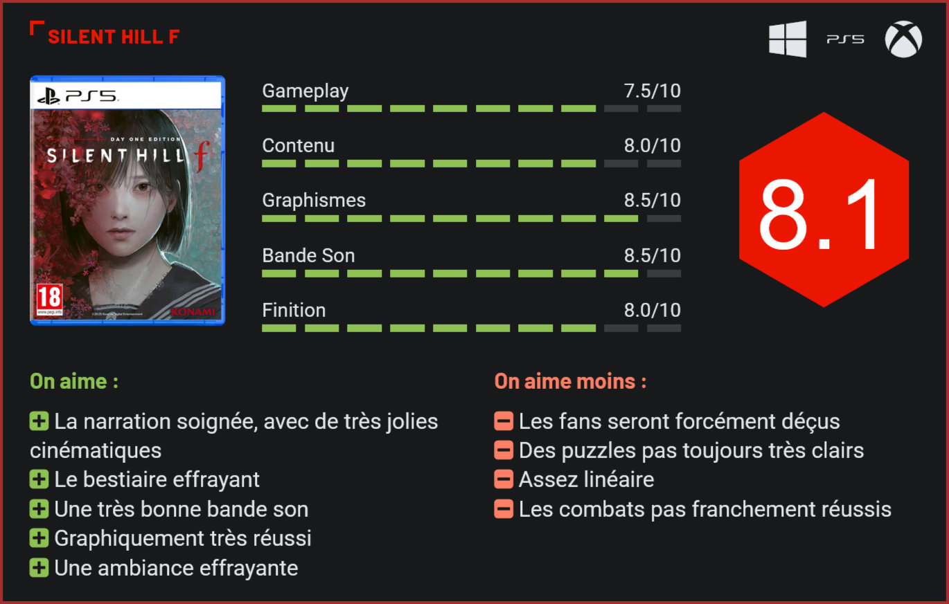 Parmi les classiques du survival-horror, il y a bien sûr Resident Evil, qui est parvenu à brillamment se moderniser au fil des épisodes, mais aussi Silent Hill, une série de Konami rangée au placard des années et qui renait aujourd’hui d’entre les morts… Avec son remake de Silent Hill 2, l’épisode le plus adulé de la franchise, Konami avait déjà montré un regain d’intérêt pour sa franchise, abandonnée pendant plus d’une décennie. Silent Hill f est le premier vrai épisode nouvelle génération édité par Konami, un projet ambitieux qui entend surtout donner une direction différente à la série… L’ambiance du jeu est soignée. Et de facto, le titre risque de diviser les joueurs. Les fans de la franchise seront sans doute surpris par l’orientation de cet épisode, qui se veut plus un spin-off qu’une suite des précédents volets, les nouveaux venus en revanche tomberont sans doute sous le charme de ce renouveau. Le ton est donné dès le début de l’aventure avec un focus sur la narration, les combats et le contexte unique du jeu. Contrairement aux précédents opus qui avaient tendance à se dérouler en Occident, cet épisode vous transporte dans le Japon des années 60, dans un contexte rural. Silent Hill f vous place dans la peau de Sumire, une adolescente à la recherche de sa sœur disparue, qui se retrouve piégée dans un village englouti par une brume rougeoyante. Ce village, inspiré des campagnes reculées de Honshu, est un labyrinthe de traditions brisées, où les rituels anciens et les rancunes familiales s’entrelacent pour invoquer des entités monstrueuses. Un cadra atypique pour la série qui donne un charme fou à cet épisode de la série. Car le Japon rural a ses charmes : le folklore japonais apporte une bouffée d’air frais à la franchise. Le titre n’hésite d’ailleurs pas à mélanger des atmosphères lugubres et des panoramas poétiques. Le lore est joliment développé à travers une intrigue intelligente. Alors oui, on pourra lui reprocher d’être un peu trop verbeux et de prendre parfois des risques inutiles avec son intrigue, mais une chose est certaine, ce Silent Hill f est l’épisode qui maîtrise le mieux les codes du cinéma et rien que pour ça il mérite déjà le détour. Certains paysages sont très réussis. La plus grosse surprise de cet épisode vient toutefois de son gameplay. On retrouve la formule des précédents épisodes avec un mélange d’exploration, d’énigmes, de combats et d’intrigue narrative, avec toutefois un plus gros accent placé sur les combats. L’originalité vient des nombreux mécanismes originaux de cet opus. On retrouve ainsi un système de talismans qui va permettre d’augmenter certaines stats de votre personnage. Vous pourrez en équiper jusque 3. Chacuna des atouts, mais aussi des défauts. Par exemple, l’un amplifiera les dégâts, mais vous serez plus fragile… À cela s’ajoute un système de progression via des offrandes aux autels, débloquant des capacités comme une esquive plus rapide ou une vision accrue dans le brouillard. On peut également équiper des compétences actives consommant une jauge d’esprit qui se régénère en résolvant des énigmes ou en purifiant des zones. Bref, il y a tout de même pas mal d’éléments à prendre en compte dans sa stratégie de jeu. Le volet survie reste basique : la stamina est votre jauge pour la course, il faudra gérer son stock d’herbes rares pour se soigner ou fabriquer des bandages. Côté énigmes, on retrouve quelques petits énigmes pas trop compliquées mais qui peuvent être frustrantes si vous ne connaissez pas le folklore japonais. Les combats apportent eux aussi leur dose de frustration avec des créatures invincibles que vous devrez vous contenter d’éviter, un accent mis sur l’infiltration de par la limite en ressources et une volonté de vous pousser à distraire les adversaires plutôt qu’à aller au contact. Ce n’est peut être pas plus mal puisque la partie combat est la moins maitrisée avec des séquences répétitives et sans profondeur. La direction artistique est impeccable. Alors oui, on pourra lui reprocher des niveaux trop linéaires, des combats trop basiques et des mécanismes de jeu parfois pénibles, mais il faut bien avouer que globalement Silent Hill f parvient à frapper fort là où on l’attendait, avec une ambiance soignée, des monstres effrayants, quelques jolis jumpscares, un character design superbe et des séquences d’infiltration vraiment flippantes. L’aventure se boucle en 10h environ en ligne droite mais la quinzaine de quêtes secondaires proposées vous tiendront occupés 5 à 10h de plus. C’est toutefois bien esthétiquement que le jeu frappe le plus fort avec une réalisation très solide : visuellement, le titre exploite brillamment le potentiel des consoles new-gen avec des effets visuels soignés, des paysages superbes et des modélisations détaillées. L’atmosphère du jeu est soignée, avec des décors lugubres à souhait. Les visuels next-gen exploitent le ray tracing pour des ombres mouvantes et un brouillard rouge pulsant, avec des textures crues pour les rizières putréfiées. Le jeu a quelque chose d’organique, de très malsain, qui plaira incontestablement aux amateurs de survival. Silent Hill f est sans doute l’épisode qui maitrise le mieux les codes hollywoodiens. La bande son n’est pas en reste avec des doublages japonais et anglais et une B.O. qui glace le sang. Les mélodies alternent entre silences oppressants et mélodies effrayantes, qui collent parfaitement au cadre de l’action. On doit la bande originale au grand Akira Yamaoka, un vétéran de la série, qui a parfaitement su donner vie à cet univers. Conclusion On ne l’attendait pas forcément au tournant et pourtant Silent Hill f est une vraie bonne surprise. Certes, les fans de la série seront sans doute agacés par quelques choix de l’éditeur. Il e