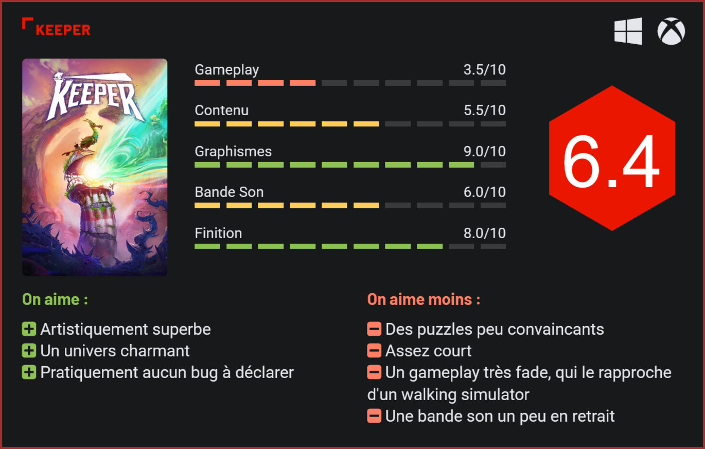 C’était l’un des jeux de cette fin d’année au sujet desquels nous n’osions pas nous proposer. D’une part, parce que si le talent de Double Fine n’est plus à prouver, le studio n’a pas livré que des pépites. D’autre part, parce qu’il faut bien l’avouer, malgré les trailers, on n’avait toujours aucune idée de comment Keeper se jouerait… Double Fine Productions vous dit certainement quelque chose. On doit à ce studio quelques pépites du jeu vidéo, comme les Psychonauts 1 & 2, mais aussi Brutal Legend, Costume Quest et Stacking. A la tête du studio, on retrouve le créateur de génie Tim Schafer, auteur des classiques du point & click Full Throttle, Grim Fandango et Day of the Tentacle, que son studio a d’ailleurs remasterisés il y a quelques années. Alors forcément, quand Double Fine annonce un nouveau titre, on écoute avec attention… Il faut toutefois bien l’admettre, le studio n’a pas un historique parfait. On retrouve dans ses titres quelques jeux fort en deçà, qu’il s’agisse des deux Costume Quest, de ses productions Kinect ou plus récemment de RAD. S’il y a un élément commun à toutes les productions Double Fine, c’est les mondes étrangers dans lesquels le studio nous plonge. Et Keeper n’échappe pas à la règle… La direction artistique est impeccable. On retrouve derrière cette production le grand Lee Petty, Art Director qui a travaillé sur Brutal Legend, Stacking, RAD et Psychonauts 2. L’artiste est parmi les plus reconnus de l’industrie et il faut le reconnaitre, son travail rayonne de nouveau avec Keeper. Visuellement, ce jeu est une pure merveille. Les décors, enchanteurs, semblent avoir été peints à la main. Ils changent également en temps réel à travers des manipulations temporelles sublimes. La patte artistique le rapproche d’une production Pixar, avec toutefois le style très particulier du studio. Sachez-le toutefois, si certains décors affichent une profondeur de champ, le jeu se joue principalement comme un jeu en 2 dimensions. La profondeur de champ est là juste pour donner une atmosphère et développer un univers, à l’exception de quelques hubs où il sera possible de se déplacer en 3 dimensions. Et c’est là qu’on se rend compte de l’incroyable travail réalisé par les développeurs de Keeper. Le jeu parvient de temps en temps à nous surprendre… Pad en mains, on découvre un curieux mélange de jeu narratif et de puzzles. Ceux qui s’attendaient à un jeu d’aventure ou de plates-formes seront forcément déçus. Keeper est avant tout un jeu narratif et contemplatif dans lequel on admire des tableaux vivants, avec quelques puzzles basés sur la manipulation du temps. Rien de très compliqué toutefois, ni de très original d’ailleurs. Et c’est sans doute là la plus grosse déception du titre, qui manque réellement d’ambition dans son gameplay et nous rappelle quelque part l’également très décevant South of Midnight, une autre production Xbox qui lorgnait elle aussi du côté des “walking simulators”. Alors oui, Keeper est un jeu visuellement sublime, qui prend place dans un univers charmant et qui nous surprend avec ses choix artistiques. On y incarne un phare abandonné depuis des années, réveillé par un oiseau de mer, qui va partir pour un voyage initiatique à travers le continent. Le monde a été, semble-t-il, dévasté par un terrible accident et l’humanité a été remplacée par de nouvelles espèces qui sont apparues. Des objets ont pris vie. De nouveaux dangers se sont aussi développés… Vous n’en apprendrez pas forcément plus sur le récit, le jeu n’étant pas narré ni commenté. Tout se vit à travers l’expérience. Et c’est là que le jeu excelle. Les paysages traversés sont extrêmement variés. Il faut toutefois bien l’admettre, malgré son prix, son univers charmant et sa patte artistique unique, on a eu bien du mal à tomber sous le charme de Keeper, la faute en grande partie à son côté excessivement contemplatif. La partie ludique se résume à la résolution de quelques énigmes bien trop faciles à résoudre, et sans grande inspiration. Alors oui, c’est une cible un peu facile car c’était la volonté des développeurs d’imaginer un titre contemplatif, mais tout de même, il n’aurait pas été très difficile d’ajouter quelques mécanismes de jeu pour rendre le tout plus digeste. D’autant plus que le jeu s’essaye à quelques reprises à la plate-forme et que ça fonctionne plutôt bien. Ces passages sont toutefois excessivement rares. Dans le même ordre d’esprit, sachez qu’il n’y a aucun mécanisme de combat si ce n’est l’utilisation de la lampe de votre phare pour écarter des “ennemis et vous frayer un chemin. C’est un peu léger tout de même, d’autant plus que le rythme est assez mou et qu’on en fait vite le tour… Keeper est donc plutôt le type de jeu pop-corn qu’on fera le temps d’une soirée, grâce à son abonnement Gamepass, et sur lequel on ne reviendra pas forcément. Ce n’est pas la pire prod’ du studio, mais pas la meilleure non plus. Le jeu laisse un souvenir plaisant avec son expérience contemplative mais ne marquera pas l’histoire du jeu vidéo à l’image d’un Psychonauts par exemple. Conclusion Avec Keeper, Double Fine Productions livre l’un de ses jeux les moins marquants. L’expérience se veut avant tout contemplative dans ce jeu narratif sans dialogues, qui a le mérite de développer un univers graphique superbe composé de tableaux vivants. Artistiquement, Keeper est une pépite. Sur le plan ludique en revanche, on se rapproche d’un walking simulator saupoudré de quelques puzzles pas très inspirés. Pas un mauvais jeu, mais pas un titre marquant non plus. Plaisant à parcourir, le jeu de Double Fine se consommera idéalement dans le cadre d’un abonnement au Gamepass.