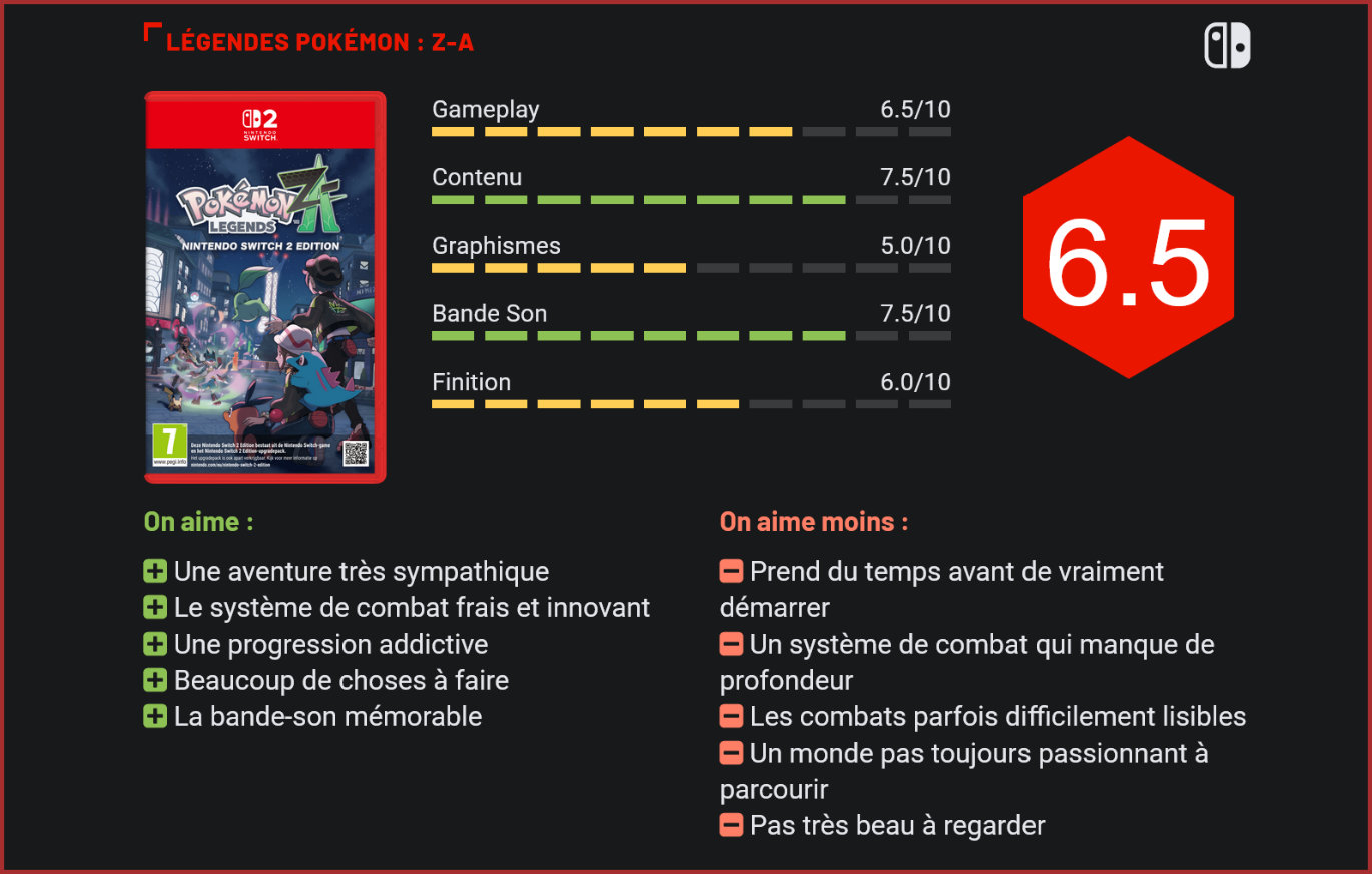 Il aura fallu une année de plus que d’habitude à Game Freak pour proposer un nouvel épisode de sa licence phare. Pokémon est de retour avec un nouveau jeu “Légendes” qui, tout comme Légendes Pokémon : Arceus en 2022, est une sorte de spin-off sans l’être totalement non plus. Tout comme son prédécesseur, “Z-A” expérimente avec la formule habituelle. Si Légendes Pokémon : Arceus n’a pas été un succès commercial aussi massif que les épisodes traditionnels de la licence, il est pourtant un opus particulièrement intéressant puisqu’il avait la volonté de s’affranchir de nombreux codes de la série pour proposer de nouvelles choses. Il semble que Game Freak continue d’utiliser cette nouvelle branche “Légendes” pour expérimenter avec la saga. Disponible depuis quelques jours, Légendes Pokémon : Z-A est un tout nouvel épisode qui se démarque tout de même d’Arceus. Le titre se déroule dans le présent et plus particulièrement dans la ville d’Illumis dans la région de Kalos, l’équivalent de Paris dans l’univers de Pokémon. Un titre qui fait donc suite à Pokémon X et Y sorti sur 3DS en 2013. S’il n’est pas nécessaire d’avoir joué à ces épisodes pour profiter de Z-A, l’on y retrouve plusieurs personnages importants de ces opus. Nous incarnons ici un personnage customisable fraîchement débarqué à Illumis pour un séjour touristique. À peine arrivé, nous faisons la rencontre de plusieurs personnages qui vont composer l’équipe “MZ”, un petit groupe que nous allons rejoindre et qui combattent ensemble dans le Royale Z-A, une compétition de combats Pokémon prenant place en ville uniquement durant la nuit. La ville d’Illumis est également en plein changement puisqu’un plan de réaménagement est en cours suite à l’apparition de plus en plus prononcée de Pokémon dans certains quartiers. Certaines parties de la ville sont donc transformées en zones sauvages afin qu’humains et Pokémon puissent vivre en harmonie. La grande particularité du titre est son parti pris beaucoup plus modeste, l’entièreté du jeu se déroule au sein même de la ville d’Illumis. Contrairement aux autres jeux, Légendes Z-A n’est pas une aventure, ni un voyage. Il s’agit plutôt d’une compétition dont les tenants et aboutissants ne sont pas très clairs dès le départ. Le scénario se bonifie cependant avec le temps à mesure que les enjeux s’intensifient et arrive même à surprendre. Sans pour autant être renversant, l’intrigue se suit avec plaisir, en plus de proposer un univers plus travaillé grâce à son concept de se concentrer sur une seule et unique ville. Passé un pénible tutoriel de deux grosses heures, ce nouvel épisode nous laisse explorer la ville de fond en comble en nous donnant pas mal de liberté. Si l’intrigue principale se divise en plusieurs missions linéaires, d’autres activités importantes nous attendent aussi dans la ville. Plusieurs collectables et quêtes annexes se cachent un peu partout dans les rues d’Illumis, mais il est également possible de se rendre dans les zones sauvages, de petits environnements où traînent de nombreux Pokémon à capturer. Nous sommes plongés, un peu par hasard, dans une compétition de combats Pokémon. Nous retrouvons ici un peu de Légendes Pokémon : Arceus dans l’esprit puisqu’il est possible de se battre contre les Pokémon sauvages, mais aussi d’essayer de les capturer en restant discret et en se faufilant derrière eux avant de leur lancer une Pokéball. Il faut, ici aussi, faire attention à la santé de notre personnage puisque les Pokémon sauvages peuvent très bien nous attaquer directement et nous faire perdre connaissance. De nuit, il est par ailleurs possible de prendre part au Royale Z-A. La compétition nocturne prend place dans une petite zone aléatoire de la ville et nous propose de nous battre jusqu’au levé du jour contre tout un tas de dresseurs. La formule Pokémon est ici complètement chamboulée, même si le concept de collecter tout un tas de créatures pour les entraîner et remplir notre Pokédex reste intacte. Cependant, le système de combat propose une véritable refonte puisque les combats se font désormais en temps réel. Plus de tour par tour ici, les affrontements ressemblent bien plus à ce que l’on peut voir dans le dessin animé. Nous contrôlons directement notre personnage qui est suivi de près par le Pokémon que nous avons choisi, il suffit alors d’appuyer sur un bouton pour lancer l’une des quatre capacités qu’il possède, capacité qui prendra ensuite un certain temps avant d’être réutilisable. Les fans de la licence ne seront cependant pas perdus puisque les attaques, affinités de types et objets restent les mêmes qu’avant. Ce nouveau système de combat nous demande d’être bien plus actif qu’avant et de réfléchir au timing de l’utilisation de nos attaques et à nos déplacements. Il brille surtout durant les combats de boss contre des Pokémon méga-ferox, des combats en arène plus techniques. Malgré quelques bonnes idées, ce nouveau système de combat peine à convaincre. Ce dernier reste à la fois trop proche des précédents jeux tout en étant moins complexe, plus bourrin et parfois illisible quand il se passe trop de choses à l’écran. C’est particulièrement le cas dans le mode multijoueur en ligne confrontant quatre personnes en même temps qui est sympathique, mais certainement pas très profond. La ville d’Illumis est la star de ce nouvel épisode. La ville d’Illumis n’est pas non plus un monde particulièrement palpitant à explorer. L’endroit n’est ni très grand, ni très vivant, et même si on passe beaucoup de temps à se balader sur les toits, elle cache peu de choses intéressantes. Game Freak sait pourtant nous donner envie de jouer en nous récompensant très souvent et en proposant des améliorations très utiles, ainsi que