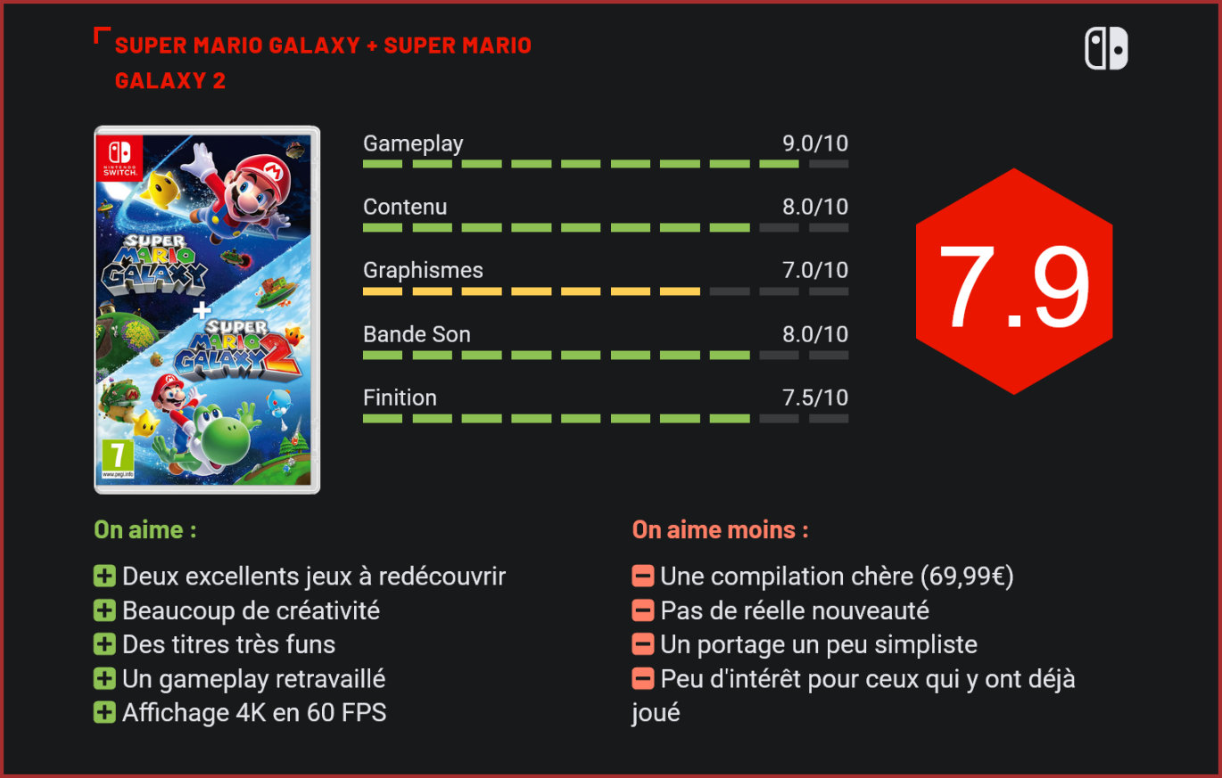 Sortis respectivement en 2007 et 2010 sur Wii, Super Mario Galaxy et sa suite Super Mario Galaxy 2 sont considérés aujourd’hui encore comme deux des meilleurs épisodes de la saga. Il faut dire qu’avec ces titres, Nintendo a su faire preuve d’audace… Ce n’était pas le premier Mario en 3D – Super Mario 64 et Sunshine avaient posé les bases –, mais assurément, Super Mario Galaxy a marqué les esprits. Car lorsqu’il sort en 2007, le titre de Nintendo s’impose immédiatement comme une petite pépite avec son concept unique d’exploration de planètes. Ce n’est bien sûr pas son scénario qui émeut les fans, mais bien son gameplay unique. Les niveaux sont extrêmement originaux. Pour ceux qui n’auraient jamais joué à l’un de ces deux classiques, les épisodes Galaxy se caractérisent donc par le fait que chaque monde est une planète avec ses propres règles de gravité. On y contrôle Mario, sautant, tournoyant et planant à travers des galaxies truffées d’étoiles, de pièces et de défis gravitationnels. Le schéma est classique : collecter, explorer, et vaincre un boss. Mais les mécanismes de jeu sont extrêmement séduisants. Chaque galaxie introduit des concepts uniques : des planètes inversées où l’on marche à l’envers, des zones à gravité changeante, ou des transformations via des power-ups comme le Bee Mario pour voler ou le Cloud Mario pour créer des plateformes éphémères. Là où Odyssey misait sur un vaste open world, Galaxy propose des niveaux plus compacts mais extrêmement denses, proposant à chaque fois des expériences de jeu différentes. Le jeu est beaucoup plus structuré qu’Odyssey, mais également beaucoup plus fun. Les niveaux sont des bijoux de level design, avec des boucles interconnectées, des concepts rigolos et une bonne dose de créativité. Chaque galaxie est ici un microcosme unique. Le jeu n’en reste pas moins accessible, et parvient à la fois à séduire les plus jeunes et les fans nostalgiques de la saga. Attendez-vous à être surpris ! Alors bien sûr, vous nous demanderez sans doute pourquoi il faudrait craquer aujourd’hui pour cette compilation de deux jeux, il faut le reconnaitre assez vieux. Et très honnêtement, ce n’est pas la compilation qu’on recommanderait à ceux qui ont déjà fait ces deux opus. Pour plusieurs raisons. Tout d’abord, le prix. Les deux titres sont vendus ensemble 69,99€. Un tarif élevé pour de simples rééditions. Ensuite, le contenu. On retrouve les deux jeux originaux, légèrement remis au goût du jour. Ne vous attendez pas à des niveaux inédits qui transcendent l’expérience de jeu. Nintendo s’est contenté d’un portage très propre. L’affichage est optimisé pour un jeu nomade, le curseur a été retravaillé et l’affichage a été retravaillé pour proposer de la 4K en 60 images par seconde. Nintendo a légèrement retravaillé les textures et effets visuels, mais ne vous y trompez pas, on ne parle pas pour autant d’un remaster. C’est un portage. Cela ne le rend pas moins intéressant pour les nombreux joueurs qui étaient passés à côté de ces pépites, à l’époque de la Wii. Car de facto, Super Mario Galaxy et Super Mario Galaxy 2 restent deux des meilleurs épisodes de la série, deux monuments du jeu de plate-forme qui font preuve d’une originalité folle et qui sont incontestablement très funs à jouer. Esthétiquement, ça a forcément vieilli mais ça garder son charme. Alors, faut-il craquer ? Oui, si vous n’y aviez jamais joué ou aviez raté l’un des deux opus. Sinon, vous ne raterez pas grand chose, les améliorations étant légères. Conclusion Super Mario Galaxy et Super Mario Galaxy 2 restent sans l’ombre d’un doute deux des meilleurs épisodes de la série de Nintendo. Incroyablement originaux, créatifs, funs et décalés, les niveaux de ces deux jeux méritent le détour, que vous soyez un jeune ou un vieux fan de la série. Nintendo nous remet au goût du jour deux classiques de son catalogue. Mais attention, si cette compilation séduira les joueurs qui n’y avaient jamais touchés, pour ceux qui avaient déjà parcouru les deux jeux, elle n’a que peu d’intérêt : pas de nouveaux contenus à l’horizon, quelques simples améliorations. On ne parle d’ailleurs même pas d’un remaster mais d’un simple portage…