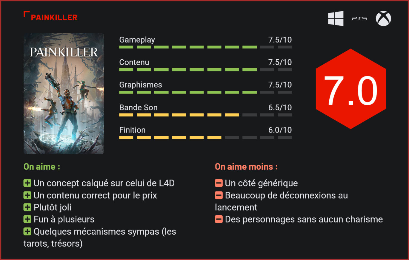 Sorti en 2004 sur PC, Painkiller est parvenu à l’époque à faire parler de lui avec son design gothique et son univers extrêmement violent. Plus de 20 ans plus tard, et après une longue pause, la série renait de ses cendres avec un reboot intégral porté par le studio polonais Anshar Studios et Saber Interactive. On ne va pas vous le cacher, on avait très peur de découvrir ce reboot de la série démarrée par le studio People Can Fly. D’une part parce qu’en général, quand une franchise passe d’une main à l’autre, ça se passe assez mal. Il y a bien sûr quelques exceptions comme Dead Island 2, mais ce n’est pas la règle. D’autre part, parce que le reboot en question est resté très timide jusqu’à sa sortie, et qu’on ne savait finalement pas trop qui travaillait sur ce projet. 3D Realms (Duke Nukem) était cité à l’édition, aux côtés de Saber Interactive (World War Z) et Anshar Studios (un studio polonais de support, qui a travaillé notamment sur Baldur’s Gate 3 et Layers of Fear). Autant vous dire que ça ne respirait pas la confiance… Et puis, il y avait le concept de reboot. Reboot qui prend dans ce cas-ci une direction bien différente avec un concept calqué sur celui de Left-4-Dead avec de la coop en ligne en lieu et place d’une campagne solo. Le design des grosses bestioles est plutôt réussi. Et forcément, les jeux services, ça passe ou ça casse. Trop souvent, on se retrouve face à un jeu remplis de microtransactions, au contenu ridicule, et parfois surfacturé. Bonne nouvelle, ce n’est pas le cas pour Painkiller qui propose d’entrée de jeux 3 gros chapitres composé de 3 missions chacun. Pas de contenu à débloquer à coups de microtransactions ou de système d’upgrade basé sur des microtransactions. Le jeu est vendu 39,99€ dans sa forme “intégrale”. Le seul petit reproche qu’on pourrait finalement lui faire avec ce format, c’est de ne pas proposer de pass ami, comme un It Takes Two ou un Little Nightmares 3. On choisit ses cartes de tarot pour bénéficier d’avantages dans ses parties. Le jeu se distingue de son illustre prédécesseur de 2004 en plusieurs points : il est certes jouable en solo mais le titre a été pensé pour être jouable en coop, tel un Left-4-Dead. Il intègre par conséquent des mécaniques d’upgrades d’armes, de cartes de tarot qui offrent des avantages comme 30% de dégâts en plus ou 20% d’énergie supplémentaire. Et on retrouve un hub qui va permettre d’organiser les parties en amont. Côté univers, c’est un peu moins crasse qu’à l’époque, mais on retrouve finalement un joli bestiaire, les armes centrales de l’original (dont l’incontournable lance-pieux qui perfore les ennemis et les empale aux murs !), et une partie de son univers. Les fans purs et durs de la licence seront sans doute déçus que l’éditeur ait pris autant de libertés avec la franchise, s’écartant de son ambiance macabre pour un loisir plus grand public. Qu’ils se rassurent toutefois, pad en main, le jeu reste très sympa. On massacre des vagues d’ennemis au lance pieu ou à la sulfateuse, des mini boss apparaissent sporadiquement pour des pics de difficulté, et on progresse avec plaisir dans les niveaux, en tentant de découvrir les quelques trésors cachés et en réalisant les petites missions qui s’offrent à nous : éliminer 3 vagues d’ennemis, activer 2 interrupteurs,… Ca ne casse pas trop pattes à un canard, mais c’est suffisamment bien fichu pour qu’on s’accroche. Pour être tout à fait francs avec vous, nous avions joué à l’original et on s’attendait à une petite catastrophe au vu des premiers retours, mais le jeu nous a finalement agréablement surpris. On a bel et bien l’impression de jouer à un Left-4-Dead à la sauce Painkiller, le gameplay est toutefois beaucoup plus calqué sur celui d’un fast-FPS, le tout dans des décors somptueux. Alors oui, si vous vous attendiez à un remake de l’original, vous risquez d’être déçus. Et non, ce reboot n’est pas non plus la pépite de l’année (on en vient aux défauts, promis !) C’est un FPS coop très honnête, qui est vendu à 39,99€, et idéal pour s’éclater entre amis le temps de quelques soirées. Côté défauts, on commencera par pointer du doigt un côté un peu trop générique – le jeu est joli et a son cachet, mais les personnages centraux, les ennemis de base et l’histoire sont très génériques. Second défaut, majeur cette fois : le jeu n’est pas du tout stable, du moins pour le moment. Nous avons été confrontés à plusieurs déconnexions en pleine partie, avec la perte de tout ce qu’on avait emmagasiné en cours de partie. Par conséquent, on vous conseille d’attendre les premiers patchs pour démarrer. Enfin, on aurait tout de même aimer des combats de boss un peu plus intenses. Les quelques boss croisés ne sont pas mémorables. Ils permettent toutefois d’apporter une diversité bienvenue dans les combats. On espère de tout coeur que le titre ne floppera pas trop, car il est loin d’être aussi mauvais que certains le prétendent. Il sort en revanche à une période de l’année chargée et risque d’en souffrir… Dommage, car il présente un réel potentiel et pourrait continuer à se développer dans la bonne direction avec un suivi à la hauteur des attentes… Conclusion On n’en attendait pas grand chose et en définitive ce reboot de Painkiller est plutôt une bonne surprise. S’il ne conserve que l’univers dark, une partie du bestiaire et les armes de l’original, ce reboot ose l’audace avec un concept repensé : le jeu se joue désormais en coop en ligne, à la façon d’un Left-4-Dead. On affronte des vagues d’ennemis en progressant à travers des niveaux assez linéaires. Le jeu est fun, les mécanismes sont bien pensés et malgré un côté assez générique, la sauce prend. Attention toutefois, l’état est très précaire 