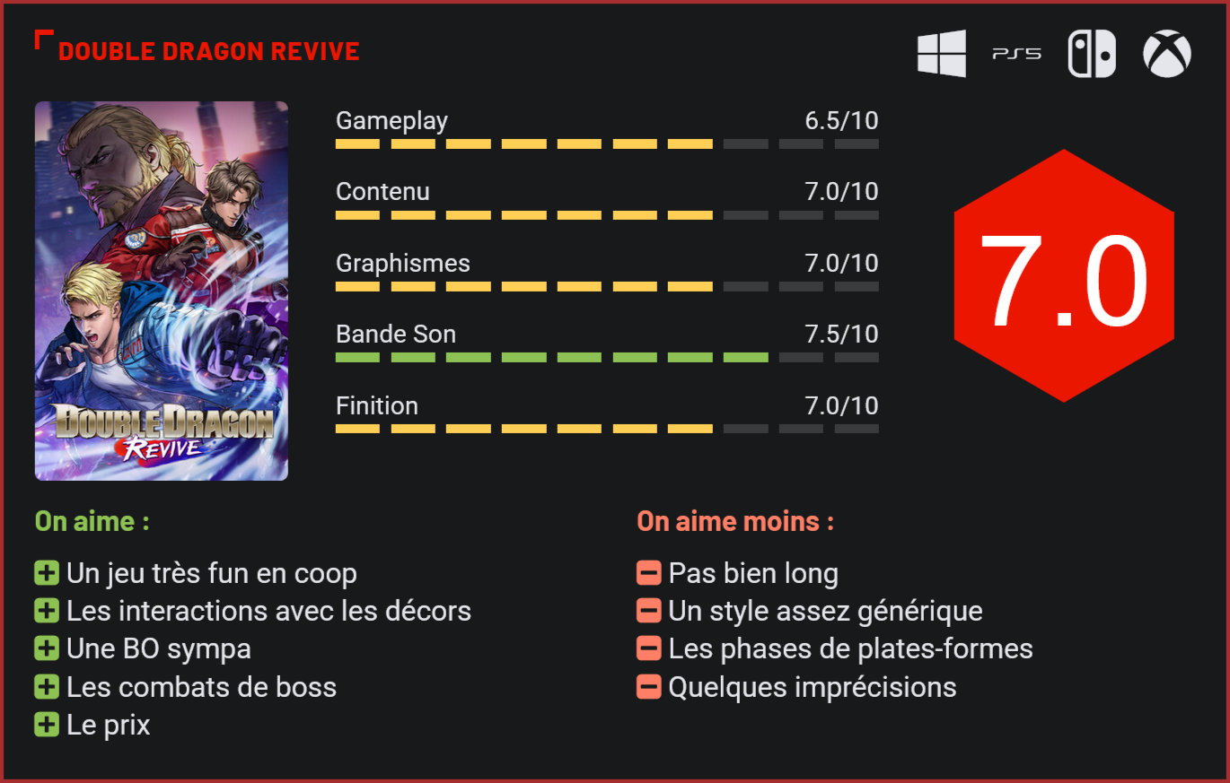 Série légendaire née en 1987, Double Dragon n’avait plus eu droit à un nouvel opus depuis des années, si l’on range de côté le très décevant Double Dragon Gaiden, sorti en 2003. Le moins que l’on puisse dire, c’est qu’on était assez perplexe à l’idée de tester ce nouvel opus, développé par le studio Yuke, un studio spécialisé dans les jeux de catch qui s’est du jour au lendemain allié à Arc System Works pour ce revival inattendu. Double Dragon est pourtant une série légendaire, similaire dans le concept à Streets of Rage, une autre série de beat them up qui a récemment eu droit à un excellent revival. A la différence de celui-ci, Revive est toutefois un beat them all en 3D, et non pas en 2D. Visuellement, le titre se défend plutôt bien. Pour les développeurs, il n’était toutefois pas question de commettre l’erreur de proposer un titre entièrement en 3D avec un gameplay ultra-modernisé. Double Dragon devait rester du Double Dragon, un jeu beat them all fun et accessible, qui reprenne l’essence du gameplay des anciens opus, avec un mode coop et une construction linéaire. Ce qu’on pourra reprocher d’entrée de jeu à cet épisode, c’est sa trop grande accessibilité. Le titre est simple à prendre en main avec un nombre de combos très léger, quelques attaques différentes seulement mais néanmoins un système de combat qui reste intéressant. On se base ici principalement sur l’usage des outils à disposition dans l’environnement pour diversifier le gameplay. Entre les enchainements, le joueur pourra ainsi utiliser les décors à son avantage pour éliminer ses ennemis en un coup en les faisant traverser une vitre d’un gratte-ciel ou s’encastrer dans une fenêtre de voiture. Notre personnage pourra également récupérer toutes les armes abandonnées par les adversaires au sol : couteux, haches ou fouets, pour mâter ses adversaires. Globalement, le jeu se joue comme un beat them all old school, malgré sa réalisation en 3D. D’ailleurs, la plupart des niveaux sont conçus comme s’il s’agissait d’un jeu en 2D, avec un peu de profondeur dans les niveaux. On avance en tabassant les vagues d’ennemis jusqu’au boss de fin de niveau, qui exigera souvent de suivre un pattern bien précis. Le scénario est narré à travers des cinématiques pas très captivantes. S’il reste très classique dans sa structure, le titre ose quelques originalités. Les boss brillent par leurs techniques d’attaques originales, qui vous forceront à apprendre leurs patterns par coeur. Quelques séances de plates-formes sont aussi au programme, mais elles s’avèrent moins réussies en raison de leur difficulté mais aussi d’approximations dans le gameplay. S’il a l’allure d’un jeu en 3D, Revive reste donc très proche de son modèle 2D, avec quelques petites originalités qui marcheront plus ou moins selon les situations. Les séquences de plates-formes sont ratées. Globalement, le jeu reste très plaisant à parcourir avec des niveaux bien pensés, de nombreuses interactions avec les décors et une difficulté bien dosée. Le gameplay est dynamique et vraiment fun. On pourra néanmoins lui reprocher ses séquences de plates-formes mal maitrisées, son gameplay un peu trop simpliste et un manque de précision dans les commandes, mais rien de catastrophique. Le jeu alterne plans en 2D et en 3D. Finalement, là où le titre divisera le plus, c’est sans doute dans sa réalisation. Le jeu est globalement plutôt joli, mais avec un character design très inégal et un univers globalement trop générique. Encore une fois, ce n’est pas un drame, mais on aurait aimé quelque chose de plus stylé. Etrangement, si vous adoriez les jeux de l’époque Xbox 360 / PS3, le titre pourrait toutefois vous plaire avec son style un peu rétro du début des années 2000. Conclusion On n’en attendait pas grand chose et en définitive ce Double Dragon Revive est plutôt une bonne surprise. En tout cas, c’est un beat them all en 3D à l’esprit 2D très respectable. Le jeu est particulièrement fun à parcourir à 2D en coop et brille surtout à travers ses combats de boss. On lui reproche principalement deux défauts : un certain manque de précision dans les commandes et un gameplay un peu trop simplifié. Ce n’est pas grave en soi car il y a des tas d’armes à utiliser et des tas d’interactions avec les décors, mais ça aurait sympa de pouvoir enchainer plus de combos… Plutôt qu’un simple matraquage de bouton. Pour le reste, à 29,99€, c’est un beat them all 3D très honnête, vraiment fun à jouer, plutôt décent graphiquement, mais qui manque peut-être un peu de personnalité.
