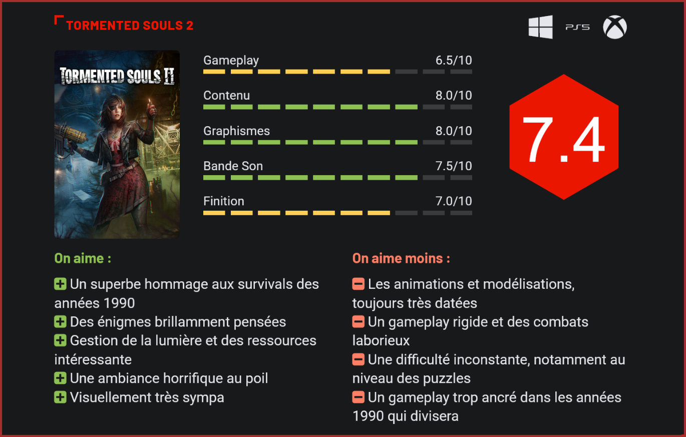 Quatre ans après un premier volet remarqué, Tormented Souls 2 replonge Caroline Walker dans l’horreur. Plus beau, plus oppressant, mais toujours aussi rigide : un hommage aussi sincère qu’impitoyable aux Resident Evil d’antan. Il y a quatre ans sortait Tormented Souls, un survival horror indé développé par le tout jeune studio chilien Dual Effect. A l’époque, le titre avait fait sensation et, bien qu’imparfait en beaucoup de points, il se présentait comme une belle première pour le studio. Les retours de la presse et des joueurs ont même, semble-t-il, été suffisamment bons pour encourager les développeurs à se lancer dans la réalisation d’une suite. On retrouve notre chère Caroline Walker et sa petite sœur Anna, qui semble possédée par une force démoniaque et qui a des visions. Pour aider sa sœur, Caroline accepte l’invitation d’une nonne (très mauvaise idée) leur proposant de venir les rejoindre dans un couvent pour combattre le mal (idée encore plus mauvaise). Il s’agira bien entendu d’un piège, les deux sœurs étant très rapidement séparées et plongées au cœur même d’une secte diabolique. Le ton est donné dès les premières minutes de jeu, et plus jamais nous ne serons en sécurité dans ce titre. Le premier épisode avait énormément fait parler de lui pour une chose : l’hommage clairement assumé aux premiers Resident Evil de la PS One. Il se ressent comme une véritable lettre d’amour aux survival de la fin des années 1990 en en reprenant les principaux codes : caméras fixes, angles de vue contraignant, sauvegardes manuelles, gestion rigoureux des munitions, rythme lent… Autant de mécaniques qui, à l’époque, étaient presque inévitables en raison des limitations techniques, mais qui aujourd’hui paraissent désuètes, du moins pour le grand public. Et c’est probablement le plus gros problème de ce type de jeu dont l’objectif est de rendre hommage à des licences cultes qui ont près de 30 ans : le gameplay semble aujourd’hui dépassé et va ne s’adresser qu’à ces nostalgiques du genre. Pour un jeune qui est davantage habitué, entre autres, aux remakes des premiers Resident Evil, Tormented Souls 2 (au même titre que le premier épisode) va sembler très has been et lourdaud dans ses mécaniques. Cela peut en effet paraître archaïque de ne pouvoir sauvegarder qu’à certains endroits, de ne pas pouvoir disposer de la caméra au bon vouloir… C’est malheureusement un pari audacieux. En rendant très (voire trop) fidèlement hommage à un genre aujourd’hui désuet, le studio tourne le dos à un certain public qui aurait pu s’intéresser à Tormented Souls. Dual Effect aurait eu tout à gagner à moderniser la formule avec, pourquoi pas, un switch pour faire passer la caméra au-dessus de l’épaule du personnage, introduire un système de sauvegarde d’urgence… Le gameplay est très semblable aux premiers Resident Evil : sauvegarde manuelle, caméra fixe, inventaire limité par cases… Comme dans le premier épisode donc, le studio fait ici le choix d’un personnage lourd à déplacer, qui apporte énormément à une tension déjà très palpable tout au long de l’aventure. De l’environnement à la gestion de la lumière en passant par la bande sonore ou le gameplay, Tormented Souls mise tout sur une ambiance lugubre et un sentiment d’insécurité qui ne s’estompera jamais de la première à la dernière minute de jeu. Comptez d’ailleurs une petite quinzaine d’heures pour finir votre aventure dans la peau de Caroline, et vous n’en ressortirez très certainement pas indemne. Les énigmes d’abord. Elles sont pensées pour mêler l’observation, la logique et l’exploration. Certaines reposent sur des objets qui peuvent à la fois servir d’outil et d’arme, comme le marteau, là où d’autres énigmes reposent sur le principe de dualité des mondes, avec des actions dans une réalité qui ont bien souvent un impact dans “l’Autre Côté”. Sachez toutefois que pour résoudre les énigmes, jamais le jeu ne vous donnera la solution toute faite (encore un héritage des jeux des années 1990), vous devrez chercher par vous-même, quitte à passer plusieurs heures sur une seule énigme. Si la satisfaction de les résoudre est totale, la frustration de bloquer sur certaines l’est tout autant. Ce qu’on pourrait reprocher au jeu, c’est son manque de constance au niveau des puzzles. Certains puzzles sont plutôt logiques, là où d’autres plutôt incongrus, dont on ne connaît pas vraiment la finalité. Visuellement, le titre claque et provoque une tension palpable du début à la fin. Déplacements rigides, énigmes inconstantes, quid du reste du gameplay ? Là aussi, il faut bien admettre que le jeu mise tout sur la tension permanente. Les esquives sont lentes et peu réactives, les changements d’angle de caméra peuvent souvent perturber, et la gestion des armes a le don d’agacer si on ne les manie pas habilement. Avec un arsenal varié, qui va du pistolet à clous en passant par l’arbalète ou la tronçonneuse, Caroline a tout pour se faire plaisir. Toutefois, la tension palpable fait que l’on ne peut pas toujours prendre notre temps pour tirer, nous obligeant à tirer à l’aveugle. Dans ce deuxième épisode, le studio a intégré un nouvel élément au gameplay qui tient un rôle tout particulier : la lumière. Dans le premier opus déjà elle brillait par sa beauté mais ici, elle revêt une importance capitale pour le salut de Caroline. Si celle-ci reste trop longtemps dans l’obscurité, alors elle perd pied et va littéralement mourir. Se pose alors un dilemme capital. Faut-il sortir son briquet et voir au risque de se retrouver sans défense ? Ou faut-il slalomer entre ombre et lumière, arme à la main mais voir moins bien ? La lumière est tellement bien gérée que ça apporte au titre une atmosphère suffocante, où la lumière vacille en