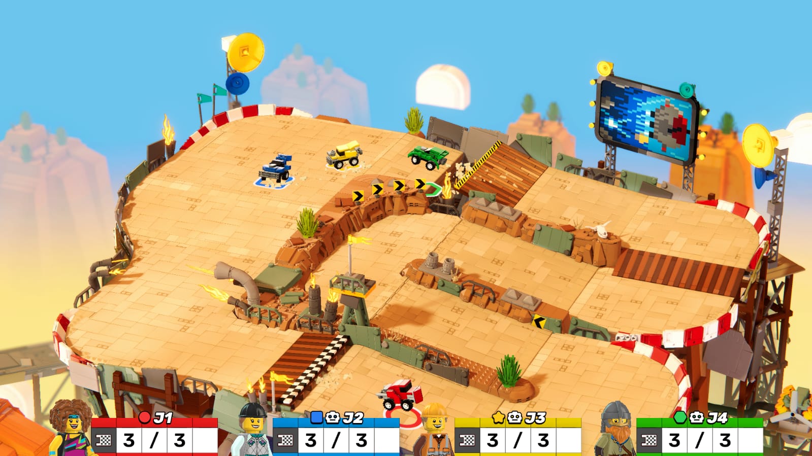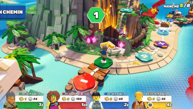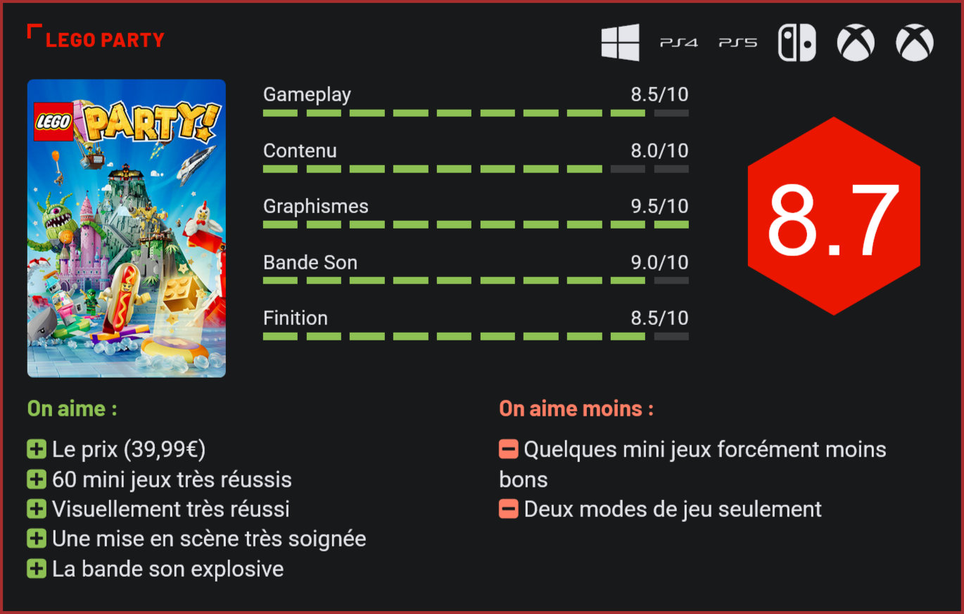 Qui aurait cru qu’un jour, Mario Party serait battu sur son propre terrain par un jeu estampillé Lego ? Derrière ce party-game exploitant la marque Lego, on retrouve le studio MSG, à qui l’on doit notamment l’excellent Moving Out, un jeu qui surfait sur la vague Overcooked, le “couch coop” dans lequel deux joueurs doivent collaborer pour préparer des repas pour des consommateurs. Le studio MSG était parvenu à joliment reproduire la formule, à deux reprises, sans toutefois égaler l’excellence de son modèle. Avec Lego Party, il s’inspire à nouveau d’un autre classique du jeu en multijoueur local, Mario Party, qu’il reprend à sa sauce. Le facteur chance joue beaucoup dans les parties. On n’en attendait pas grand chose et en définitive, Lego Party est une excellente surprise, peut-être même LE jeu de cette fin d’année. Car il faut bien l’avouer, si vous ne jouez pas sur Switch, vous n’avez accès qu’à un catalogue très léger de party games. C’est là le principal atout de ce Lego Party, qui est disponible sur tous les supports. Second atout du jeu, Lego Party est proposé à un tarif réduit – 39,99€ – pour un titre qui a pourtant tout d’un grand : de sa réalisation superbe à sa présentation et son contenu. Certains mini jeux sont très réussis, à l’image de ce clone de Micro Machines. Troisième atout majeur, il exploite brillamment la licence Lego. Il faut l’avouer, peu de licences étaient capables de rivaliser avec Mario dans un party-game. Avec ses millions de personnages colorés, son design emblématique, son univers décalé, Lego en avait le potentiel, à condition que le studio s’en donne les moyens. Et bien qu’il ne soit pas distribué par un gros éditeur, Lego Party semble avoir eu droit à un vrai investissement. Comme on l’a dit, on est là face à un Mario Party-like, comprenez par là un jeu qui compile pas moins de 60 mini jeux décalés et qui intègre une espèce de variante du jeu de l’oie, dans laquelle les 4 joueurs qui participent au défi devront enchainer certains mini jeux et progresser sur l’aire de jeu en jouant au tour par tour avec un dé et en récupérant un max de pièces et de briques d’or. A la fin de la partie, c’est celui qui a le plus de briques d’or qui l’emporte. En cas d’égalité, les pièces permettront de départager le gagnant du perdant. Alors bien sûr, il y a plein d’éléments qui viennent se joindre au gameplay : la possibilité de dépenser les pièces acquises pour acheter des bonus qui vous permettront par exemple de doubler vos lancers de dés ou de lancer que des dés de 6 points et plus, la possibilité aussi de tomber sur des cases piégées qui vous feront perdre des points, de faire voler une brique à un adversaire ou de profiter d’un raccourci… Une formule entièrement calquée sur Mario Party, qui fonctionne plutôt bien pour animer des soirées en famille. D’autres le sont un peu moins comme cette partie de slalom de snowboard. Pour ceux qui n’adhèrent pas à la formule “jeu de plateau”, il est bien sûr possible d’enchainer les mini jeux sans passer par le jeu de l’oie. Comme dans Mario Party, on aura droit à un aperçu des commandes et à un essai avant de démarrer le mini jeu. Les 60 mini jeux vont un peu dans tous les sens. On a une course de slalom en snowboard, une course de véhicules façon Micro Machines, des séquences de précision, un jeu dans lequel les joueurs doivent mémoriser un tracé, etc. etc. La diversité est le mot d’ordre. Et si la qualité a tendance à varier, globalement, cela reste de l’excellent niveau. Les mini jeux sont à la fois accessibles, simples à comprendre et très funs. Plus funs même que dans les derniers Mario Party selon nous. Là où Mario Party conserve une longueur d’avance sur son rival, c’est au niveau du contenu. Lego Party propose seulement 2 modes principaux : la zone de défi qui est une copie du mode classique de Mario Party, et la foire aux mini jeux. A 39,99€, on ne lui en voudra pas trop, surtout qu’il s’agit là d’un premier essai du studio et que le titre est jouable en solo, en multi en local et en multi en ligne. Mais là où Lego Party nous a le plus épaté, c’est sans aucun doute au niveau de sa réalisation. Le jeu est visuellement superbe, avec des plateaux stylés et remplis de détails, des animations très réussies, des décors colorés, et une mise en scène absolument grandiose. Les parties sont introduites par deux présentateurs décalés et le jeu est mis en scène comme un show télévisé. Un vrai divertissement qui plaira tant aux plus jeunes qu’aux plus vieux. La bande son n’est pas en reste avec d’excellents doublages en français et des musiques accrocheuses pour rythmer les parties. Conclusion Lego Party est une vraie bonne surprise. S’il est très similaire à Mario Party dans son concept, le titre parvient à se distinguer de son modèle par sa réalisation soignée et sa mise en scène explosive. L’univers des briques colorées brille de mille feux. Amusant pour petits et grands, en local ou en ligne, Lego Party coche toutes les cases du party-game parfait : un contenu copieux (4 boards, 60 mini jeux, des tas de personnages à collectionner), une réalisation superbe, une mise en scène très réussie, une bande son parfaite, des commandes intuitives et des mini jeux excessivement fun. Le tout, à un prix très abordable : 39,99€. Si on devait lui reprocher une seule chose, on pointerait sans doute du doigt le manque de modes de jeu alternatifs.