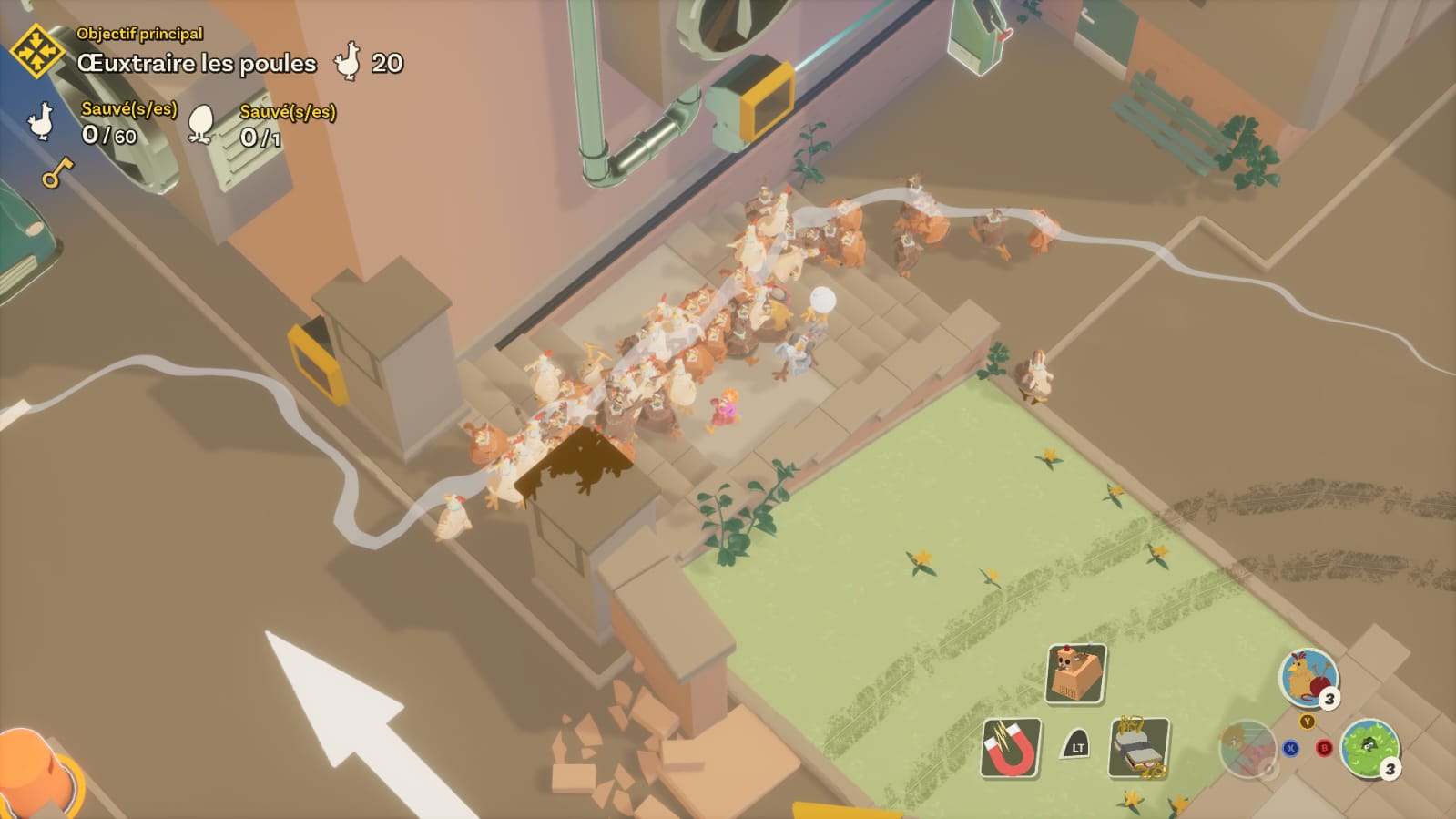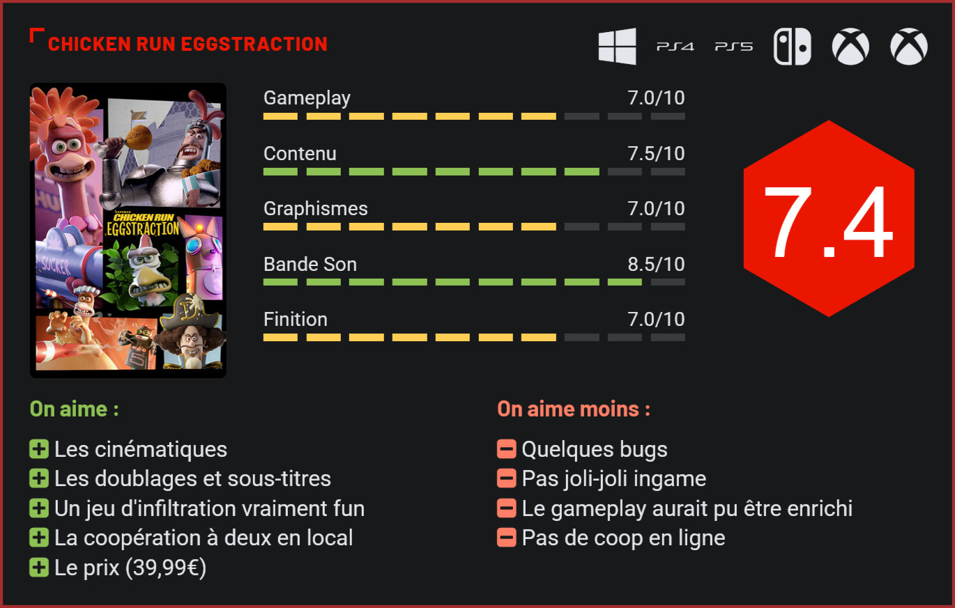 C’était sans doute le titre qu’on attendait le moins dans la rédaction en cette fin d’année. Et pourtant, Chicken Run Eggstraction est l’une des excellentes surprises de cette année 2025. Explications. Edité par Outright Games, un distributeur qui n’a pas l’habitude de décrocher des titres de jeu de l’année, Chicken Run Eggstraction est un petit jeu indépendant basé sur la célèbre licence Chicken Run, qui se présente comme un mélange de jeu d’action / infiltration et de puzzle game. Une formule séduisante, qui est supportée par une réalisation soignée, avec des cinématiques réalisées par le studio Artman, auteur des films Wallace & Gromit. Le scénario est mis en scène à travers de jolies cinématiques. Pad en main, le jeu se présente donc comme un jeu d’action en vue isométrique (du dessus). On commande un ou plusieurs poulets, qui disposent de capacités uniques comme une charge qui va permettre de mettre K.O. un adversaire par exemple, ou un l’envoi d’un leurre. Objectif : s’infiltrer dans des complexes pour sauver tous les poulets. Pour ce faire, il faudra éviter les rondes des ennemis, neutraliser les caméras, activer des interrupteurs, éviter des pièges et faire preuve de jugeotte, le jeu lorgnant un peu du côté du puzzle game. Rien de très complexe, mais comme évoqué au début de l’aventure, il vaut mieux avoir un plan avant de se lancer ! Surtout que les choses pourront vite dérailler au moment de libérer les autres poulets, qui se rueront vers la sortie comme une horde de zombies décérébrés… quitte à y perdre quelques plumes. Le jeu reste très classique dans sa construction, mais son ton décalé, son univers coloré et ses missions originales en font un titre très plaisant à parcourir. Les missions sont nombreuses mais assez courtes. Si l’aventure n’est pas bien longue, on trouve tout de même largement de quoi se donner l’envie d’y retourner avec des missions secondaires à boucler pour obtenir plus de crédits pour débloquer de meilleures capacités pour ses personnages et un mode coop proposant des missions uniques. A 39,99€, voilà donc un petit jeu décomplexé très amusant à faire seul ou entre amis, et capable de séduire aussi bien les plus grands que les plus petits. C’est le moment de fuir, tout peut vite dégénérer ! Côté technique, le titre se défend plutôt bien, même si ce sont les cinématiques réalisées par le studio Artman et les doublages en anglais (sous-titrés français) qui le tirent vers le haut. Ingame, c’est un peu plus terne, mais on est face à un jeu indé à petit budget, rappelons-le. Le titre n’est d’ailleurs vendu que 39,99€, un tarif très correct au vu du contenu proposé. Alors non, ce n’est pas le jeu de l’année, et en terme de timing on a un peu de mal, il n’y a pas de nouveau film à l’horizon et le titre ne sait pas se reposer sur la popularité de la franchise, qui a pratiquement disparu des radars, mais que vous aimiez ou non les films d’animation Chicken Run, c’est un petit jeu très sympa et surtout une très bonne surprise venant d’Outright Games, qui nous livre probablement son meilleur jeu depuis quelques années ! Conclusion On n’en attendait pas grand chose, Chicken Run Eggstraction est pourtant une très bonne surprise ! Ce petit jeu indépendant a été développé par les studios Artman, auteur de la saga Wallace & Gromit et des films Chicken Run. Visuellement, c’est très fidèle aux films d’animation, avec des cinématiques superbes et des doublages en anglais impeccables. Le jeu en lui même est également vraiment plaisant. Il se positionne comme un mélange de jeu d’infiltration en temps réel et de puzzle-game. Votre objectif : sauver tous les poulets destinés à l’abatage. Vous aurez à votre disposition des gadgets et pouvoirs. Fun, décalé, fidèle à l’univers des films, Eggstraction est une véritable bouffée d’air frais. Un titre séduisant à parcourir seul ou en coop en local, et vendu 40€ environ. Alors non, ce n’est pas le jeu de l’année ni une claque visuelle, mais quel titre vraiment plaisant, pour les plus grands comme pour les plus petits.