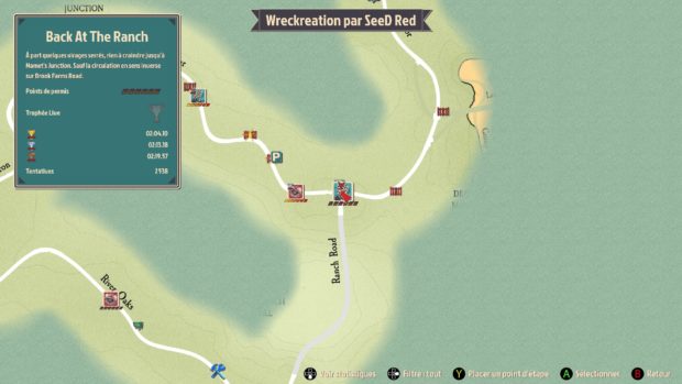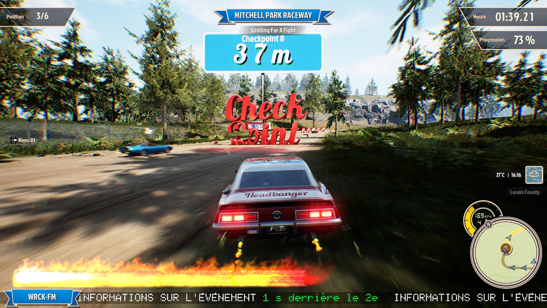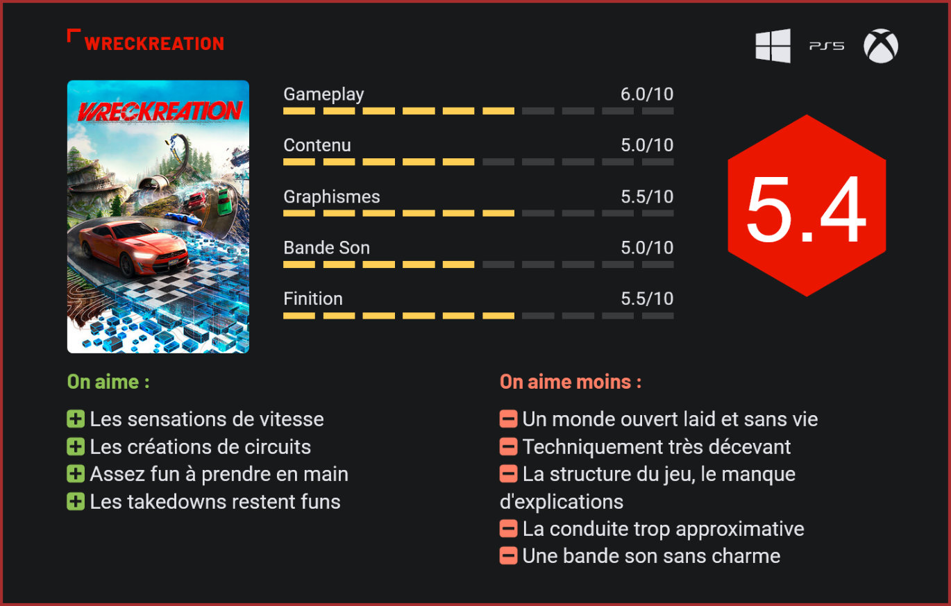 Annoncé il y a quelques mois seulement, Wreckreation copie la plupart des spécificités du légendaire jeu de course arcade Burnout, sans jamais égaler son modèle. Quelle drôle d’idée du studio Three Fields Entertainment d’avoir annulé son très prometteur Dangerous Driving 2, la suite d’un clone de Burnout, pour développer un projet beaucoup plus ambitieux avec des moyens si limités. D’une part, parce que Dangerous Driving 2 était dans un état déjà bien avancé à l’époque et paressait prometteur. Sans décrocher des notes mirobolantes, son prédécesseur était parvenu à séduire une certaine audience, en se positionnant comme un clone un peu cheap de l’excellent Burnout. D’autre part, parce que si le studio avait du talent, il n’avait clairement pas les reins assez solides pour développer un titre aussi ambitieux… On est de facto passé d’un petit jeu de course arcade sans prétention à un énorme projet de jeu de course open world avec un système de création de circuits. Visuellement, ce n’est pas très glorieux. Et dès le premier contact, on se rend compte que le jeu est loin d’être terminé. Pas de tutoriel au programme – une voix vous dictera de façon extrêmement banale quelques possibilités offertes par le jeu. La première course du titre donne le ton : Wreckreation est un jeu de course arcade sans âme qui plagie sans honte Burnout et n’apporte rien de bien original sur la table si ce n’est son mode de création de circuits dans les airs, inspiré de Trackmania. Visuellement, le jeu est pauvre. Les bolides sont certes joliment modélisés, mais les environnements sont ternes, les éléments des décors semblent avoir été récupérés dans des packs d’assets en ligne, la mise en scène dramatiquement pauvre. Les jolis effets visuels sont là pour jouer les cache-misère. Les sensations de vitesse sont au rendez-vous, c’est ce qui sauve le jeu. Pad en main, ce n’est également pas très glorieux. Les sensations de vitesse sont au rendez-vous et le jeu n’est pas déplaisant à jouer, mais la physique est à la masse, le jeu est très bugué et la conduite manque horriblement de précision. Pire : les premières heures de jeu on ne comprend rien à ce qu’on est censé faire. On se retrouve plongé dans un monde ouvert pratiquement sans aucune information, ni aucun menu. On apprend petit à petit à se repérer sur la carte, qu’il faudra explorer dans sa totalité pour débloquer défis et courses. On découvre un peu au hasard qu’on peut changer de véhicule sur les parkings ud jeu (drôle d’idée ?). On retrouve aussi tous les éléments de la formule Burnout avec des panneaux à défoncer, des courses et défis en tous genres, des séquences de crash et même le fameux système d’aftertouch de la série. Tout le gameplay repose d’ailleurs sur le plaisir d’envoyer valdinguer ses adversaires dans les décors, ce qui débloque toujours plus de nitro pour accélérer. Le système est toutefois très approximatif et loin d’être aussi bien optimisé que celui des Burnout – il y a peu d’enchainements et combos possibles. Le jeu essaye désespérément d’être aussi cool que son modèle. Si Dangerous Driving y était plus ou moins arrivé, Wreckreation rate le coche pour une bonne raison : le jeu tente d’en faire beaucoup trop avec son monde ouvert vide et sans saveur, son race-design pauvre, ses courses arcade approximatives et son système de création de circuit à l’inverse plutôt réussi. Les développeurs devaient pourtant bien s’en douter, il serait très difficile d’essayer de créer un jeu de la trempe d’un Burnout en open world en y intégrant des éléments de gameplay d’un Trackmania avec des effectifs 10 à 20 fois moins nombreux que ceux des équipes qui bossent sur des jeux de course de cette trempe en général… Pourquoi diable ne pas s’être contenté d’un jeu de course arcade segmenté par niveaux ou d’un clone de Trackmania. Les différents éléments de Wreckreation – le monde ouvert, la conduite arcade, les takedowns et la création de circuits ne vont pas forcément bien ensemble. La carte du jeu n’a aucune âme, tout comme son monde ouvert. Si Wreckreation nous a terriblement déçus, précisons toutefois que le jeu est loin d’être mauvais. Cela reste un jeu de course arcade fun avec quelques idées sympas (notamment, le mode création). Son design très générique, sa conduite moyenne et sa réalisation assez pauvre en font toutefois un titre dispensable. Conclusion Si prometteur sur le papier, Wreckreation rate le virage à sa sortie. Pas très joli, avec son design générique et son monde ouvert vide, le jeu de course arcade de Three Fields Entertainment tente d’en faire beaucoup trop en mêlant open world, course arcade, créations de circuits et loopings dans les airs, et takedowns façon Burnout. Un mélange de Trackmania, de Forza Horizon et de Burnout qui ne prend pas vraiment. Très générique dans sa conception, le projet était voué à être un échec car bien trop ambitieux pour une si petite équipe… C’est dommage car pad en main, le jeu n’est pas déplaisant et procure même de solides sensations de vitesse.