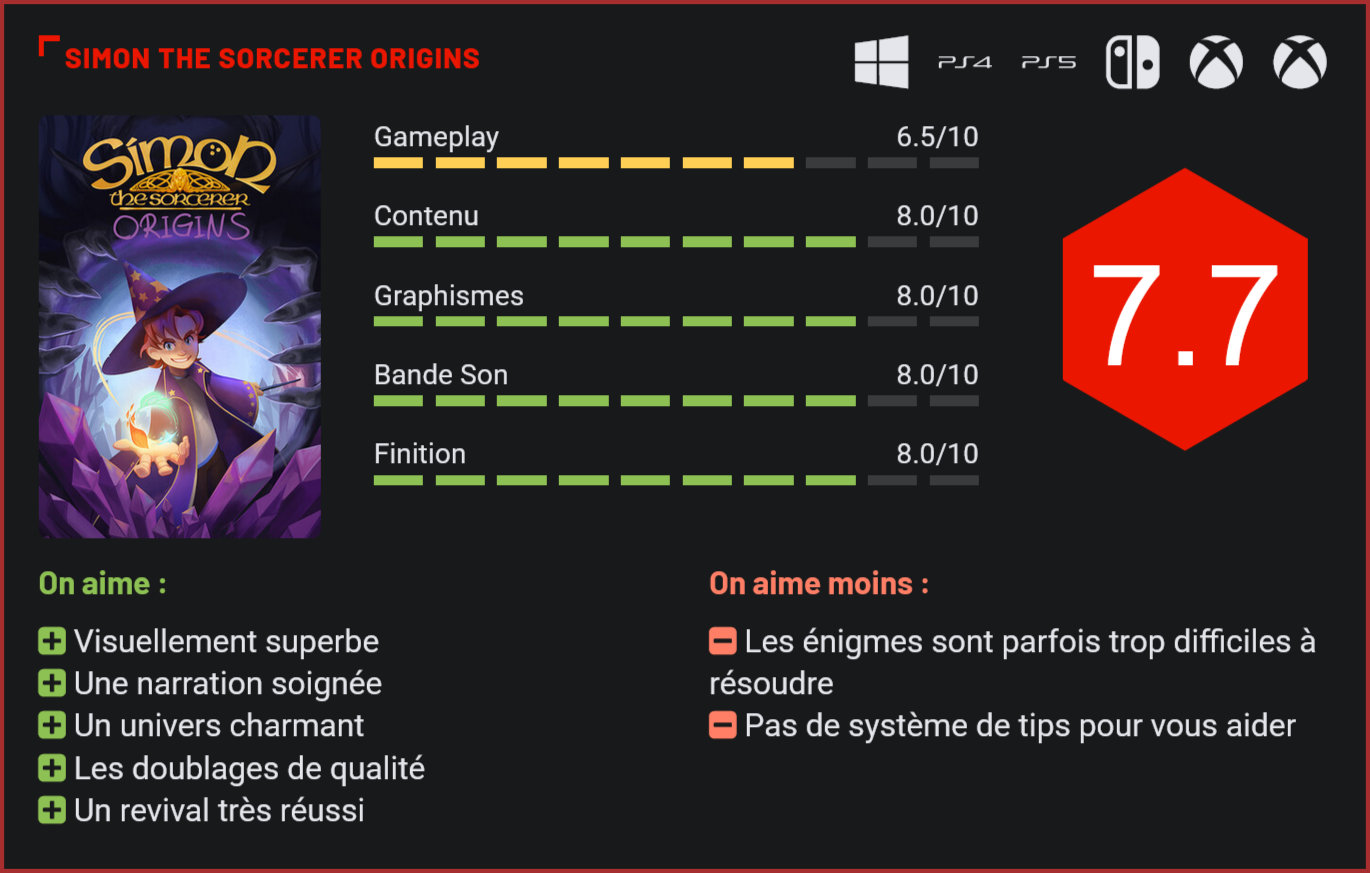 Les points & click n’ont plus trop la cote. Plusieurs studios s’évertuent pourtant à ressusciter des licences cultes. Après Sam & Max et Monkey Island, c’est au tour de Simon the Sorcerer de revenir d’entre les morts. Sorti en 1993, Simon the Sorcerer n’était peut-être pas considéré comme le point & click le plus mythique, mais son univers était parvenu à séduire des joueurs. Plus de 30 ans plus tard, le studio italien Smallthing Studios lui offre une préquelle baptisée Origins. Visuellement, le jeu est charmant. Dans ce point & click des plus traditionnels, on incarne Simon, un jeune garçon de 11 ans qui vient d’aménager dans une nouvelle maison avec sa famille et qui se retrouve aspiré par un portail dans un monde magique. Pour retrouver ses proches, il devra maîtriser l’art de la sorcellerie et résoudre une ancienne prophétie. Le choix de la préquelle est intelligent de la part du studio italien, puisqu’il n’est pas nécessaire d’avoir joué au premier jeu pour se lancer dans cette aventure. Pour résoudre les énigmes, il faudra généralement tester des tas de combinaisons différentes. Pad en main, Simon the Sorcerer nous rappelle étrangement Monkey Island avec son esthétique qui rappelle les films d’animation des années 90, ses énigmes complexes et improbables et son gameplay qui va vous forcer à tester des tas de combinaisons différentes. Le plus gros atout du jeu, c’est son univers graphique. On a vraiment l’impression de jouer à un film d’animation interactif. L’esthétique est superbe, du character design aux décors, chargés de détails. Côté gameplay, c’est une formule très classique, on interagit avec tous les éléments présents à l’écran pour récupérer des objets qui vont ensuite nous servir pour résoudre des énigmes et progresser dans l’aventure. L’ennui, par rapport à un point & click classique, c’est que les énigmes paraissent outrageusement complexes alors qu’elles ne sont en réalité que totalement surréalistes. Il faut tester des tas de combinaisons pour trouver la solution à une énigme ou résoudre un puzzle, la logique ne primant pas. C’est caractéristique d’un jeu comme Monkey Island, mais à la différence de Monkey Island, Simon the Sorcerer se prend un peu plus au sérieux. Le joueur n’a aucun indice sur ce qu’il faut faire et devra s’en référer à son journal, dans lequel on retrouve un résume du récit… qui ne donne souvent pas d’indice non plus sur les objectifs. C’est typiquement le genre de jeu où on se retrouve bloqué des dizaines de minutes et on finit par chercher la solution en ligne. Simon the Sorcerer Origins peut donc se montrer très frustrant, et c’est sans doute son plus gros défaut. Esthétiquement, le jeu est superbe. Pas mal d’éléments ont toutefois été ajoutés pour vous simplifier la vie également, comme les voyages rapides, qui vous éviteront de longs allers-retours entre les différents panoramas. Mieux : le jeu a droit à un doublage intégral, ce qui est plutôt impressionnant pour une petite production indépendante, d’autant plus que la qualité est au rendez-vous. Techniquement très réussi, plutôt agréable à jouer, offrant une solide expérience narrative et assez costaud niveau contenu, Simon the Sorcerer Origins est une vraie bonne surprise qui surprendra agréablement les amateurs du point & click. Il risque en revanche d’être un peu trop complexe pour les plus jeunes. Malgré son design, il ne cible pas un public enfantin. Conclusion Après Sam & Max et Monkey Island, une autre légende du point & click a droit à une remise au goût du jour. Visuellement superbe, cette préquelle au premier Simon the Sorcerer est un vrai film d’animation interactif. Il reprend la formule très classique des point & click avec la collecte d’objets et la résolution d’énigmes, dans des décors somptueux. Plaisant à parcourir, entièrement doublé et fidèle au matériau d’origine, Origins est un très bon point & click, qui souffre toutefois d’un gros défaut : les énigmes sont souvent complexes ou du moins leurs résolutions ne sont pas évidentes… On finit donc souvent par tourner en rond pendant 10 ou 20 minutes à chercher une solution, sans aucun indice sur l’objectif… Par conséquent, il se destine avant tout à un public de passionnés, et pas forcément aux plus jeunes…