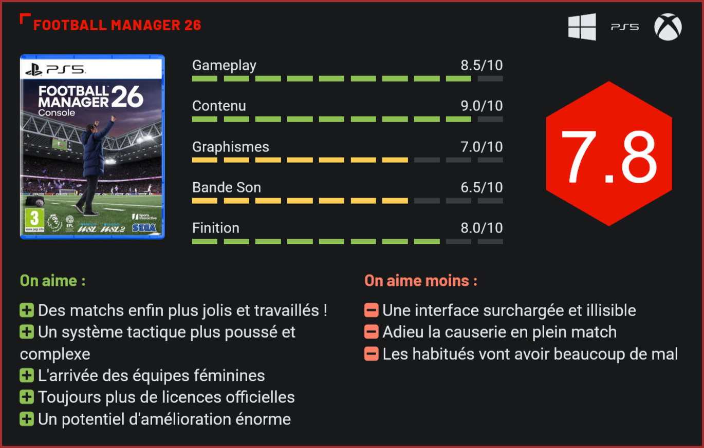 Après une année d’attente et une annulation historique, Football Manager 2026 marque la véritable révolution de la série. Nouveau moteur Unity, interface repensée et football féminin : SI change tout, quitte à déboussoler ses fidèles. Les deux dernières années ont été très éprouvantes pour les fans de Football Manager. L’épisode de 2024 avait rencontré un franc succès, tant sur le plan critique que commercial, parvenant à réunir 14 millions de joueurs. Dans la foulée, les équipes de Sports Interactive annonceront FM 2025, censé révolutionner la franchise avec l’arrivée du moteur Unity et une toute nouvelle interface. Annoncé pour novembre 2024, il sera ensuite reporté à mars 2025, avant d’être purement et simplement annulé. Tous les regards se tourneront alors vers FM 26, attendu comme le grand Messi (vous êtes fort si vous l’avez…) pour la fin 2025. Pour Sports Interactive (SI) et Sega, l’erreur n’était pas permise avec cet épisode synonyme de révolution. Des années durant, l’un des seuls reproches émis à propos de la licence était la faible technique et des visuels très datés. Avec cette révolution annoncée depuis deux ans, SI rebat totalement les cartes : interface totalement repensée, arrivée des équipes féminines, moteur de jeu plus moderne… Ce n’est plus du tout le même jeu, mais les habitués vont-ils y trouver leur compte ? Avant toute chose, il est important de préciser que le jeu auquel tout le monde est en train de jouer est une bêta, laquelle est constituée d’un nombre important de bugs. La version finale n’est pas attendue avant ce 4 novembre, date à laquelle un important patch devrait résoudre un grand nombre de problèmes de stabilité, de fluidité ou d’interface. C’est bien simple : la bêta est sortie le 23 octobre dernier et semble déjà nettement améliorée aujourd’hui. SI a amélioré quelques mécaniques et fluidifié le tout. Attention toutefois, l’interface, elle, ne devrait pas bouger d’ici là. Pour les habitués, la nouvelle interface fait un véritable choc. Avec FM 26, SI veut que sa poule aux œufs d’or touche un maximum de monde, en ce compris ceux qui n’avaient jamais osé franchir le pas face à l’interface austère des précédents épisodes. Et dès que l’on lance le jeu, impossible de ne pas être perdu dès les premières heures. Là où Football Manager était réputé pour son interface intuitive et simple malgré la surabondance de textes, ce cru 2026 adopte une interface qui divise. Dès la sortie de la bêta, les joueurs hardcore de FM ont émis des critiques virulentes sur ces menus trop colorés, divisés en plusieurs blocs qui s’ouvrent en fenêtres pop-up dont on peine à discerner les informations les plus pertinentes. Dans un souci d’uniformiser l’interface et le code couleur entre FM, FM Touch et FM Mobile et de rendre les menus moins austères, Sports Interactive semble avoir oublié le principal : convaincre les habitués de la licence que le choix de passer à une toute nouvelle interface est le bon. Parce qu’en l’état, beaucoup risquent de poursuivre leur chemin sur FM 24 en attendant l’opus de l’année prochaine. Là où les habitués connaissaient le jeu comme leur poche et prenaient moins de trois clics pour trouver l’info nécessaire, FM 26 requiert énormément de temps pour s’y retrouver. Votre humble serviteur approche la vingtaine d’heures de jeu et ils continuent pourtant à trouver de nouveaux menus enfouis dans les méandres de l’interface après avoir, pourtant, dépassé les 410 heures de jeu sur FM 24. Visuellement, ce n’est pas du niveau d’EA Sports FC, mais il y a une réelle évolution grâce à Unity. Pourtant, Miles Jacobson et ses équipes ne sont pas nés de la dernière pluie, et ils connaissent mieux que quiconque leurs fans. Difficile de ne pas imaginer qu’ils ont des idées plein la tête et que cet épisode est l’occasion de repartir d’une feuille blanche, de reprendre les mêmes excellentes idées puis de les peaufiner et de les agrémenter dans les années à venir. Ils sont d’ailleurs extrêmement attentifs aux réactions des fans, et nul doute que les avis émis depuis le 23 octobre sont déjà attentivement scrutés. Cette nouvelle interface a beau, certes, sembler compliquée à appréhender, elle est toutefois promise à un bel avenir si l’on se fie sur l’expérience des développeurs, qui annoncent cet opus comme la première d’un socle sur 25 ans. Il faut savoir raison garder : l’ancienne interface a été lancée il y a plus de dix ans et n’a connu que de légères améliorations esthétiques. Tout ce qui est nouveau ou étranger fait peur, il faudra un temps inévitable d’adaptation. Cet aspect des choses abordé, attaquons désormais l’autre grosse nouveauté de cet opus : le moteur de jeu. Pour la première fois de son histoire, Football Manager tourne désormais sous Unity. C’est d’ailleurs la raison de l’annulation de l’épisode de l’année passée, mais qu’est-ce qu’elle est justifiée ! Certes, FM ne rivalisera pas de sitôt avec EA Sports FC d’un point de vue des graphismes et bien que ce ne soit pas la raison d’être de la licence, cet épisode est assurément le plus beau de toute la franchise. Les effets de lumière ont été retravaillés, les stades mieux modélisés et, surtout, les animations des joueurs sur la pelouse grandement améliorées ! Pas de motion-capture toutefois, ni de photoréalisme, mais FM 26 fait plaisir à voir sur ce point. Ligue des Champions, Premier League et bientôt Coupe du monde sous licence ! Mais FM 26, ce n’est pas uniquement une révolution des visuels et de l’interface. C’est aussi tout un tas de modifications et d’ajouts (et de suppressions, nous y reviendrons) qui font sincèrement plaisir à voir. Parmi celle-ci, notons une base de données déjà conséquente enrichie avec l’ar