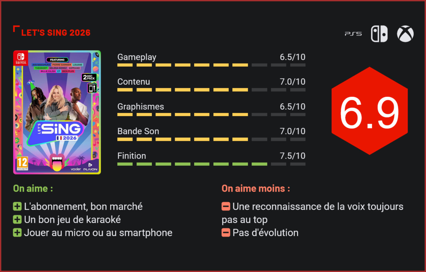 Fidèle à ses habitudes, Voxler continue à livrer une nouvelle version de son jeu de karaoké phare chaque année, sans pour autant en changer la formule. Si la série avait enfin eu droit à une refonte en 2024 avec l’épisode 2025, Voxler reprend ses mauvaises habitudes en nous livrant une simple réédition, avec quelques toutes petites nouveautés pour l’épisode 2026. L’interface reste lisible. Comme les années précédentes, les acheteurs ont le choix entre la version bundle vendue avec deux micros et la version digitale, ainsi que deux versions chez nous : les hits français qui comprend une majorité de morceaux en français et les hits internationaux qui comprend une playlist essentiellement en anglais. On retrouve au total 40 titres parmi lesquels “Birds of feather” de Billie Eilish, “Single Soon” de Selena Gomez ou encore “2step” d’Ed Sheeran. Comme les années précédentes, les meilleurs morceaux sont toutefois cachés derrière un pass mensuel payant – heureusement pas trop cher -, qui donne accès à un joli catalogue de morceaux, plus de 180 titres pour 3,99€/mois. Ce qui reste très décent. Pas de nouveautés au niveau des modes de jeu, on retrouve le mode carrière dans lequel on va devoir enchainer les défis pour accumuler les fans, le mode Classic qui permet de jouer jusqu’à quatre joueurs, le mode Feat pour les duos, le LS Fest un mode en ligne avec des battles en temps réel. Rien de très glorieux, la formule de l’an passée était solide mais on aurait aimé au moins une nouveauté. Le jeu évolue très peu au niveau de la proposition. Les nouveautés de cette cuvée 2026 se réduisent à peau de chagrin. Tout au plus l’esthétique a été retravaillée un peu et on trouve désormais une barre de progression quand on joue à plusieurs, qui permet de savoir qui mène la partie… Vous l’aurez compris, Voxler s’est contenté du minimum syndical et c’est bien dommage. On s’en doute, le studio travaille déjà sur la suite, qui devrait logiquement apporter plus de nouveautés. Alors faut-il craquer pour cette cuvée 2026 ? Oui, c’est un très bon jeu de karaoké, si vous n’aviez plus touché à la série depuis 2 ou 3 ans. Non, si vous aviez joué à l’un des derniers opus. L’absence de nouveauté fait de cet opus un épisode dispensable. Reste que pour le nouveau venu, cela reste une bonne affaire. Avec moins de 45€ de budget, vous avez droit à un jeu de karaoké, ses 40 morceaux de base et un catalogue de 180 titres. Conclusion Cette cuvée 2025/2026 de Let’s Sing ne marquera pas les esprits. Voxler s’est contenté du minimum syndical niveau contenu. Les nouveautés se comptent sur les doigts d’une main. Du coup, ça a peu d’intérêt de craquer si vous aviez joué à l’une des précédentes versions. Inversément, le titre est plutôt complet pour ceux qui n’auraient pas touché à un jeu de karaoké depuis quelques années. L’abonnement permet aussi de récupérer plus de 180 titres pour s’éclater en famille. Alors pourquoi pas ?