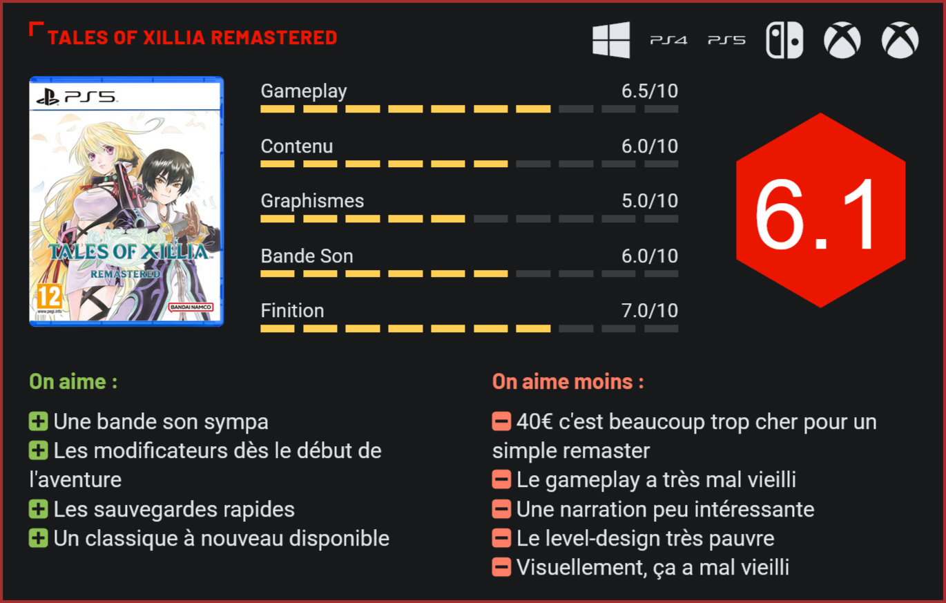 Sorti en 2011 sur PS3, Tales of Xillia n’est pas considéré comme le meilleur épisode de la saga par les fans. Ca n’a pas empêché Namco Bandai de se lancer dans le développement d’un remaster… Quand on pense à la série des Tales of, l’épisode Xillia n’est probablement pas celui qui vous vient le premier en tête. Avec ses allers-retours incessants, son gameplay clivant et son histoire peu inspirée, le jeu de Namco Bandai n’avait pas fait l’unanimité en son temps. C’est aussi l’un des plus vieux de la saga, à avoir droit à un remaster sur les consoles de dernière génération. Et on ne va pas vous mentir, si on aime toujours autant la saga, Xillia a très mal vieilli. Les combats sont dynamiques mais assez bourrins, malgré quelques subtilités. Ne l’oublions pas, le titre était sorti à l’époque sur PS3, il y a donc déjà deux générations de cela. Visuellement, il a droit à un léger upgrade, mais rien qui ne justifie de repasser à la caisse pour l’acheter au prix auquel il est proposé – 40€ tout de même. De façon générale, ce remaster est d’ailleurs timide niveau nouveautés, Bandai Namco s’étant contenté d’ajouter un système de sauvegarde rapide, les DLC vendus à l’époque séparément, un accès anticipé à la boutique qui permettra de se faciliter la tâche en activant des modificateurs (gain de 2x plus d’expérience par exemple), ou une option pour passer les combats. Pas de nouveaux contenus développés spécifiquement pour l’occasion, ni de “remake” à l’horizon donc. Le tarif est donc bel et bien assez élevé pour une “réédition”. Surtout que le second volet n’est même pas livré avec. La plus belle originalité de ce RPG, c’est sans doute son système de paliers à déverrouiller dans la boutique. Alors certes, on est très content de pouvoir remettre la main sur ce classique du JRPG, mais on aurait aimé le faire dans de meilleures conditions. Car même niveau gameplay, Xillia a atrocement vieilli. Xillia est l’un des épisodes les plus dirigistes de la série avec des décors extrêmement linéaires, un level-design un poil labyrinthique, des allers-retours intempestifs et surtout un gameplay assez bourrin – bien que plein de subtilités. C’est, à peu de choses près, du button smasher avec une dose de tactiques : les attaques spéciales et combos d’équipe apportent un peu de technicité aux affrontements. Reste que quand on avance dans les niveaux, on doit parfois enchainer une quinzaine de combats tous identiques dans la même zone de jeu… Niveau combats, on est quelque part entre le temps réel et le tour par tour, les personnages se battant “en direct” mais le joueur devant passer par les menus pour activer un objet par exemple. S’il est plein de bonnes idées, comme le déblocage des upgrades chez les marchands, la vente de matériaux ou les bonus / malus de sorts, il faut bien admettre que Xillia n’a plus rien de très original en 2025. Certains pans du jeu ont très mal vieilli, à l’image du level-design qui vous fait opérer des allers-retours intempestifs, de l’abondance de combats, des quêtes secondaires peu intéressantes ou du manque de diversité dans les décors – atrocement vides soit dit en passant et plutôt étriqués. Visuellement, ça a plutôt mal vieilli. Côté narration, c’est loin d’être aussi le haut du panier. Tales of Vesperia était par exemple beaucoup plus abouti, alors qu’il était sorti à peu près à la même époque. Les cinématiques sont réussies, mais l’intrigue, les dialogues et les personnages sont creux. Clairement, ce remaster s’adresse aux fans purs et durs de la franchise, qui seront sans doute ravis de pouvoir redécouvrir cet épisode en mode accéléré avec les différents modificateurs de difficulté – sans doute la meilleure idée de cette réédition. Pour les autres, ça sera sans difficile de s’y intéresser. D’autant plus que la saga compte tellement plus d’épisodes plus modernes à son actif. Conclusion Sorti en 2011 sur PS3, Tales of Xillia n’est pas le meilleur épisode de la série. Namco Bandai lui offre toutefois un remaster qui a le mérite de proposer un mode accéléré avec les différents modificateurs de difficulté accessibles dès le début du jeu. Heureusement, car entre son scénario un poil soporifique, ses dialogues creux et son gameplay qui a mal vieilli, Xillia ne laisse pas un souvenir inoubliable. Ce remaster se veut très léger en nouveautés : l’esthétique n’a presque pas évolué et le jeu n’intègre par défaut que le contenu endgame et les DLC d’époque. A 40€, l’addition est donc salée. Reste qu’il est toujours aussi plaisant de redécouvrir un classique du JRPG sur les consoles de dernière génération.