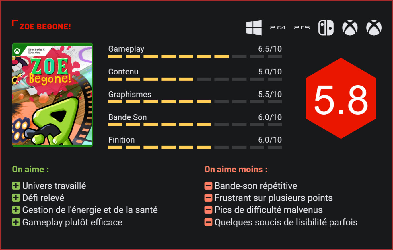 Prenez les mécaniques de jeu d’un run ‘n’ gun, ajoutez-y celles d’un shoot them up, mélangez le tout en incorporant une direction artistique rappelant les films animés des années 30, secouez bien fort. Vous obtenez ZOE Begone!, un titre à part qui offre un cocktail composé de bonnes surprises, d’un défi relevé et de frustrations. ZOE Begone! tente de se démarquer de la masse en misant sur son concept et sa direction artistique pour créer une expérience unique… qui s’avère malheureusement frustrante sur bien des points. Comme dans beaucoup de run and gun et autres schmups, la partie scénarisée est minime, offrant simplement un contexte pour tirer sur tout ce qui bouge. En l’occurrence, Zoe veut se reposer mais un animateur taquin a décidé de l’empêcher de dormir. Notre personnage prend donc son flingue pour tirer sur tout ce qui bouge, les outils de l’animateur compris. ZOE Begone! se démarque clairement au niveau de la direction artistique. Le jeu s’inspire de l’animation des années 30 dessinée directement sur pellicule. Le tout est dessiné à la main. Notre personnage est une sorte de triangle avec des pattes tandis que les ennemis prennent généralement des formes géométriques, en plus des outils de l’Animateur (pinceau, scalpel, feutre, etc.). Cela confère un certain cachet au jeu qui est appréciable. Les effets de flou traduisent un certain mouvement et chaque forme permet d’identifier un type d’ennemi et donc un pattern à retenir pour le vaincre rapidement. Malgré tout, le fond reste toujours le même et l’idée de faire évoluer Zoe au sein d’une arène en boucle prenant la forme d’une pellicule renforce le sentiment de tourner en rond. De même, la bande-son boogie est sympathique mais s’avère bien vite trop répétitive, ce qui est frustrant. Zoe esquive les tirs du pinceau de l’Animateur La prise en main est plutôt rapide. Le stick sert à tirer de manière automatique et les gâchettes sont utilisées pour faire des dashes horizontaux ou verticaux. Dans les deux cas, le but est d’infliger des dégâts aux ennemis touchés tout en bénéficiant de quelques instants d’invulnérabilité. Avec le dash vertical, on peut (doit même) en plus toucher des éléments au sol limités qui permettent de recharger son énergie (utilisée pour voler et dasher) ou encore de récupérer de la santé. Sinon, dans les airs, Zoe ne peut tirer que vers la gauche ou la droite, tandis qu’une fois au sol, elle peut tirer dans cinq directions. Dommage de limiter cette possibilité à l’aspect run ‘n’ gun, surtout que certains passages empêchent de rester au sol et que d’autres manquent de lisibilité. Pour le reste, il faut être rapide et agressif pour enchaîner les éliminations, ce qui permet de gagner des pommes (à utiliser pour obtenir quelques power up classiques) et de cumuler des points en faisant grimper le multiplicateur. Quelques pièges sont de la partie, certains créant des pics de difficulté, même en facile, qui ajoutent une certaine frustration. Au moins, le défi est là. Dommage que le tout manque de variété et que chaque partie (il faut traverser 5 niveaux composés de quatre sections) finisse par ressembler à la précédente à quelques détails près. Et ce ne sont pas les deux modes supplémentaires à débloquer qui vont changer ce sentiment. Conclusion Pour 9,99€, ZOE Begone! est un shooter qui pourra ravir les amateurs de difficulté qui recherchent un concept à la croisée des genres (entre shmup et run ‘n’ gun) et un certain défi. La réalisation est appréciable, même si le tout manque de variété. Il en va de même pour les musiques, agréables, qui tournent vite en boucle. Néanmoins, le titre engendre quelques frustrations, que ce soit dans l’impossibilité de tirer dans les cinq directions en l’air, dans l’imprécision des dashes qui cause parfois des dégâts non envisagés ou dans certains pics de difficulté qui demandent de recommencer injustement une séquence. Les power-ups, classiques (bouclier, vitesse améliorée, puissance du gun supérieure, modes de tirs alternatifs), apportent un plus. En somme, c’est un titre sympathique le temps d’une soirée mais, sans l’esprit compétitif pour les leaderboards, il y a fort à parier que beaucoup n’y toucheront plus une fois l’Animateur battu.
