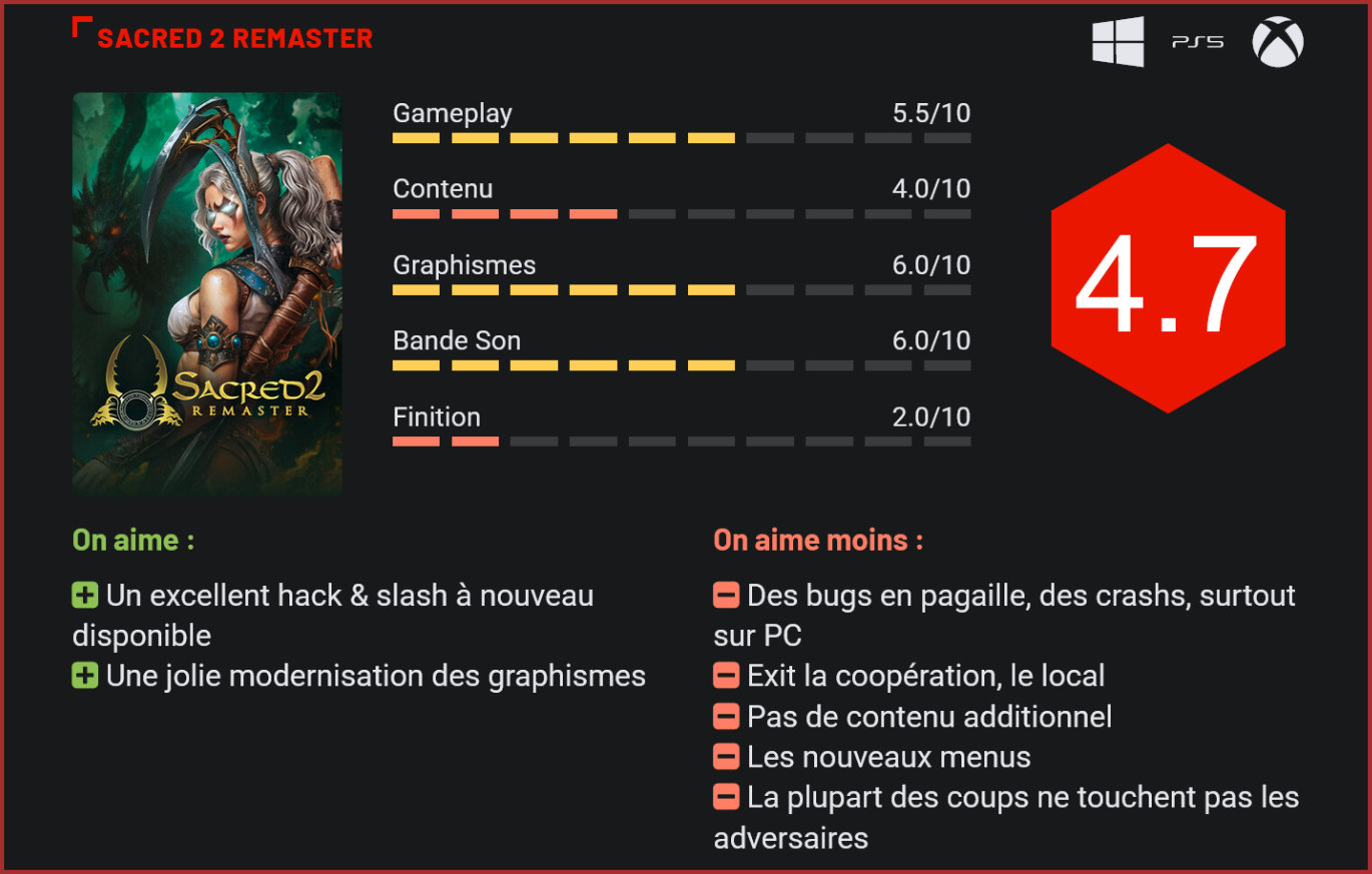 Si Diablo a renait de ses cendres avec le troisième volet, d’autres hack & slash légendaires n’ont pas eu cette chance. C’est le cas notamment de Sacred 2, qui après trois épisodes et un spin-off a sombré dans l’oubli… THQ Nordic ressuscite la saga, le temps d’un remaster. Dans le monde des hack & slash, Diablo règne en maître. Quelques autres licences sont toutefois parvenues à lui voler la vedette ces dernières années, à l’image de Titan Quest, Path of Exile ou Grim Dawn. Parmi les “ancêtres”, il en est une qui aurait bien mérité un revival. Alors certes, Sacred n’a jamais eu la profondeur ni la richesse d’un Diablo, mais il n’en restait pas moins un hack & slash très fun. Le second épisode était de loin considéré comme le meilleur de la franchise. Visuellement, le jeu a eu droit à une belle mise à jour. Alors forcément, lorsque l’éditeur THQ Nordic a annoncé un remaster du second opus, les fans se sont enthousiasmés. D’autant plus que l’éditeur promettait monts et merveilles avec des éclairages retravaillés, des textures plus fines, une distance d’affichage revue, une interface retravaillée, un gameplay peaufiné, la prise en charge de la manette et la correction de nombreux bugs. Sur le papier, cela s’annonçait fantastique. Et si l’éditeur a tenu en partie ses promesses, il avait toutefois oublié de préciser un élément central : le mode multijoueur coopératif (jusqu’à 4) a disparu. C’était pourtant l’un des arguments de vente les plus solides du titre. Car si Sacred 2 est un jeu plaisant à parcourir en solo, il l’est beaucoup plus à 2, 3 ou 4 joueurs. De surcroit, les améliorations apportées ne sont pas forcément toutes appréciées de la communauté. Par exemple, la nouvelle interface qui se veut plus moderne, réduit le nombre de slots disponibles pour les objets, armes et compétences. Pire, il n’est plus possible de se déplacer quand on est dans l’inventaire, dans un jeu où un ennemi peut vous attaquer à chaque moment. Il n’y a pas non plus de menu d’échange avec les vendeurs. Globalement, la nouvelle interface n’est d’ailleurs pas forcément plus ergonomique. Les montures en imposent. Si dans notre version Xbox Series, nous n’avons pas eu droit à beaucoup de crashs, sur PC, le feedback des joueurs est extrêmement négatif avec un nombre impressionnant de bugs et de crashs rapportés. Etonnamment, la version console semble donc plus stable. Et puis, il y a bien sûr les choix douteux, comme ces nouvelles icones dans les menus, visuellement atroces. On en a très l’impression, l’IA a probablement été utilisée abondamment dans ce remaster et c’est bien dommage car Sacred 2 méritait tellement mieux. Par rapport à la version Gold sur PC ou à la version Xbox 360, on a l’impression d’avoir droit à un véritable downgrade. Plus inquiétant encore, pad en main, on a cette désagréable impression de ne pratiquement jamais toucher un ennemi. Presque tous les coups passent à côté, alors que dans l’original, le nombre de coups effectivement porté était bien supérieur. On ignore d’où vient le problème – est-ce un bug qui sera corrigé, ou une reconstruction incorrecte du système de combat de l’original ? THQ Nordic n’a pour l’instant pas apporté de réponses aux nombreuses questions de la communauté. Clairement, ce remaster a été développé avec des moyens limités et le résultat n’est pas à la hauteur des attentes. On lui reconnaitre toutefois des visuels joliment modernisés avec des textures beaucoup plus fines et une gestion de la lumière affinée également. Le jeu n’a pas trop mal vieilli du coup, même si une fois que la caméra est proche des personnages, leurs rendus ne sont pas très glorieux. Est-ce suffisant pour craquer pour ce remaster ? Certainement pas. Que vous soyez fan de Sacred 2 ou un simple curieux, on vous suggère d’attendre des correctifs et surtout des ajouts de contenus, ou de vous tourner vers la version Gold du titre sur PC. En l’état, c’est l’un des titres les plus décevants de cette année 2025. Et c’est bien dommage vu combien on aimait l’original… Conclusion Difficile de sauver quoi que ce soit dans ce remaster qui n’intègre aucun contenu inédit, supprime des modes de jeu (notamment, la coop en local), remplace l’ancienne interface par une interface modernisée qui supprime un nombre impressionnant d’options et qui est livrée dans un état scandaleux sur PC. Sacred 2 était un très bon hack & slash en open world, avec des mécanismes uniques et un gameplay très fun. Le titre reste un classique, mais qui aurait mérité un remaster plus solide. En l’état, difficile de le conseiller, malgré les améliorations graphiques. Oui, le jeu est plus joli qu’à l’époque : textures et lumières ont été retravaillées. Mais au vu du bilan général et surtout des coupes dans le contenu, difficile de s’enthousiasmer. Il faudra de nombreuses mises à jour pour corriger le tir…