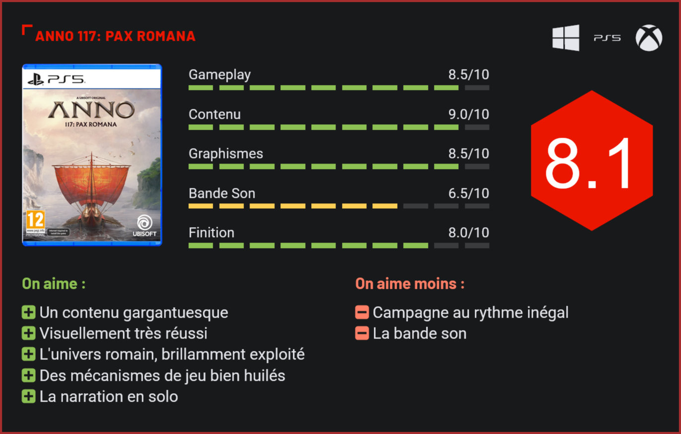 Après l’excellent Anno 1800, qui nous avait emmenés dans l’effervescence de la révolution industrielle avec ses flottes marchandes et ses usines fumantes, le studio Ubisoft Mainz revient aux sources de l’Histoire avec un nouvel opus de la saga Anno. Changement radical de décor pour cette aventure, baptisée Anno 117 : Pax Romana, qui nous plonge au cœur de l’Empire romain en l’an 117 après J.-C., une ère de paix relative et de prospérité impériale. Vous y incarnez un gouverneur ambitieux, chargé de bâtir des cités grandioses au milieu des provinces de Latium et d’Albion, où les routes pavées croisent les marais celtiques et les aqueducs majestueux. Ubisoft Mainz est devenu, au fil des années, un pilier incontesté du city-builder stratégique. Fondé en 2002, le studio a hérité de la licence Anno de Sunflowers Interactive, qui avait posé les bases de la série en 1998 avec Anno 1602 : Creation of a New World, un titre visionnaire mêlant gestion économique et exploration maritime dans un univers de colonisation. Ce premier opus, avec ses îles verdoyantes et ses chaînes de production primitives, avait posé les fondations d’une formule addictive : bâtir, optimiser, conquérir. Les suites ont rapidement élargi l’horizon temporel, emmenant les joueurs de l’Âge de la Renaissance (Anno 1404, en 2009) aux colonies lunaires d’Anno Online (2013). Mais c’est Anno 1800 (2019), qui a relancé la série et qui lui a redonné ses lettres de noblesse. Visuellement, le titre est irréprochable. Anno 117 : Pax Romana opère un virage audacieux en nous proposant d’explorer l’Antiquité romaine sous l’empereur Trajan, au zénith de la Pax Romana – cette « paix romaine » qui dura près de deux siècles et vit l’empire s’étendre de l’Espagne à la Mésopotamie. Un changement d’époque qui induit des changements notables dans l’univers du jeu : plus de rails de train ou de dirigeables, mais des fermes à blé irriguées par des aqueducs, des ports grouillants de galères et des marchés. Ce changement d’époque bouleverse les mécaniques de base. Là où Anno 1800 mettait l’accent sur l’expansion globale et les chaînes de production, Anno 117 recentre l’action sur une gestion horizontale et culturelle. Pour la première fois, les joueurs choisissent leur point de départ : une cité romaine loyale à l’empereur ou un royaume celte rebelle, influençant profondément les voies de progression. Une jolie surprise. Au niveau du gameplay, Anno 117 : Pax Romana affine la formule Anno, tout en introduisant des évolutions qui la rendent plus fluide et immersive que jamais. Le concept reste inchangé : c’est un city-builder en temps réel où vous développez des colonies en gérant ressources, besoins et expansions. Vous commencez par poser des humbles habitations pour des liberti (affranchis), puis vous montez en gamme vers des insulae pour plébéiens, des villas pour patriciens, en optimisant des chaînes de production – du blé au pain, du poisson au garum, de l’argile aux tuiles. Mais là où les précédents volets pouvaient s’embourber dans leur complexité, Pax Romana se veut plus accessible. Il est également un peu plus user-friendly, quitte à perdre un peu en réalisme. L’outil « relocaliser » permet ainsi de déplacer instantanément un bâtiment sans le détruire, évitant les frustrations de la planification ratée ; la « copie » duplique des layouts entiers pour une expansion rapide ; et les entrepôts partagés synchronisent les stocks entre îles. Le jeu se veut plus accessible que ses prédécesseurs. Les évolutions par rapport aux opus antérieurs ne s’arrêtent pas là. Fini les grilles orthogonales rigides d’Anno 1800 ; ici, vous pouvez aligner routes et édifices en biais, créant des cités organiques qui serpentent comme les voies romaines réelles. Ensuite, le système d’attributs : chaque ressource ou bâtiment impacte non plus seulement l’économie, mais des stats comme la santé, le bonheur ou la croyance. La recherche s’étoffe via un arbre élargi, débloquant des upgrades comme la récolte de bois dans les prairies. Et pour les amateurs de conquête, le retour du combat terrestre – absent depuis Anno 1404 – apporte une dimension RTS légère : infanterie, cavalerie, artillerie, avec des sièges dynamiques où vous recrutez sur-le-champ. Globalement, ces changements rendent le jeu plus accessible, mais attention, Anno 117 offre toujours un contenu riche et reste difficile à domestiquer. Il faudra y investir beaucoup de temps. On retrouve d’ailleurs un contenu généreux avec la campagne solo et sa narration soignée, le sandbox infini et le multijoueur coop/PvP. Le multijoueur, pour 1 à 4 joueurs, étend la campagne en coop ou oppose en PvP via des duels économiques ou militaires – une nouveauté par rapport à 1800, où le coop était limité au sandbox. Côté technique, Anno 117 : Pax Romana est également une jolie réussite. Graphiquement, le jeu est un régal pour les yeux, propulsé par le Snowdrop Engine d’Ubisoft (celui de The Division), qui excelle dans les environnements vastes et détaillés. Les provinces de Latium et Albion regorgent de vie : herbes ondulantes sous le vent méditerranéen, marais brumeux d’Albion où les huttes celtiques fument au loin, aqueducs. Les textures sont si fines qu’on voit apparaitre les tuiles romaines typiques. C’est beau, très beau même. Et le ray tracing ajoute une profondeur aux eaux portuaires et aux environnements. Le jeu est également très fluide, en 60 FPS. Les combats terrestres sont l’une des nouveautés de cet épisode. L’audio, en revanche, déçoit un peu avec des musiques un peu trop cliché rappelant la gloire de Rome avec des trompettes triomphales. Les doublages en français paraissent également forcés. Conclusion Après l’excellent Anno 1800, Ubisoft Mainz nous livre un nouvel opus très séd