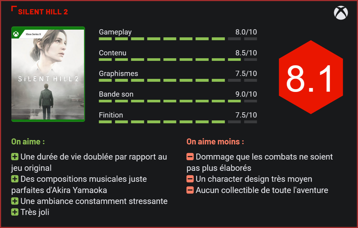 C’est devenu presqu’une habitude pour les joueurs Xbox, privés de quelques titres “temporairement” en raison d’exclusivités temporaires négociées par Sony pour sa PS5. Un an presque jour pour jour après être sortis sur PS5, ces mêmes jeux débarquent sur Xbox. Après Godfall, Bugsnax et Kena, place donc à Silent Hill 2. Icône intemporelle pour toute une génération, Silent Hill partage avec Resident Evil le titre de précurseur du survival horror. Le deuxième volet, qui fait ici l’objet de ce remake, reste d’ailleurs le chouchou incontesté de la franchise. Que l’on soit fan ou allergique au genre, difficile de garder son sang-froid devant Silent Hill. La saga a illuminé les ères PlayStation et PS2 avec des perles aujourd’hui mythiques. Silent Hill 2, régulièrement sacré meilleur opus, avait eu droit à un remaster HD en 2012, vite taxé de tiédeur. Peu importe, Konami a vu plus grand cette fois en s’alliant à Bloober Team, experts du survival horror (The Medium, Observer, Layers of Fear), pour signer l’un des remakes les plus aboutis de la décennie. L’intrigue, 90 % des puristes la connaissent par cœur. On glisse dans la peau de James Sunderland (un sosie flagrant de Leon S. Kennedy de Resident Evil), un type parti traquer son épouse supposée disparue. Sa quête le conduit droit dans les ruines embrumées de Silent Hill. C’est là le sel de la série : immersion dans une cité noyée de brume éternelle, théâtre d’événements occultes qui ont mué ses résidents en monstres sanguinaires. Aux commandes de notre avatar, on pare aux assauts de ces abominations tout en démêlant les énigmes. Bloober Team a réalisé un sans-faute sur la technique, surtout graphiquement. L’Unreal Engine 5 opère des prodiges : Silent Hill n’a jamais été aussi sublime, avec un brouillard plus oppressant, des jeux de lumière hallucinants. Au premier coup d’œil, ça semble un poil épuré, mais en zoomant sur les façades ou en pénétrant les édifices, c’est le festival de détails hyper-réalistes. Les intérieurs grouillent d’objets qui respirent la vie, boostant ce malaise d’isolement traqué par l’invisible. Une terreur viscérale, dopée par les masterpieces d’Akira Yamaoka. Si son blaze vous parle, c’est qu’il a signé toute la série Silent Hill, plus The Medium et Lollipop Chainsaw. Ses pistes glacent le sang au bon moment et émeuvent aux révélations sur James et son background. Seul hic : James cause toujours en VO anglaise. Mauvaise pioche pour les réfractaires à l’anglais sous-titré. L’ambiance est au rendez-vous. Au-delà des décors à couper le souffle, les modélisations de bestioles, héros et vilains époustouflent. L’Unreal Engine 5 rivalise sans peine avec le RE Engine de Capcom. James est le clone de Leon, de la tignasse à la foulée – on y reviendra. Quant aux animations faciales, un sans-faute absolu : expressives à bloc, elles transmettent les tourments des persos via des mimiques ultra-fines. Côté polish, par contre, le jeu patine un brin avec ses bugs. Outre des interactions capricieuses (alignement précis requis entre perso, cam et viseur), on déplore des baisses de fps en mode Performance et des plantages francs. Un futur patch devrait astiquer ça, mais pour l’instant, c’est du vu et revu sur la même config. Dans un remake, les visuels passent au niveau supérieur, mais le gameplay suit le mouvement. Adieu la cam en vue de dessus mouvante de l’original ; bonjour un OTS (over-the-shoulder) serré, boostant l’immersion – clé de voûte du survival horror. Point d’attention : le character design de ce remake frustre. Bloober Team a aussi viré plus action, au risque de diluer le pur survival. Les frissons et jump scares sont au rendez-vous, mais les hordes d’ennemis gonflées impliquent plus de bastons qu’avant. Et là, le remake pêche encore un peu face aux mastodontes Resident Evil, même si l’écart reste ténu. James traîne des pieds, sa lenteur agace, ses esquives relèvent du pile ou face. Les affrontements ? Corps-à-corps en spam R2 avec esquive foireuse, et visée firearms mollassonne imprécise. Concernant le reste du gameplay, on se retrouve avec peu ou prou le même titre qu’à l’époque, à une différence près : la durée de vie. Là où l’histoire du jeu original se terminait en près de 8 heures, ce remake double la mise avec plus de 15 heures de durée de vie. Comment les développeurs y sont-ils parvenus ? En rallongeant de nombreuses séquences qui ne duraient auparavant qu’une vingtaine de minutes et qui, aujourd’hui, dépassent l’heure de jeu. Les énigmes, toujours très bien ficelées, requièrent également tout notre engagement et notre réflexion. Une durée de vie doublée, mais ce n’est certainement pas grâce aux collectibles que l’on récoltera durant notre aventure. Si, parfois, cela peut vite devenir éreintant lorsqu’il y en a de trop, leur absence se fait terriblement ressentir dans ce remake. Nous aurions ainsi beaucoup apprécié avoir à amasser quelques items dans notre aventure, pour agrémenter le tout, et pas uniquement ces documents que l’on retrouve qui en disent plus sur l’univers. Une chose est certaine, si vous l’aviez raté sur PS5 ou PC, vous n’avez plus aucune raison de passer à côté sur Xbox ! Conclusion Bloober Team livre un remake très réussi de l’excellent Silent Hill 2. Si on pourra lui reprocher un character design pas très réussi, le titre supplante en tout point l’original, avec une durée de vie doublée, un scénario mieux narré et un gameplay modernisé. Angoissant, le jeu édité par Konami est un formidable retour en force pour la franchise et surtout le meilleur épisode de la saga.
