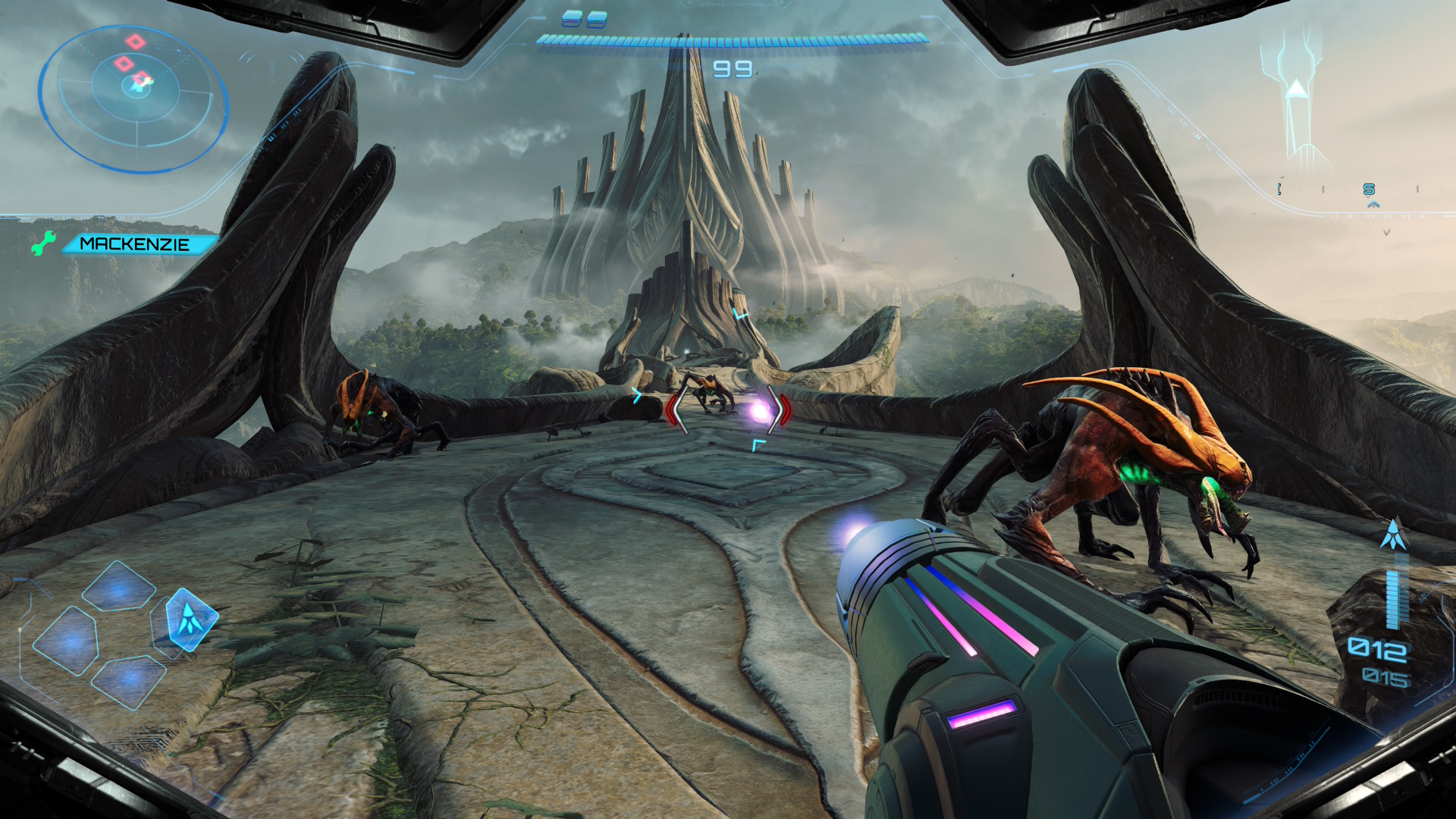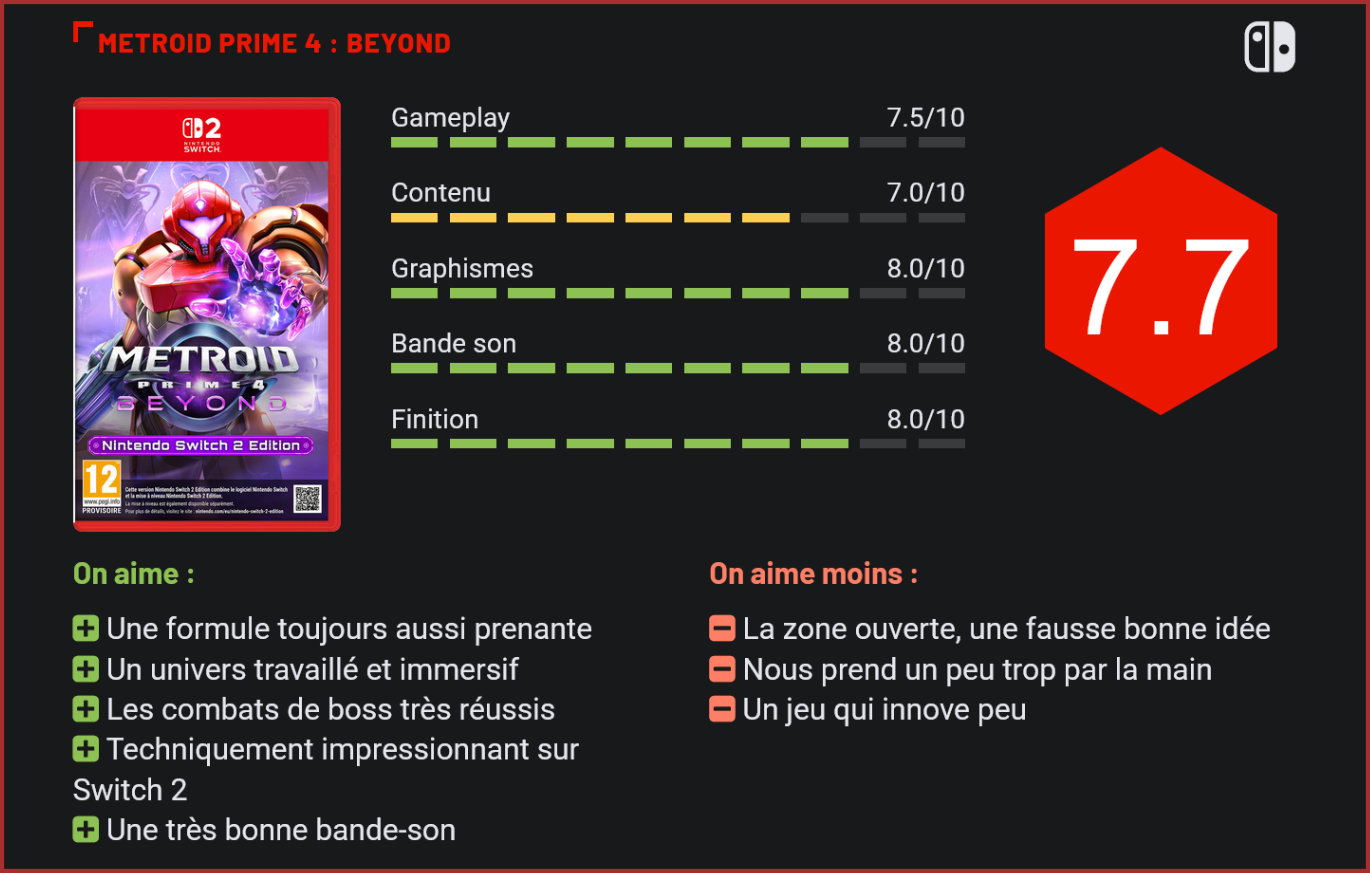 Presque vingt ans après le troisième épisode, la licence Metroid est de retour avec un nouvel opus dans la formule “Prime”. Retro Studios signe une nouvelle aventure à la première personne qui est plus que convaincante. Metroid Prime 4 : Beyond est un projet longuement attendu. Teasé dès 2007 dans la scène post-générique du troisième épisode, le jeu a finalement été officiellement annoncé en 2017 par Nintendo, avant d’être repris à zéro en 2019 et confié au studio qui a réalisé les trois jeux originaux : Retro Studios. L’équipe américaine reprend la formule de l’époque, à savoir celle d’un FPS Metroidvania, pour ce nouveau jeu destiné à la Switch, avec une édition Switch 2 en prime. Comprendre l’intrigue de Metroid Prime 4 ne nécessite pas d’avoir joué aux précédents épisodes. Nous retrouvons Samus lors d’une mission de sauvetage d’un centre de recherche de la Fédération Galactique qui se fait attaquer par des pirates de l’espace ainsi que par Sylux à leur tête, un personnage déjà croisé dans un spin-off. Alors que Samus confronte son ancien ennemi, un mystérieux artefact la transporte sur la planète Viewros, théâtre de ce nouvel épisode. L’héroïne est accueillie par le peuple Lamorn qui s’apprête à cesser d’exister. La mission de Samus est d’apporter le salut à ce peuple, et plus concrètement de trouver cinq clés qui permettront de quitter cette planète et d’emporter leur héritage vers un autre monde. Une intrigue pleine de mystère qui nous demande d’explorer les quatre coins de la planète afin d’en apprendre plus sur l’histoire de ce nouveau peuple alien. Contrairement à beaucoup d’autres épisodes de la licence, Samus croise aussi la route d’autres personnages, des membres de la fédération ayant aussi été transportés sur cette planète. Ces derniers nous accompagnent d’ailleurs brièvement durant plusieurs passages du jeu. Une aventure à la durée de vie proche des précédents Prime puisque Beyond prendra au moins une quinzaine d’heures, et environ le double pour terminer le titre à 100%. La mise en scène sait mettre Samus en valeur. La première chose qui frappe en jouant au jeu se trouve être ses nombreuses qualités techniques. Ce test ayant été réalisé sur la version Switch 2, nous ne pouvons pas nous prononcer sur les performances et les visuels du jeu sur la Switch originale. La nouvelle console de Nintendo permet cependant au titre de s’afficher en 4K et en 60 fps, ou en 1080p à 120fps. Dans les deux cas, le titre tourne à merveille et se permet également d’être bluffant visuellement. Tout n’est pas parfait, certaines textures laissent à désirer, mais Retro Studios réussit à offrir un rendu impressionnant à de nombreux moments du jeu. La bande-son est également une belle réussite, reprenant le style de la trilogie Prime, mais en y ajoutant des touches originales comme la présence plus prononcée de guitare électrique. Metroid Prime 4 : Beyond ne s’éloigne pas tant de ses prédécesseurs. Il s’agit toujours d’un FPS qui a la structure d’un Metroidvania, à savoir que les zones sont labyrinthiques et que l’on débloque de nouveaux pouvoirs qui permettent de les explorer de plus en plus en profondeur. Cette approche peut dérouter puisqu’elle implique forcément la présence plus prononcée d’exploration et de réflexion durant notre aventure. Il ne faut pas s’attendre ici à un gameplay aussi dynamique qu’un Doom, Metroid Prime 4 propose bel et bien des combats, mais c’est un jeu bien plus lent qui mise sur d’autres choses comme son atmosphère mystique et parfois inquiétante, et son univers très travaillé (dont on saisit tous les détails grâce à notre capacité à scanner la majorité des objets et décors). Le gameplay reste très proche des épisodes précédents. Le titre propose tout de même quelques nouveautés, comme l’utilisation de pouvoirs psychiques qui donnent lieux à tout un tas d’énigmes. Mais son plus gros bouleversement vient de notre découverte d’un petit monde ouvert désertique reliant les différentes zones du jeu. Ce dernier peut être exploré grâce à la Vai-O-La, une moto que nous obtenons après quelques heures de jeu. Malheureusement, cette zone ouverte se révèle être une fausse bonne idée. Elle apporte quelques activités annexes bienvenues, mais accentue aussi les quelques soucis du jeu. En plus d’être un peu vide, cette zone rallonge considérablement les nombreux moments si caractéristique du genre où nous devons revenir dans des endroits déjà explorés, ce qui peut être un peu pénible. Malgré un monde qui s’ouvre considérablement au bout de quelques heures de jeu, nous laissant ainsi arpenter cette zone ouverte, la progression reste linéaire puisque soumise à l’obtention des pouvoirs de Samus qui sont nécessaires pour débloquer tout un tas de chemins. Certains moments du titres sont d’ailleurs de véritables passages en couloir inspirés de jeux d’horreur, mais qui ne durent jamais très longtemps. Il est tout de même dommage de voir que le titre n’hésite pas à être trop intrusifs en nous prenant par la main lorsqu’on prend un peu de temps à comprendre où la quête principale veut nous emmener. La zone ouverte est malheureusement plutôt vide. Proposant plusieurs niveaux de difficulté, dont un mode difficile déblocable, Prime 4 ne résistera pas longtemps aux habitués du genre. Le titre propose également une belle flexibilité en termes de contrôles puisqu’il peut être joué classiquement à la manette, en utilisant les contrôles de mouvements des joycons (ce qui permet d’avoir une expérience proche de la maniabilité d’époque sur Wii) ou encore avec le mode souris sur Switch 2. Une dernière option que nous ne conseillons pas à cause de la forme des joycons qui peut donner mal aux mains sur de longues sessions de jeu, malgr