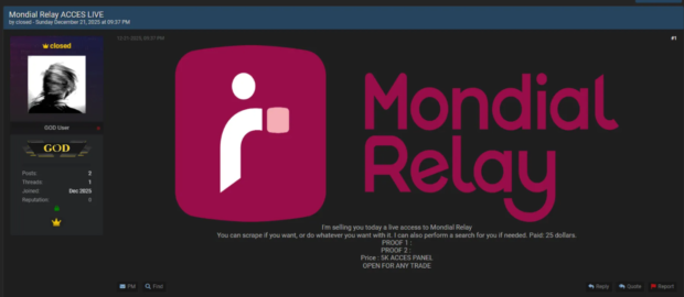 En pleine période des fêtes, alors que des millions de colis circulaient, Mondial Relay a subi une cyberattaque aux conséquences potentiellement lourdes pour ses clients. C’était probablement la pire période pour subir une cyberattaque. Alors que les fêtes de fin d’année battent leur plein, le géant de la livraison, Mondial Relay, a fait l’objet d’une cyberattaque massive exposant les données de tous ses clients. Comme rapporté par le média Infinity Area, des pirates informatiques ont mis la main sur une quantité titanesque d’informations privées. C’est le 21 décembre dernier que les premières fuites de données ont été aperçues sur le dark web, où les données privées des utilisateurs ont été mises en vente. C’est un accès direct qui est donné à quiconque paie pour ces informations. La totalité des utilisateurs enregistrés sur la plateforme sont concernés par la fuite, avec pour chaque utilisateur un accès à son nom et son prénom, son adresse postale complète, son numéro de téléphone et son adresse e-mail. La vente en ligne des données de Mondial Relay aperçue par Infinity Area. La fuite va plus loin encore, puisqu’elle reprend également la liste exhaustive des commandes faites par une personne et un accès direct aux interfaces de gestion des livraisons de Mondial Relay. Cela signifie que, par exemple, un pirate pourrait tenter d’intercepter un colis ou de détourner une livraison. Il aura fallu que la Noël passe, soit le 27 décembre, pour que Mondial Relay réagisse enfin au micro de Franceinfo, six jours après la première fuite. “Aucune donnée bancaire, mot de passe utilisateur ou information de paiement”, rassure la plateforme. “L’analyse complète de l’incident est toujours en cours. Il a été repéré grâce aux dispositifs de surveillance de Mondial Relay. Les données personnelles n’étaient plus exposées le 23 décembre au soir.” Qu’à cela ne tienne, cela aura suffit pour que le 28 décembre, des millions d’utilisateurs reçoivent des mails de phishing au nom de Mondial Relay.