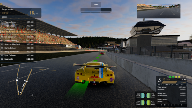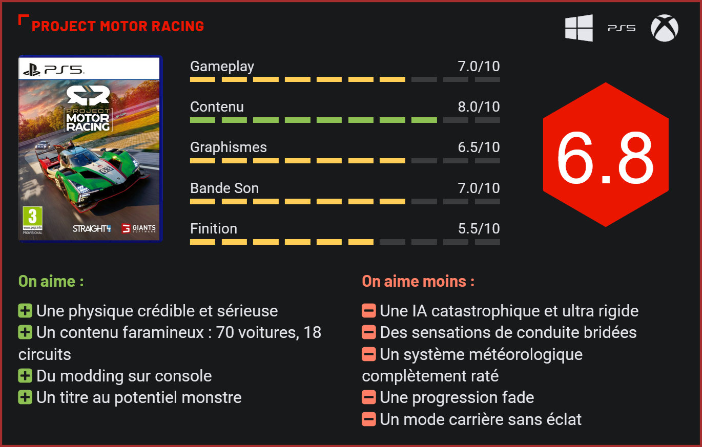 Project Motor Racing est la nouvelle tentative ambitieuse de Straight4 et GIANTS Software pour s’imposer dans le monde exigeant de la simulation automobile, un terrain déjà largement dominé par quelques références bien installées. On ne compte plus les simulations automobiles qui tentent de devenir la nouvelle référence sur PC et consoles. Niveau réalisme pur, la série Forza Motorsport fait office de référence, avec huit épisodes tous aussi réussis les uns que les autres. Mais Forza, c’est un contenu énorme, un gameplay aux petits oignons et des sensations de conduite inégalables. Difficile de rivaliser avec ça, mais c’est probablement l’ambition du petit studio Straight4 qui, accompagné de GIANTS Software (les papas de Farming Simulator), se lancent dans l’aventure Project Motor Racing (PMR). Une aventure pleine d’ambition donc, pour un titre qui veut bien faire. L’intention est là : offrir un jeu accessible mais qui requiert du joueur une attention de chaque instant et un contrôle de son véhicule total. Ce n’est, certes, pas une mince affaire, mais le jeu fait tout pour vous y aider. En revanche, et c’est là que le bât blesse, il le fait peut-être de manière maladroite. Ce qu’on attend d’une simulation automobile réaliste est clair. Que le joueur doive calculer avec une précision extrême le tracé de la piste, qu’il maîtrise le freinage comme si sa vie en dépendait et qu’il sache profiter de l’adhérence pour enchaîner les virages sans finir dans les graviers. Ces mécaniques, PMR semble les avoir bien intégrées, sans jamais parvenir à trouver sa propre identité, là où un Forza ou un Assetto Corsa Competizione sont aujourd’hui bien ancré dans le milieu. Projet Motor Racing veut trop en faire, quitte parfois à s’éparpiller et à ne pas aller suffisamment dans les fondamentaux : à savoir faire ressentir la vibration et le ronronnement du moteur jusque dans la manette du joueur. Oui, il est en train de pleuvoir. On se retrouve avec un gameplay parfois trop encadré, manquant de cette part d’instinct ou d’imprévisibilité. Malgré un moteur physique appelé Hadron qui utilise de véritables données fournies par des pilotes pro et donnant à chaque véhicule une identité propre, PMR reste retenu, comme si le comportement des véhicules était filtré, voire bridé par un moteur trop “prudent”. D’autant que le titre ne profite pas des capacités de la DualSense de la PS5 et des vibrations évoluées. Ce ressenti se ressent davantage encore volant en mains, voire varie en fonction des véhicules. Sur les voitures GT3/GT4, le retour de force est trop mou, tandis que le ressenti est bien meilleur avec des véhicules plus légers et donc plus maniable. Néanmoins, il est important de saluer le travail impressionnant réalisé par les équipes de Straight4 sur la physique. Certes, tout n’est pas parfait, mais l’on se retrouve avec un titre à la physique crédible et sérieuse, donnant à la conduite une cohérence rare. Les transferts de charge, les freinages tardifs ou encore la gestion du grip, tous sont restitués avec rigueur et implique le joueur un maximum dans la gestion de sa vitesse. On n’est pas sur une physique à la Assetto Corsa ou à la Forza, mais elle promet pour l’avenir si suite il y a. Un autre aspect du gameplay nous a beaucoup chiffonnés, c’est l’IA. C’est presque même le plus gros point noir du titre tant elle est aux fraises. Les véhicules adverses gérés par l’intelligence artificielle donnent l’impression d’être sur des rails, incapables d’adapter leur trajectoire à la situation. Les bots n’hésitent d’ailleurs pas à rentrer dans le joueur si celui-ci se trouve sur leur chemin et ne s’en écartent pas. Résultat : on se retrouve avec des collisions trop fréquentes, injustes et rarement sanctionnées. Le plaisir de jeu s’en voit fortement perturbé, transformant les courses en enchaînement de frustrations. PMR donne l’impression de revenir vingt ans en arrière sur ce point. Les sensations ne sont pas incroyables, mais l’envie des développeurs est bien présente. A l’IA catastrophique et aux sensations bridées viennent s’ajouter un système météorologique, lui aussi, daté. Les développeurs se sont en effet reposés sur le système True2Track, offrant une météo dynamique qui modifie l’adhérence et la surface en temps réel. Mais dans les faits, c’est plutôt à une vraie déception que l’on a à faire, avec une pluie peu réaliste, des flaques qui pop-up subitement et des transitions entre les différents temps brutales. Pire encore, parfois, la voiture donne l’impression de patiner alors que la piste semble sèche, ou inversement, bridant totalement l’immersion. Visuellement, on se retrouve avec un moteur de jeu qui est propre et qui offre des performances stables. C’est toutefois le même que pour Farming Simulator, ce qui ne le rend pas nécessairement adapté à une simulation moderne de cette envergure. Les ciels sont neutres et la lumière ne crée aucun relief ni cette “patine” si agréable lorsque l’on pilote une Porsche sur un circuit à la tombée du jour. Niveau contenu, Projet Motor Racing ne s’en sort pas trop mal bien que, là aussi, ce soit imparfait. Le titre propose différents modes solo et multijoueur, allant de la carrière à des événements eSports ou de classements. La proposition est solide, bien qu’elle manque à ce niveau aussi de liant et finition. Intéressons-nous principalement au mode carrière, l’atout principal de PMR. Il avait tout pour être une franche réussite et pour marquer durablement le genre de la simulation automobile. Gestion des sponsors, système financier poussé, contraintes réelles du sport auto… Pourtant, dans les faits, la carrière s’apparente juste à un enchaînement sans saveur de courses, sans mise en scène ni récompenses visuelles. Au final, tou