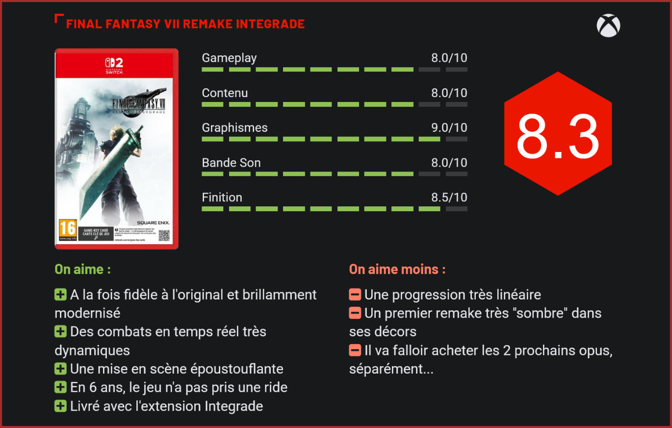 Sorti il y a près de 6 ans déjà sur PlayStation 4, le remake de Final Fantasy VII débarque enfin sur d’autres consoles. La version “Intergrade”, enrichie en contenus, sera disponible dès ce 22 janvier sur Xbox Series et Switch 2. L’occasion de se replonger dans cet excellent RPG. S’il était un titre que les joueurs Xbox et Switch jalousaient à la PS4, c’était sans l’ombre d’un doute l’excellent remake de Final Fantasy VII. L’attente aura été longue puisque les joueurs auront dû attendre presque 6 ans pour le découvrir enfin sur leur machine. En l’occurrence, la Switch 2 et la Xbox Series. Pour ceux qui l’auraient loupé, la version Intergrade comprend un nombre important d’améliorations, qu’il s’agisse d’un affichage en 4K / 60 FPS, de temps de chargement réduits, du mode photo ou d’un DLC inclus. Le jeu avait subi un joli upgrade au passage sur PS5, un an après sa sortie sur PS4. Visuellement, le jeu n’a pas pris une ride. Et malheureusement, il ne faudra pas en attendre beaucoup plus de ce portage. Pas de contenus inédits ni exclusifs au programme, pas même du côté des costumes de nos héros. Un peu de fan-service n’aurait pourtant pas fait de mal… Mais vu l’attente, les fans fermeront sans doute les yeux sans sourciller sur ce léger revers. C’est déjà un petit miracle en soi de pouvoir ENFIN y jouer sur Switch 2 et Xbox Series. Pour ceux qui auraient du mal à suivre, FF VIII Remake est donc une réinterprétation complète de Final Fantasy VII, un classique du JRPG sorti sur PS One et PC à l’époque. L’originalité vient du fait que non seulement le jeu a eu droit à une refonte graphique totale mais intègre aussi des passages inédits et surtout a été considérablement rallongé. Le jeu a d’ailleurs été divisé en 3 titres, vendus séparément. Si le second est déjà disponible sur PS5, les joueurs Xbox et Switch n’ont droit pour le moment qu’au premier. Le joueur se retrouve donc plongé au cœur d’un projet d’attentat contre l’un des réacteurs de Shinra, une gigantesque entreprise qui contrôle Midgar et ses habitants, ainsi que ceux des bidonvilles et aspire l’énergie de la planète, la Mako. Notre héros, Cloud Strife, un ancien soldat de la Shinra, vient en aide à Avalanche, un groupe écoterroriste. Une mission qu’il suit plus par intérêt financier que par engagement écologique. Après avoir fait exploser le réacteur, notre héros suit malgré lui les membres d’Avalanche dans le bidonville du secteur 7 où il revoit son amie d’enfance, Tifa. Rapidement, Cloud se voit entraîné dans de nouvelles missions d’écoattentats durant lesquelles il en apprend davantage sur les méfaits de la Shinra, de son président et de ses sbires. Fidèle à l’original tout en proposant de nouveaux passages narratifs, FF VII Remake est une réinterprétation très réussie d’un classique du JRPG. Il est également l’un des rares exemples d’un remake parfaitement réussi : à la fois fidèle à l’original, joliment remis au goût du jour, qui a pris suffisamment de libertés par rapport à l’original et qui brille dans sa direction artistique – ce qui est loin d’être un luxe en 2026. Le casting est de haute volée. Côté gameplay, le jeu évolue également avec une approche totalement différente des combats. Exit le tour par tour, pierre angulaire de la franchise, place à des combats en temps réel et sans transition. Les ennemis sont visibles sur la carte, il suffit de les approcher pour que le combat s’engage. Mais ce changement de gameplay ne fait pas totalement une croix sur la partie stratégique des affrontements au sein de FF7 puisque les joueurs doivent jongler avec plusieurs éléments pour terrasser leurs ennemis. Le nouveau mode de combat mélange en effet action et stratégie puisque le système de barre ATB (Active Time Battle) est toujours de la partie. Dans les faits, le joueur pourra réaliser des attaques physiques et basiques et pourra utiliser l’une ou l’autre attaque spéciale ou magique, voire utiliser des objets tels que des potions, antidotes ou Queue de Phénix pour faire revivre un héros. Mais pour cela, il devra attendre que la barre ATB se remplisse. Cela exige une certaine concentration et stratégie de la part du joueur, surtout lorsqu’il ne lui reste plus qu’un seul personnage en vie. Cette nouvelle organisation permet de mieux différencier les types de personnages. Chacun ayant un rôle à jouer. Évidemment, Cloud ira plutôt au contact, alors qu’Aerith se contentera de jeter des sorts de loin et de soigner ses amis. D’ailleurs, jongler entre les personnages sera un indispensable pour venir à bout de certains ennemis. Si les personnages qu’on ne contrôle pas attaquent automatiquement, leurs dégâts sont assez faibles. C’est pourquoi il est important de jongler avec tous. Les transcendances sont toujours d’actualité et sont toujours autant grisantes. Au fur et à mesure des combats, une barre de transe se remplit jusqu’à ce que la force de notre personnage décuple. Il est alors possible de lancer des attaques très puissantes. Le joueur pourra également faire appel aux invocations, autre pierre angulaire des Final Fantasy. Invoquer ces monstres magiques surpuissants qui se battront à vos côtés est toujours aussi jouissif. On notera également une barre chez les ennemis qui se remplit au fur et à mesure des attaques. Au bout d’un moment, ils passent en état de « choc » ou de fragilité. Des états qui les rendent particulièrement fragiles aux attaques et qui laissent les joueurs multiplier les attaques pour faire le plus de dégâts possible. S’il abandonne donc le tour par tour pour un système de jeu plus “occidental”, FF VII Remake brille dans son gameplay et ne perd pas toute sa profondeur tactique. On retrouve d’ailleurs une gestion d’inventaire poussée comme dans les nombreux RPG japonais